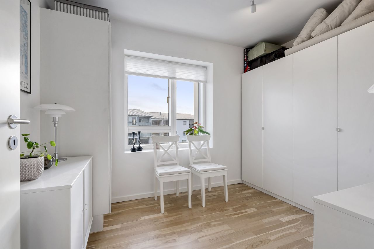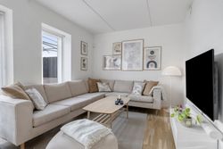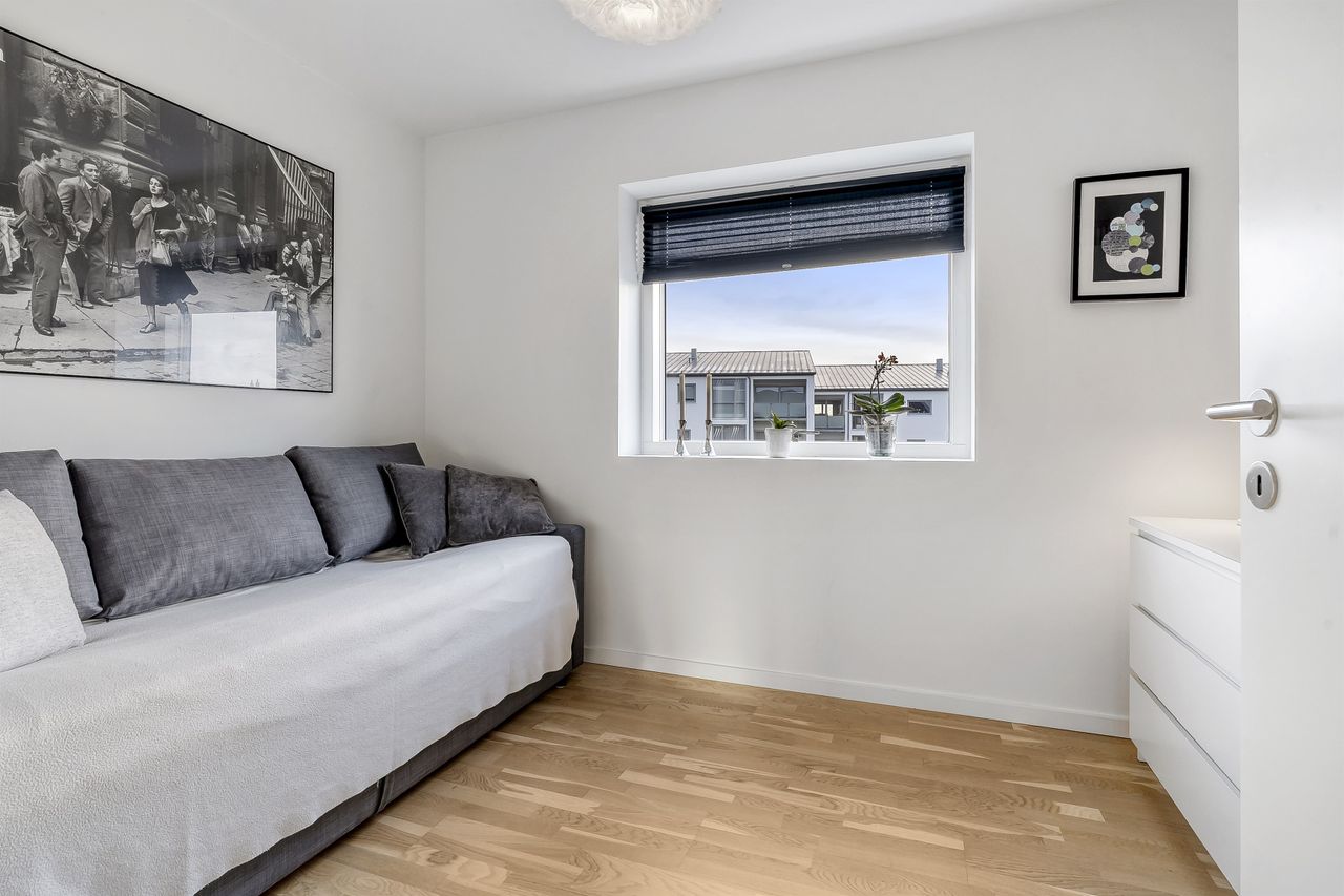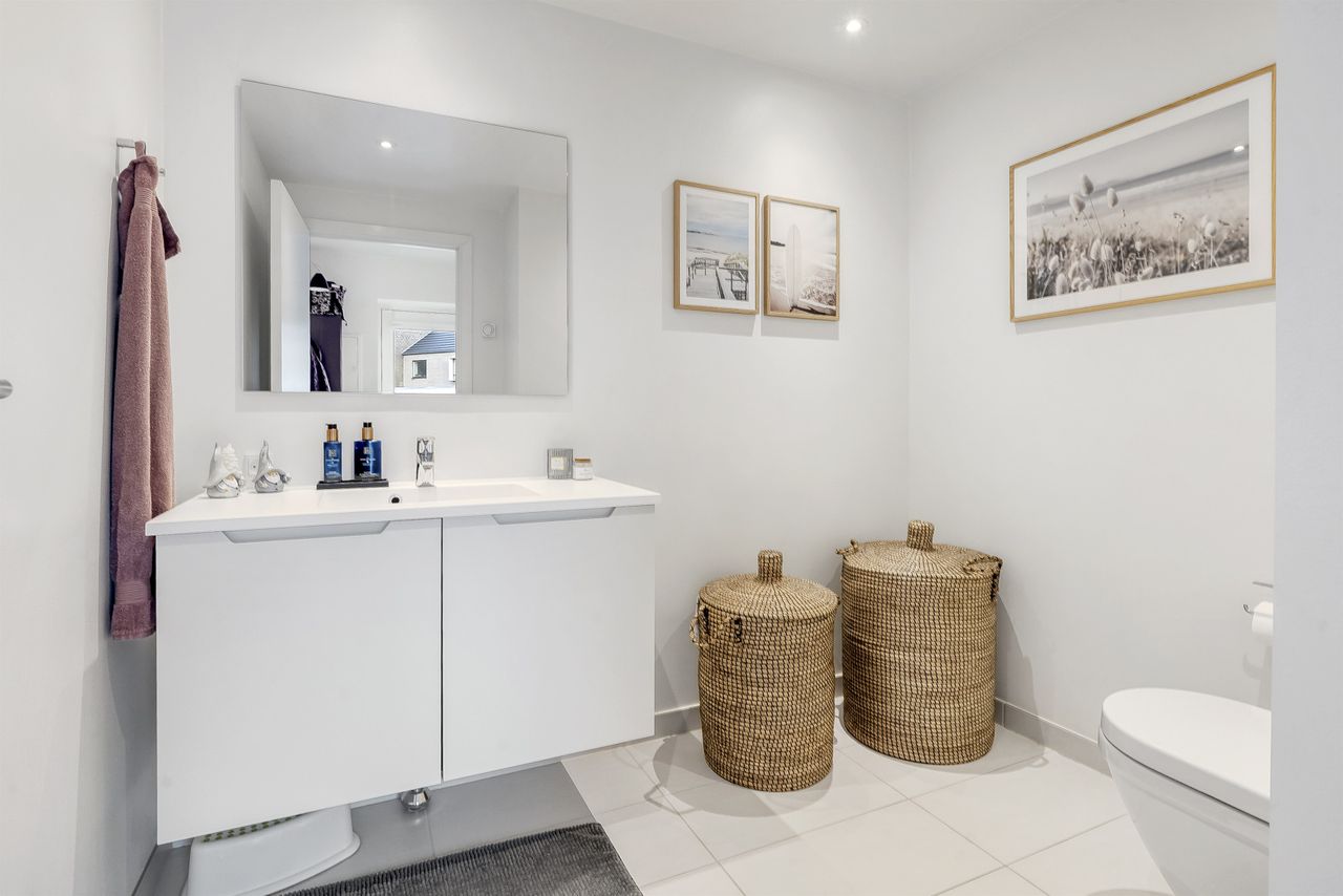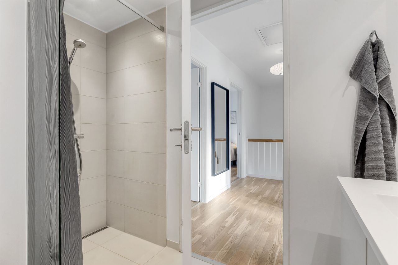 Planløsningen indeholder:Boligen rummer i alt 126 veludnyttede kvadratmeter og er indrettet med en funktionel opdeling, der passer perfekt til den moderne families hverdag. Allerede ved ankomsten mødes man af en indbydende entré med indbygget skabsvæg og gode opbevaringsløsninger. I stueplan findes desuden et nydeligt gæstetoilet samt et lyst og rummeligt køkken-alrum, der udgør hjemmets naturlige samlingspunkt. Køkkenet fremstår stilrent og funktionelt og ligger i åben forbindelse med opholdsstuen, hvilket skaber en behagelig sammenhæng mellem madlavning, samvær og afslapning. Herfra er der direkte udgang til en solrig terrasse i forhaven, mens stuen giver adgang til haven på modsatte side. På førstesalen findes en central repos/fordelingsgang, som giver adgang til boligens fire regulære værelser, alle med gode indretningsmuligheder, samt et pænt badeværelse med brus. Derudover er der adgang til loftrum, som giver ekstra opbevaringsplads.
