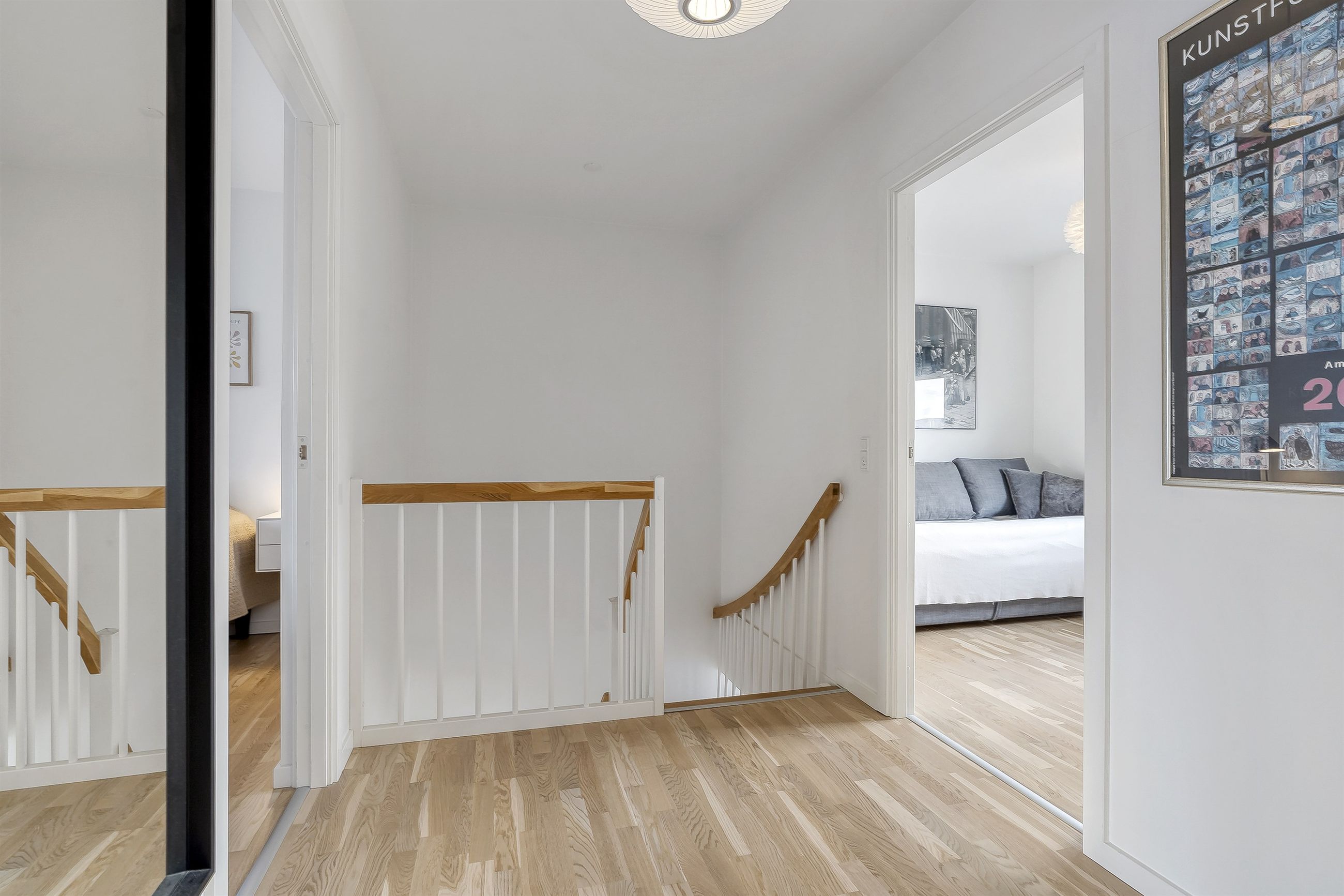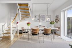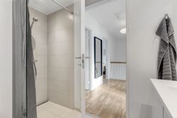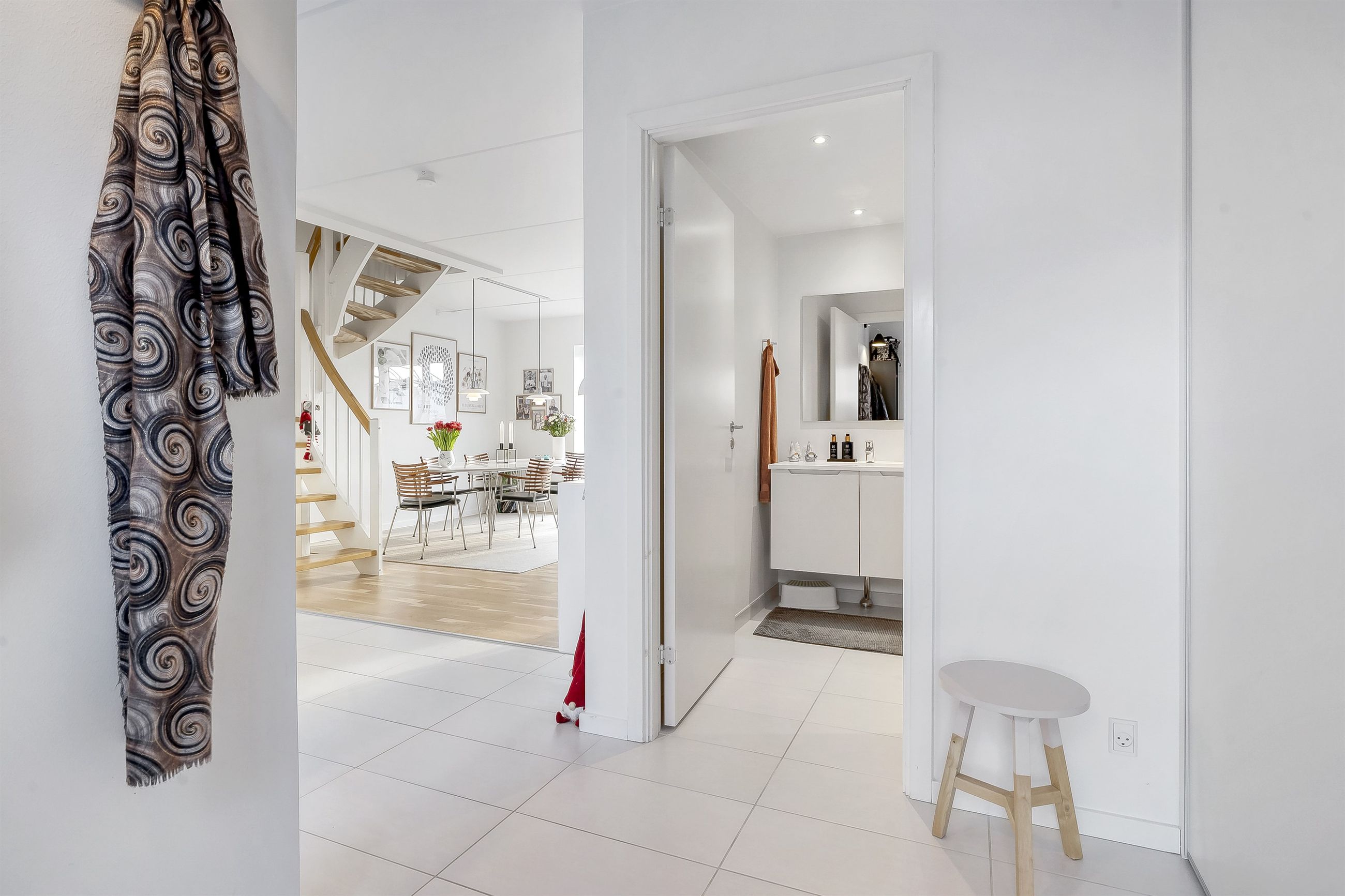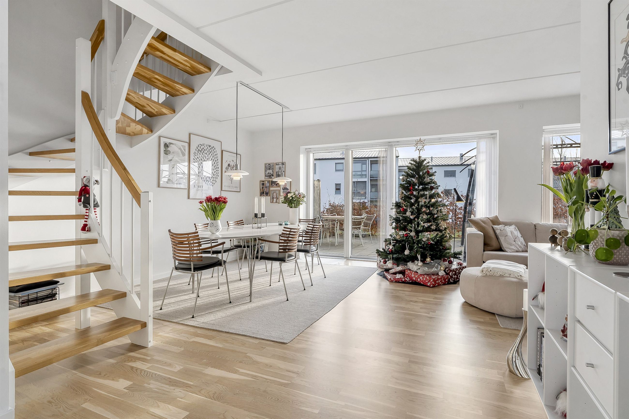 Planløsningen indeholder:Boligen rummer i alt 126 veludnyttede kvadratmeter og er indrettet med en funktionel opdeling, der passer perfekt til den moderne families hverdag. Allerede ved ankomsten mødes man af en indbydende entré med indbygget skabsvæg og gode opbevaringsløsninger. I stueplan findes desuden et nydeligt gæstetoilet samt et lyst og rummeligt køkken-alrum, der udgør hjemmets naturlige samlingspunkt. Køkkenet fremstår stilrent og funktionelt og ligger i åben forbindelse med opholdsstuen, hvilket skaber en behagelig sammenhæng mellem madlavning, samvær og afslapning. Herfra er der direkte udgang til en solrig terrasse i forhaven, mens stuen giver adgang til haven på modsatte side. På førstesalen findes en central repos/fordelingsgang, som giver adgang til boligens fire regulære værelser, alle med gode indretningsmuligheder, samt et pænt badeværelse med brus. Derudover er der adgang til loftrum, som giver ekstra opbevaringsplads.