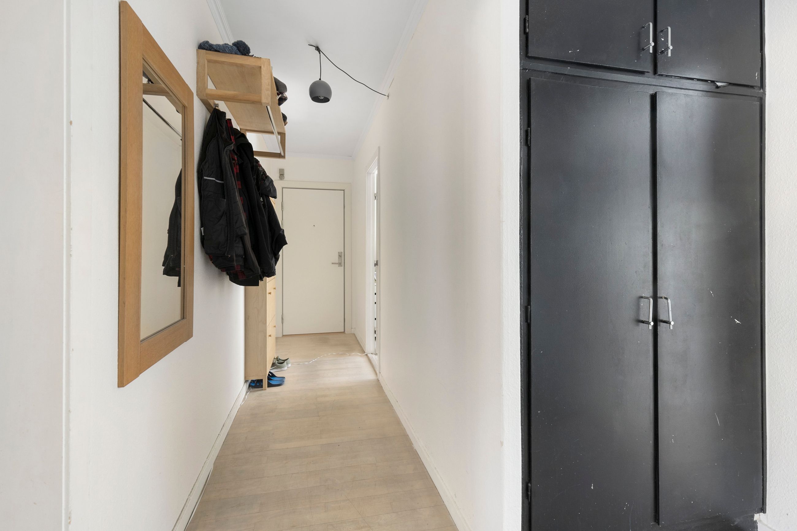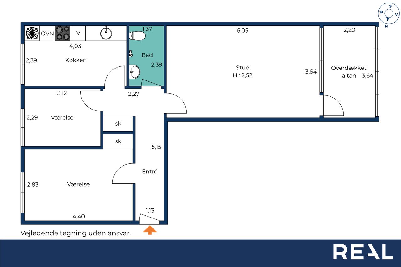 Entre med skabsplads. Stor stue med udgang til en nyere altan, som kan lukkes helt og bruges det