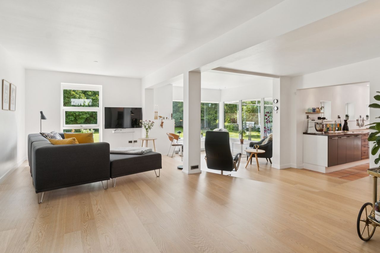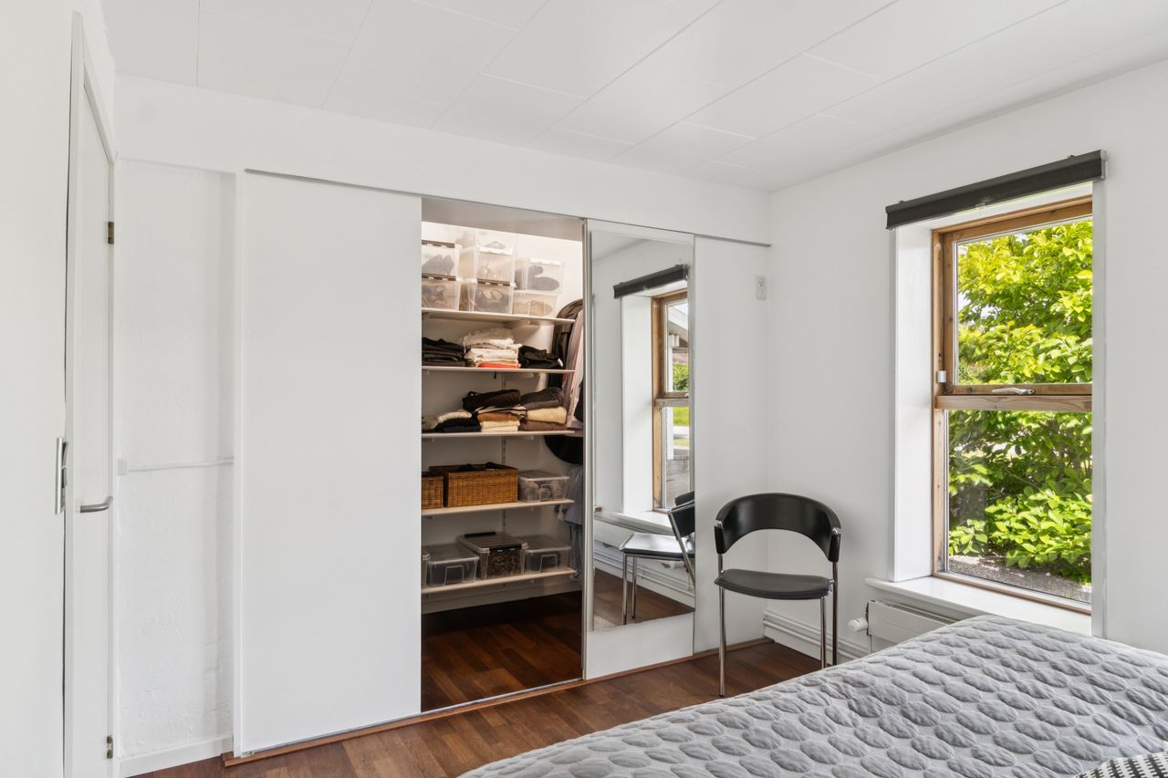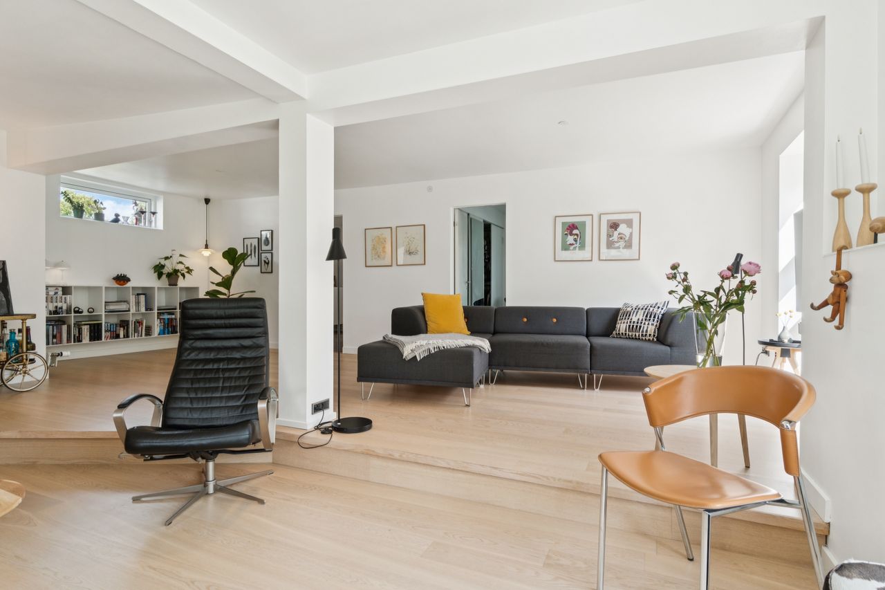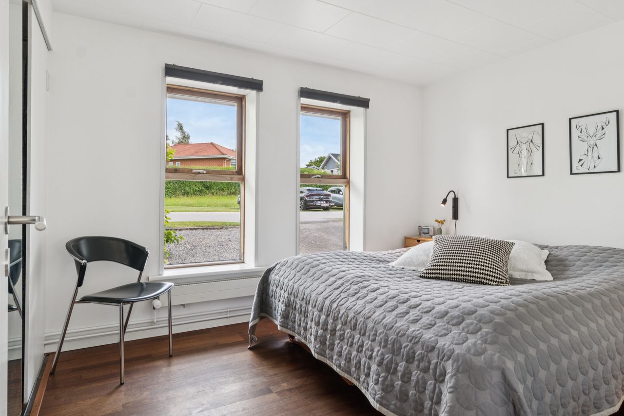 Stuen ligger i åben forbindelse med alrummet og har et flot lysindfald samt god plads til sofaarrangement. Der er mulighed for at etablere et ekstra værelse i denne del af huset, hvis behovet opstår. Herudover rummer boligen to gode soveværelser samt et lyst og stilrent badeværelse.