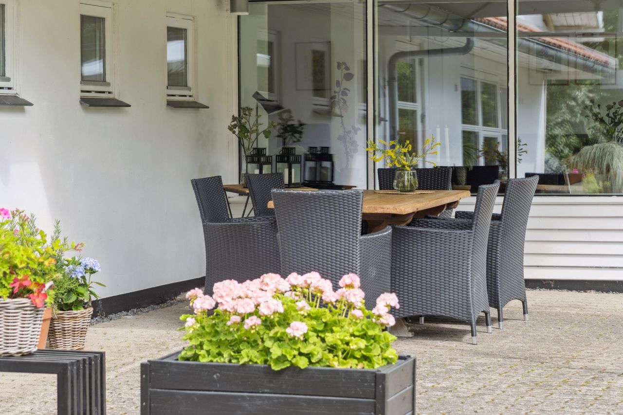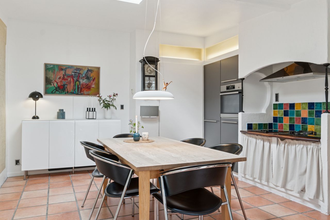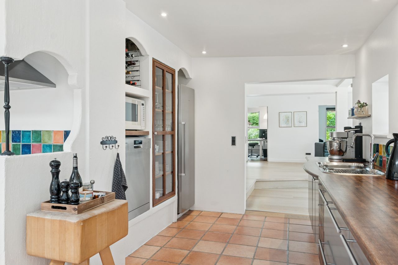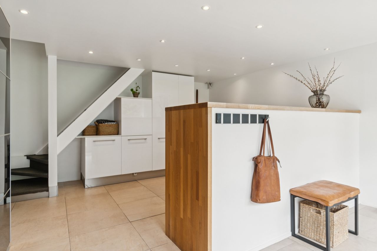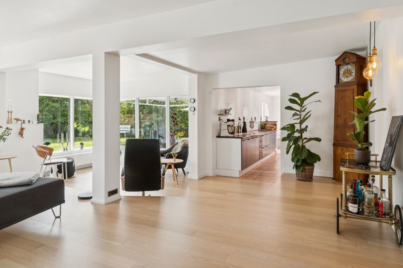 Boligen byder på en rummelig entre med bryggersfunktion og adgang til hemsen. Hjertet i huset er det store og åbne køkkenalrum med god plads til både madlavning og spiseplads. Køkkenet er velindrettet med masser af skabs- og bordplads. Herfra er der direkte udgang til terrasse og haven.