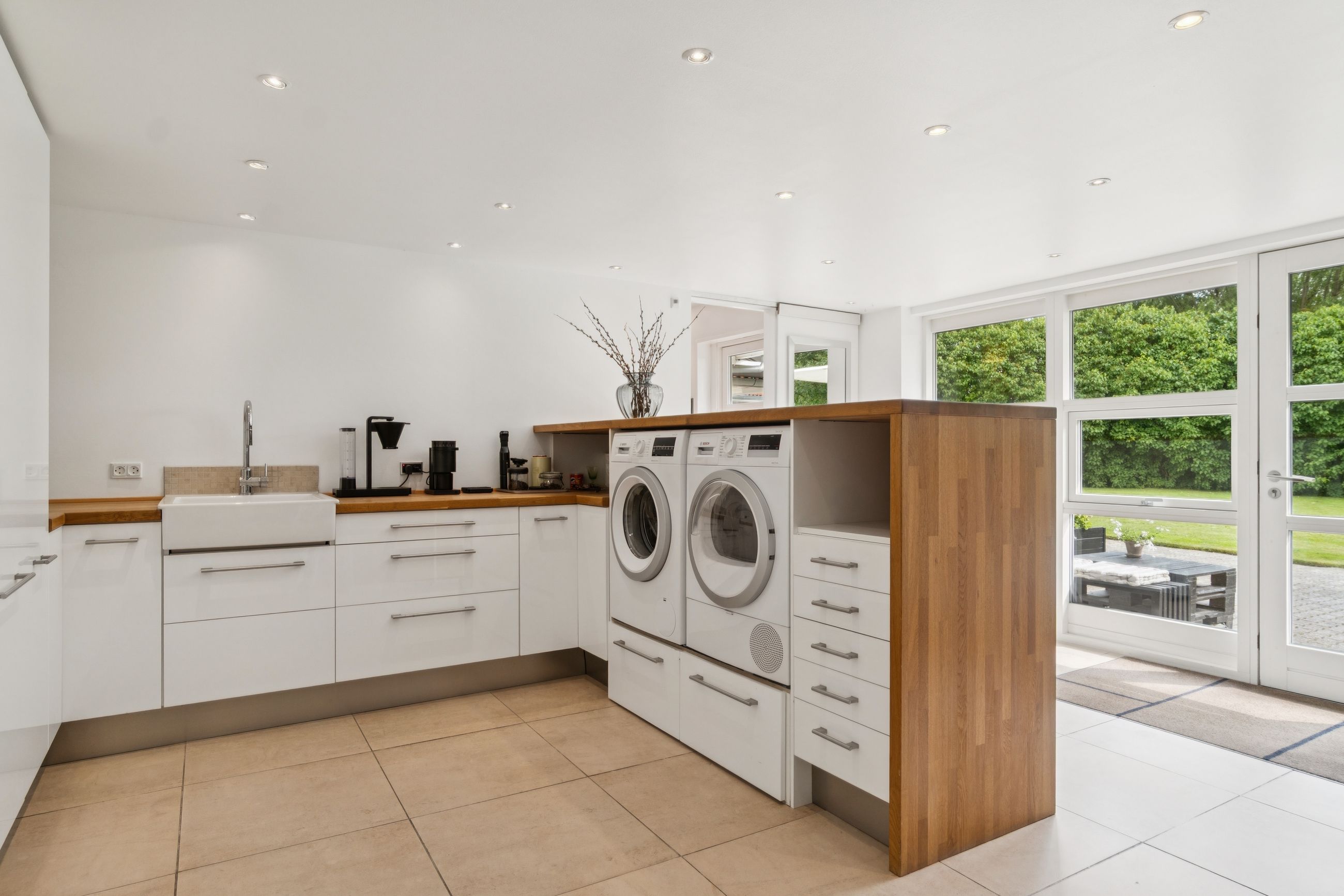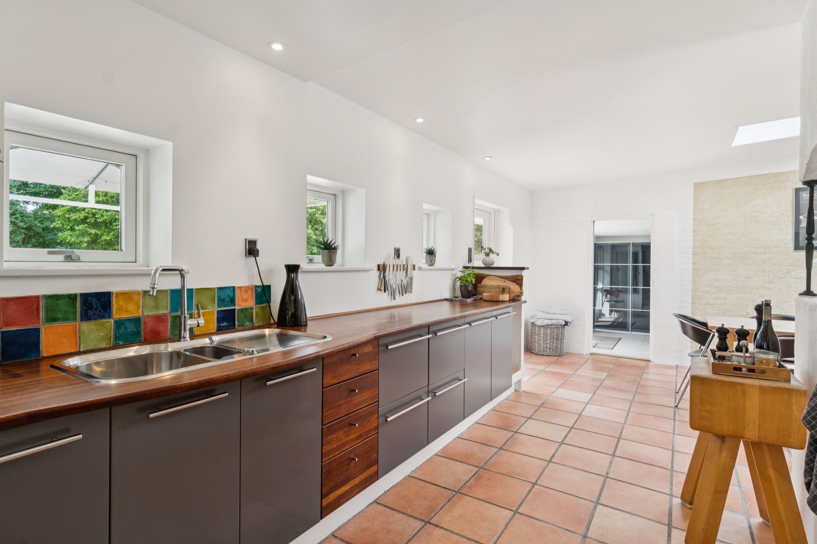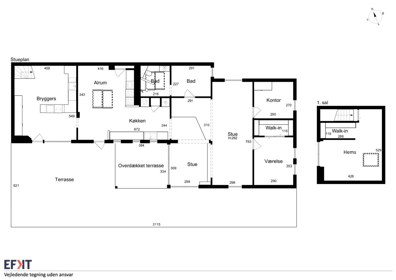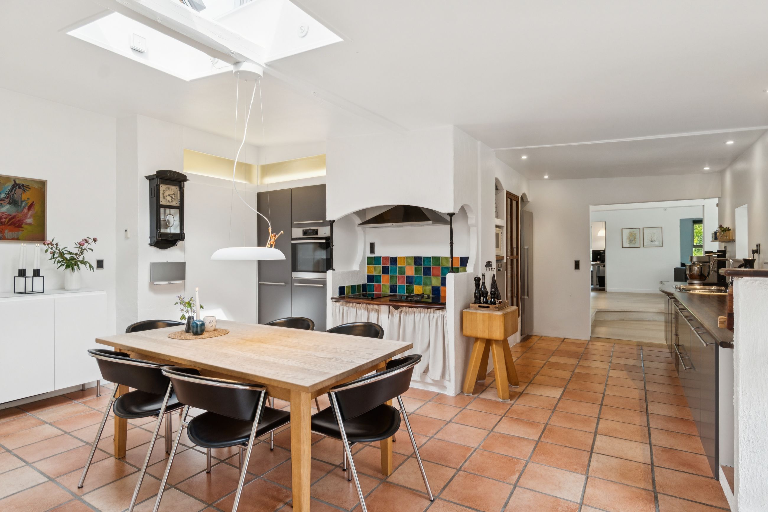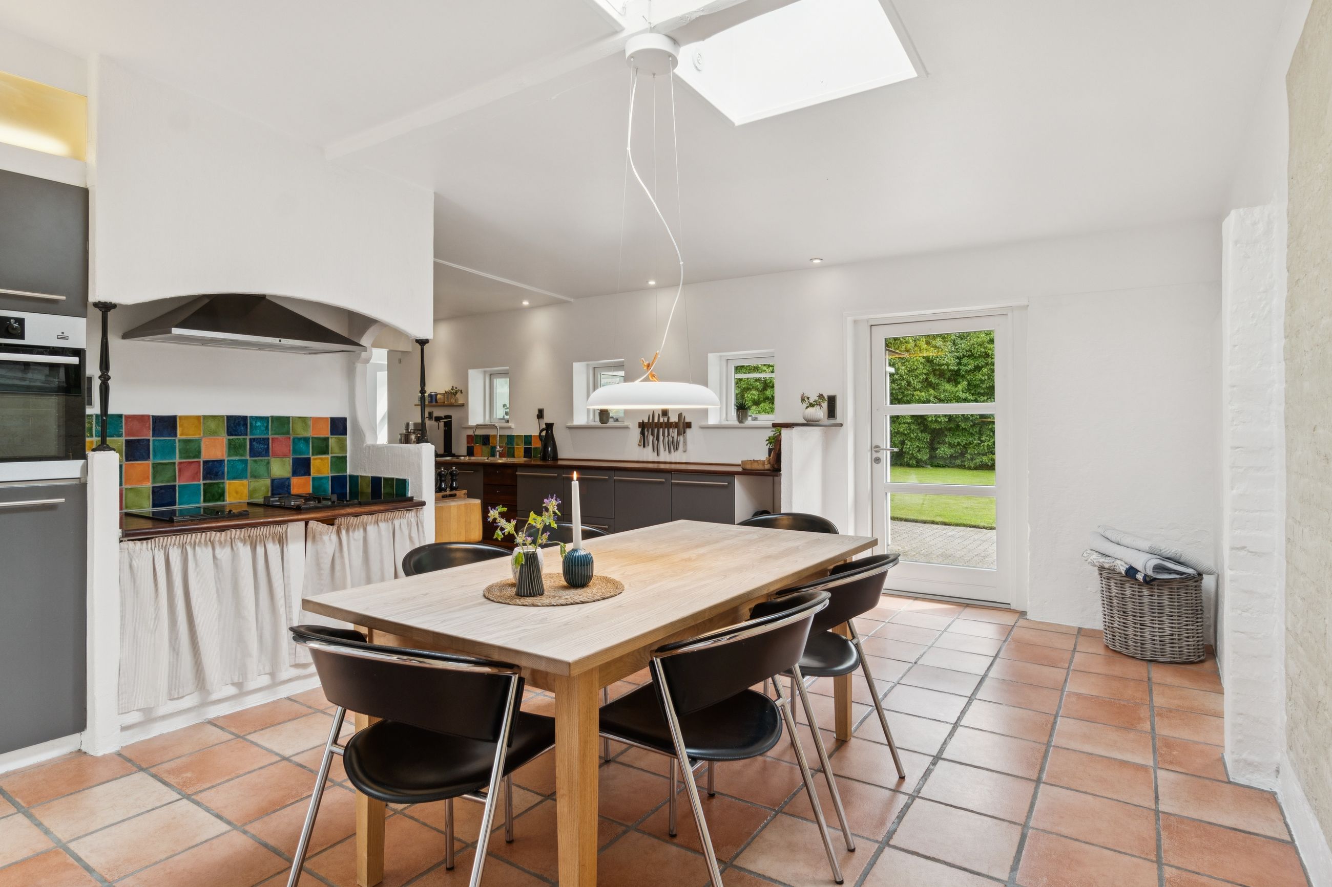 Boligen byder på en rummelig entre med bryggersfunktion og adgang til hemsen. Hjertet i huset er det store og åbne køkkenalrum med god plads til både madlavning og spiseplads. Køkkenet er velindrettet med masser af skabs- og bordplads. Herfra er der direkte udgang til terrasse og haven.