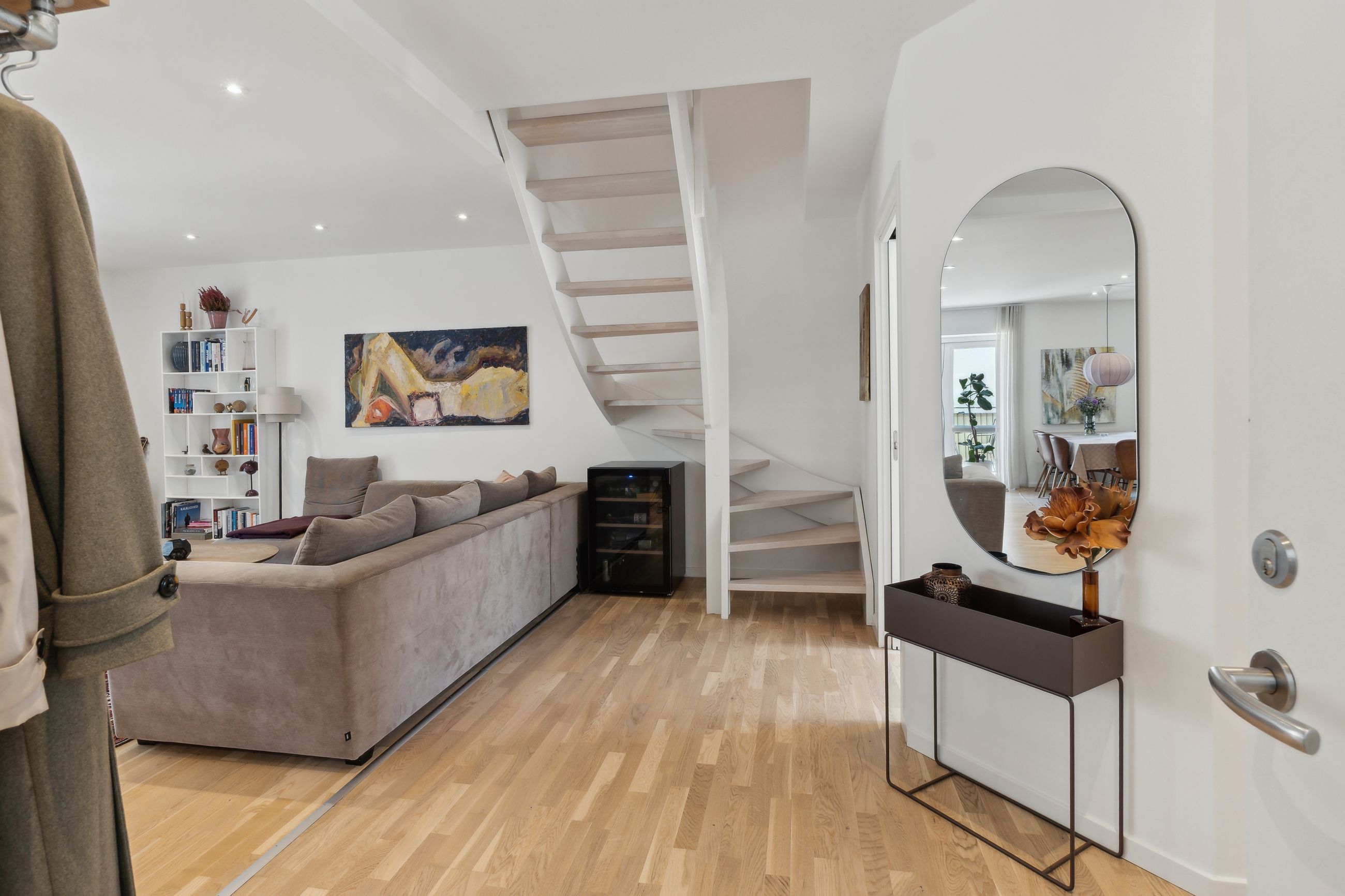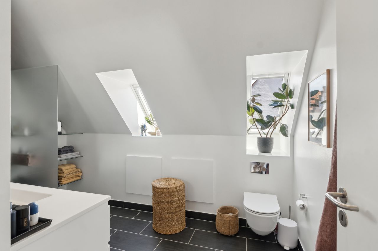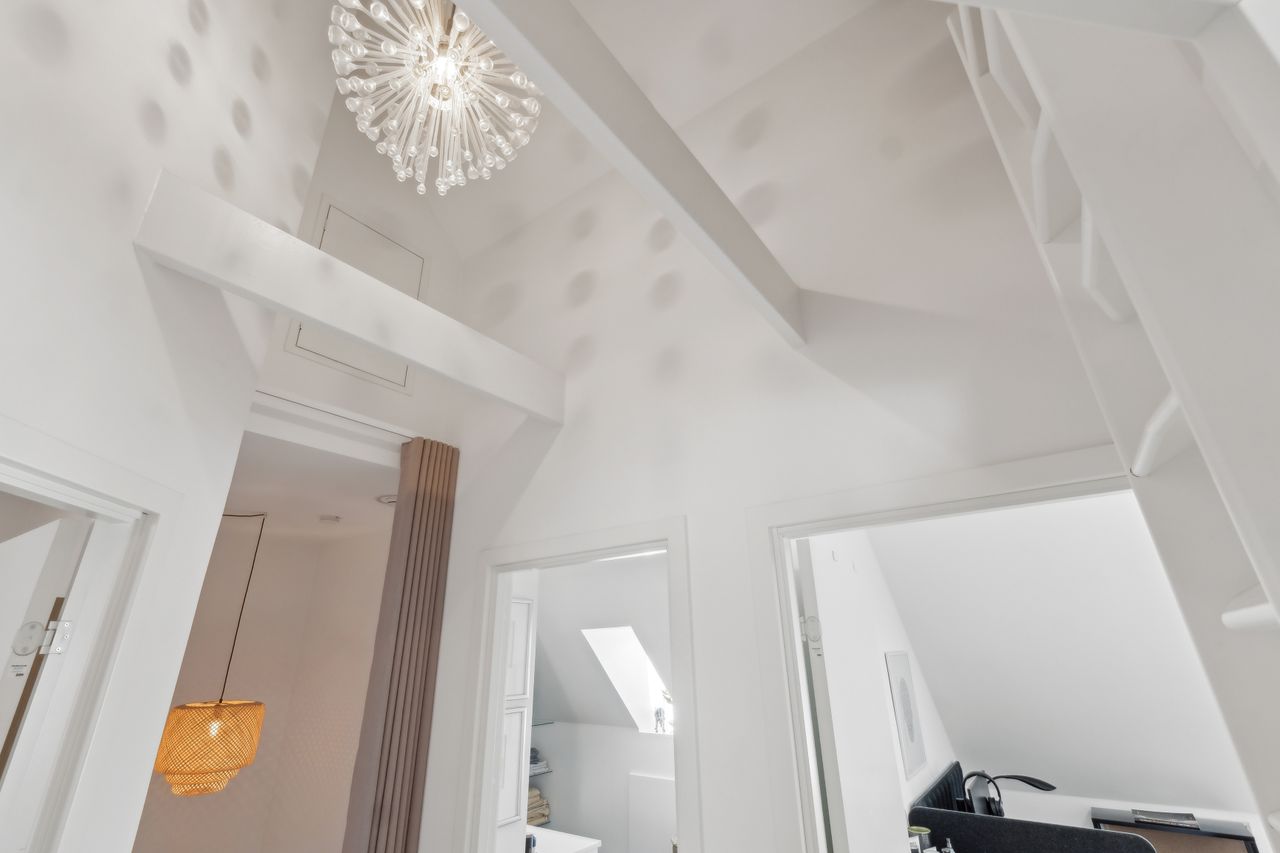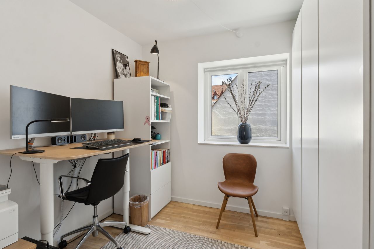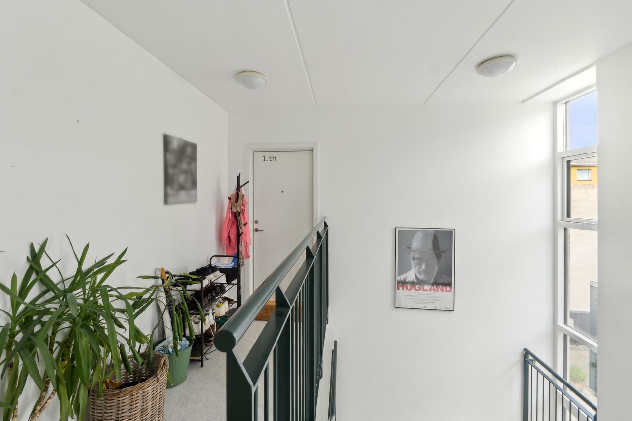 Man bydes velkommen i en lys og indbydende opgang. Entréen er rummelig og har plads til overtøjet. Lejlighedens samlingspunkt er det store og åbne køkken/stue/alrum med god plads til både spise- og opholdsafdeling. Køkkenet blev renoveret i 2023 og fremstår moderne med rigelig bord- og skabsplads. Fra alrummet er der udgang til en vestvendt altan samt trappe til boligens øverste plan. I stueplan findes desuden et godt værelse, som er velegnet til kontor eller gæsteværelse, samt et gæstetoilet med vaskefaciliteter.