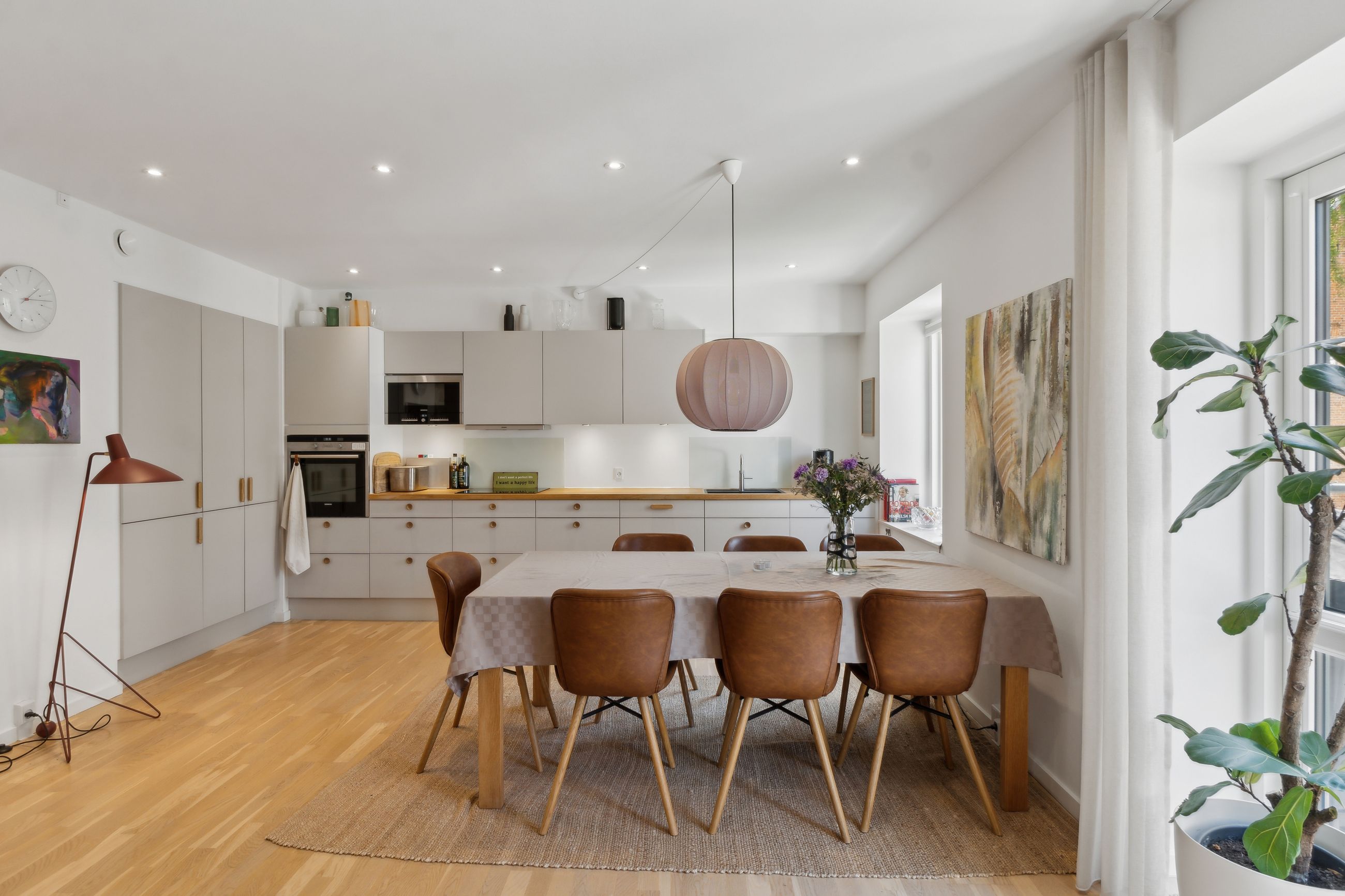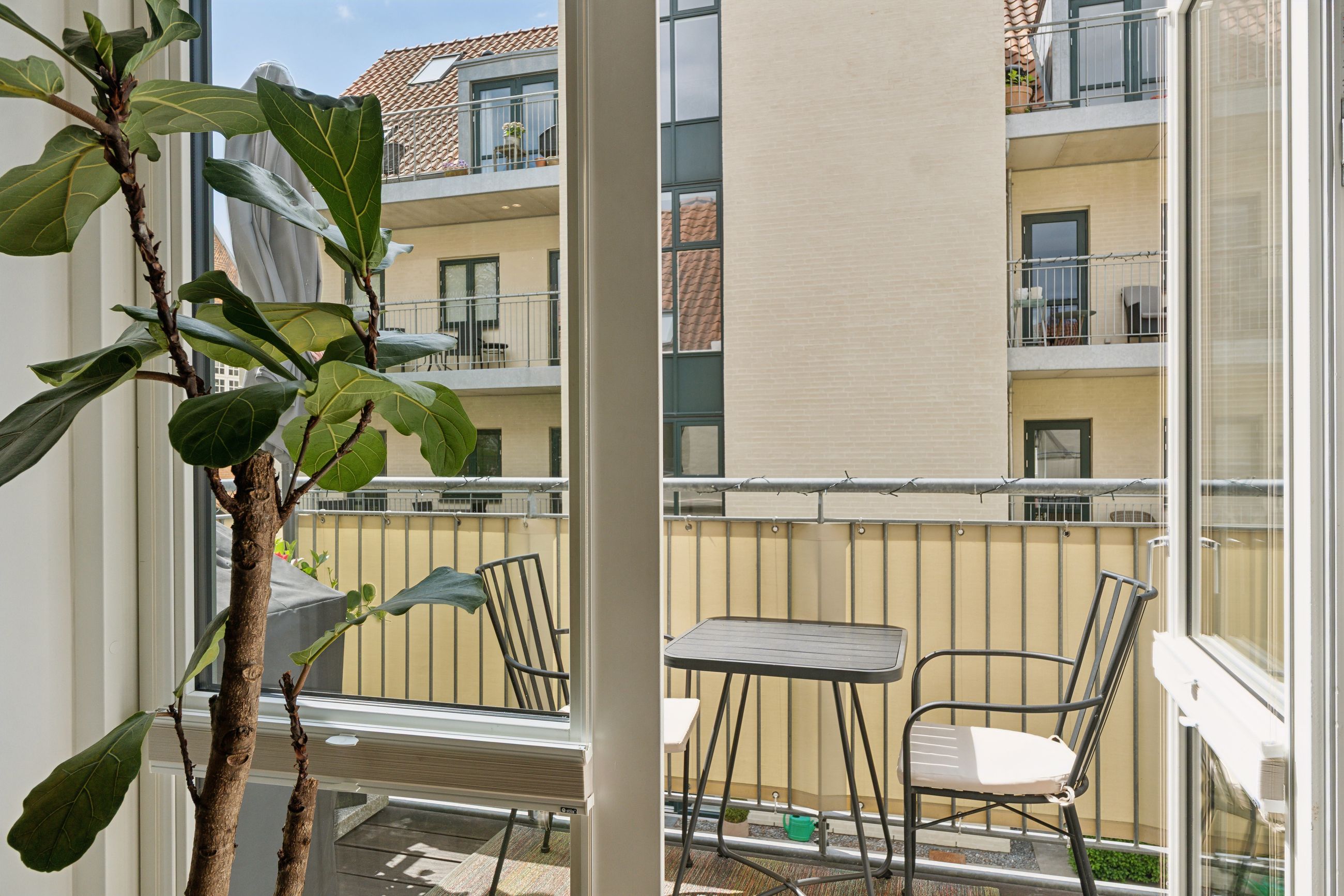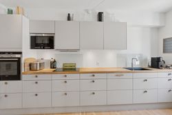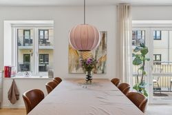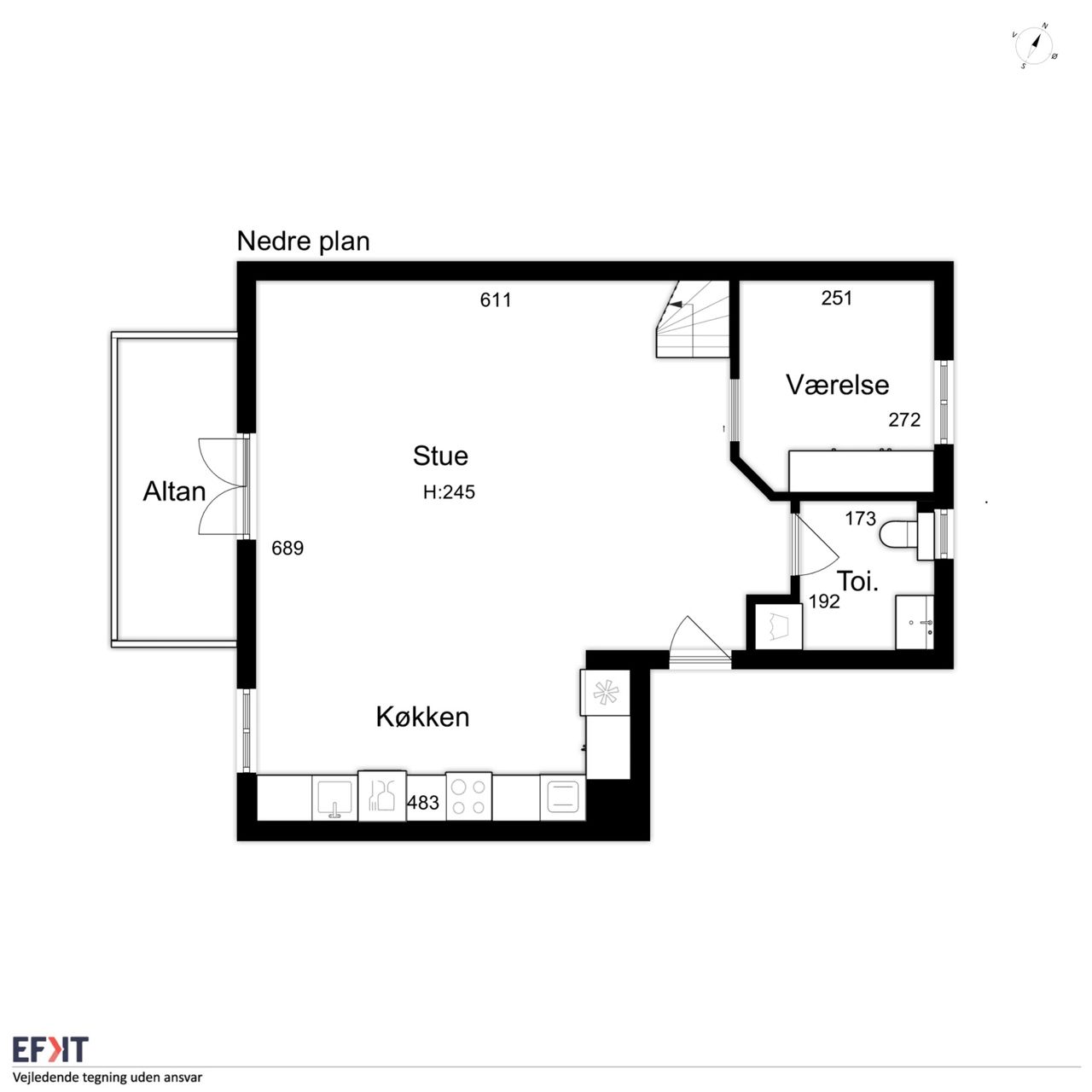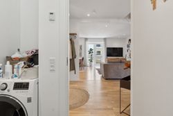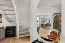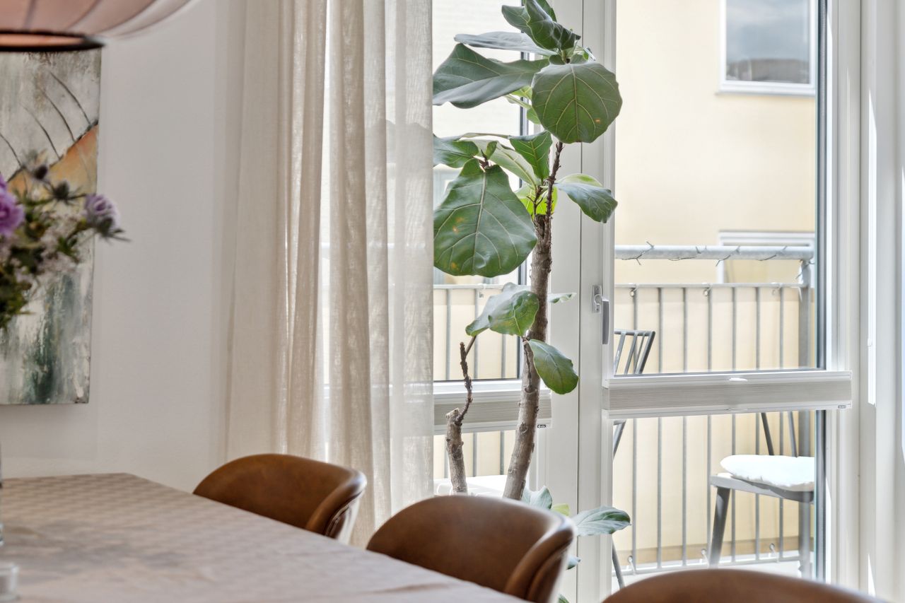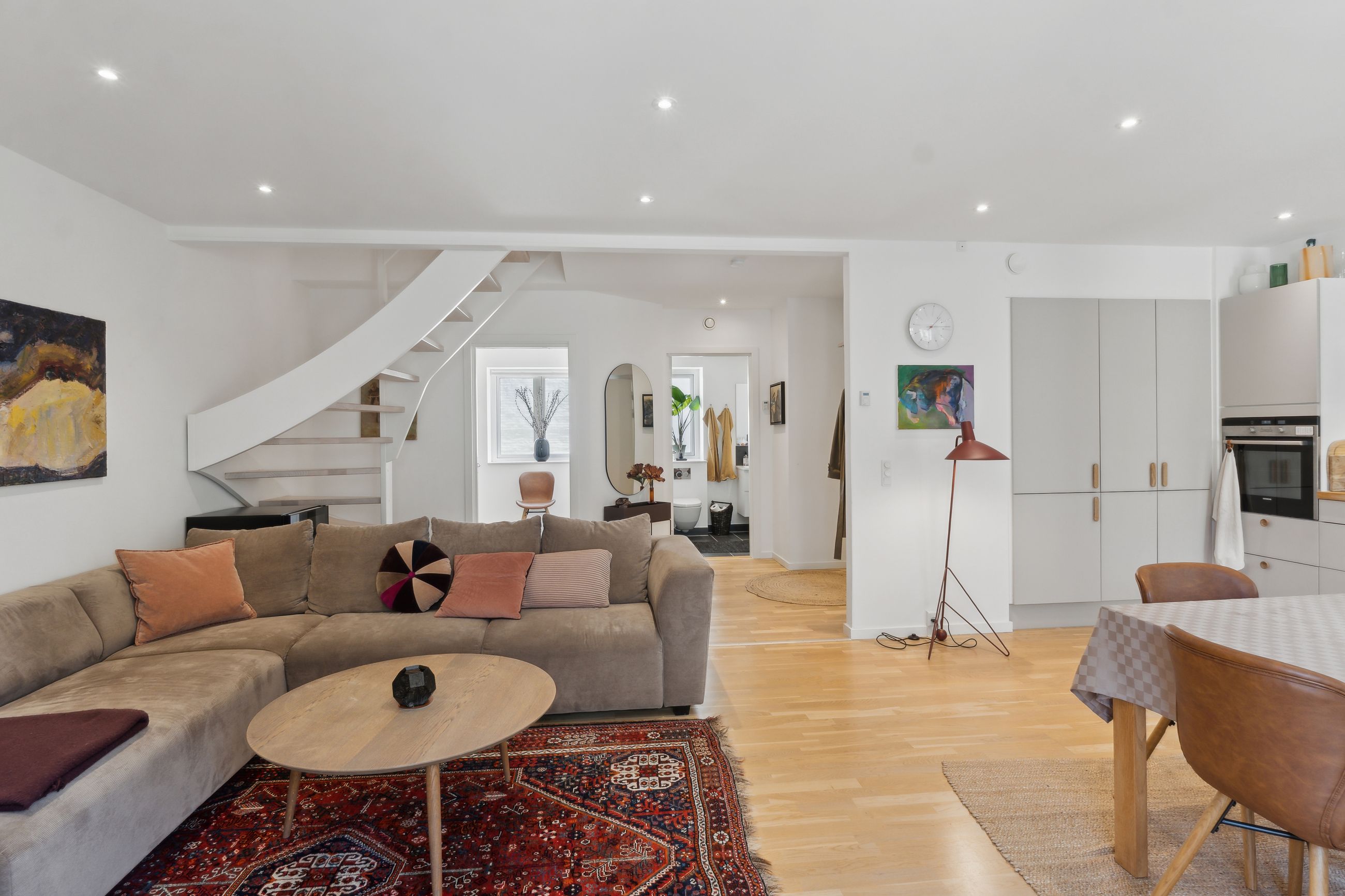 Man bydes velkommen i en lys og indbydende opgang. Entréen er rummelig og har plads til overtøjet. Lejlighedens samlingspunkt er det store og åbne køkken/stue/alrum med god plads til både spise- og opholdsafdeling. Køkkenet blev renoveret i 2023 og fremstår moderne med rigelig bord- og skabsplads. Fra alrummet er der udgang til en vestvendt altan samt trappe til boligens øverste plan. I stueplan findes desuden et godt værelse, som er velegnet til kontor eller gæsteværelse, samt et gæstetoilet med vaskefaciliteter.
