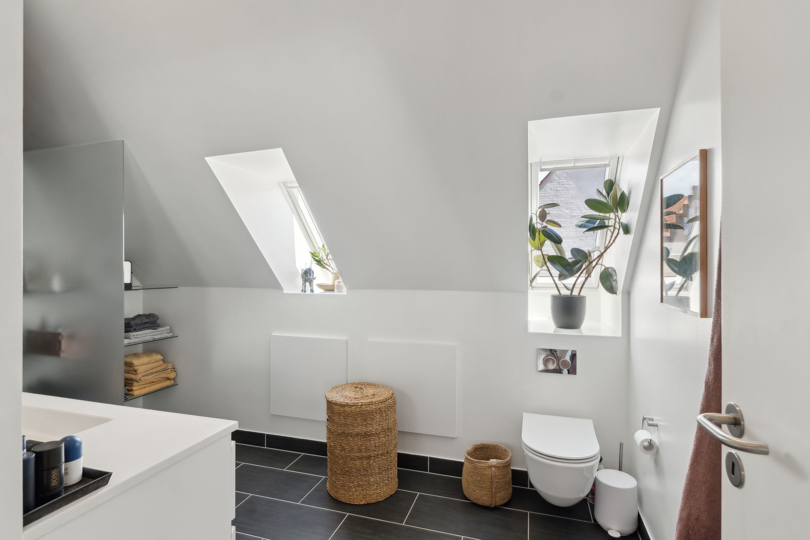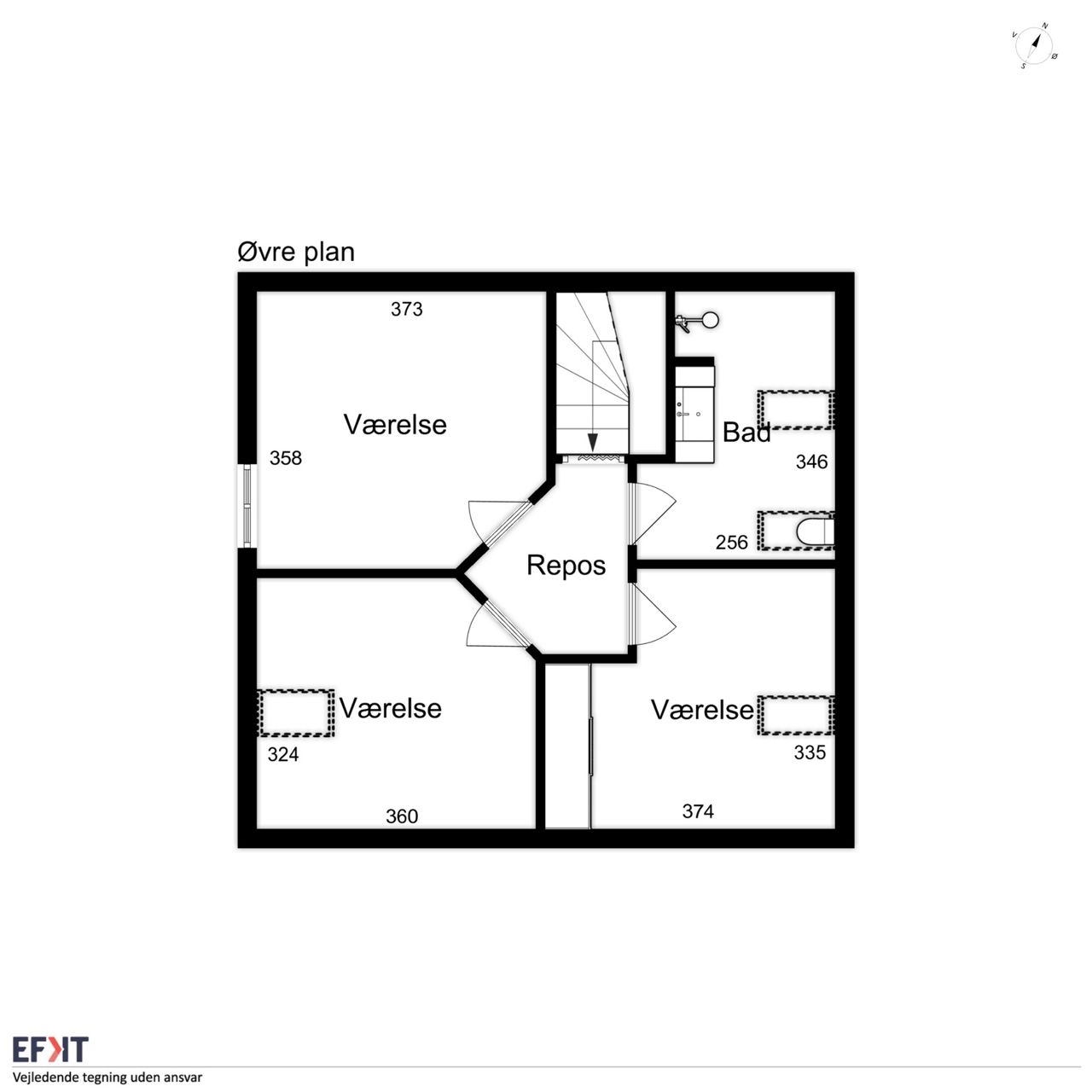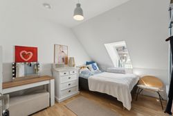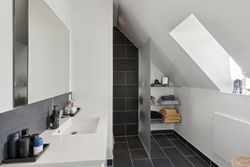 Øvre plan: Repos med trappe til en hyggelig hems og adgang til et lækkert badeværelse med brus. Herudover er der tre gode soveværelser.