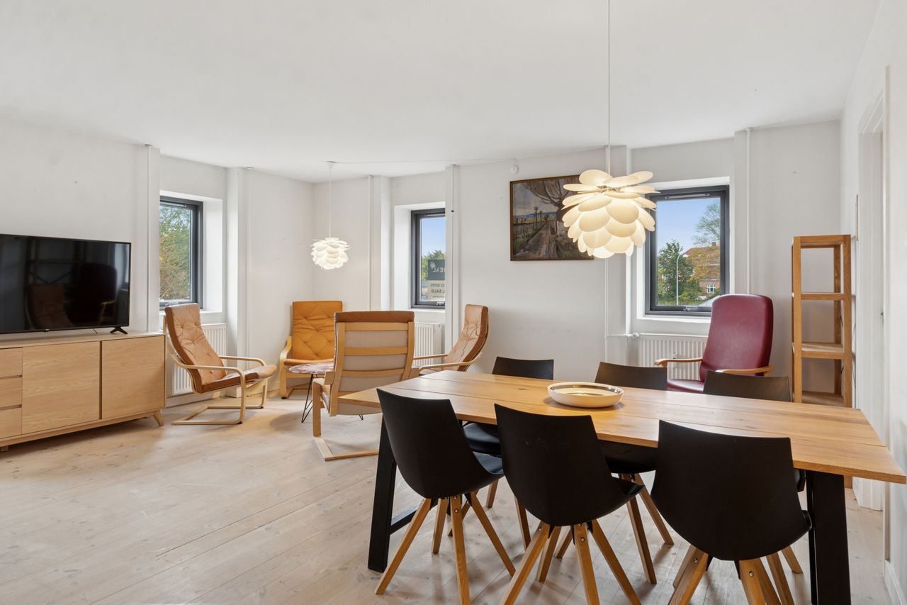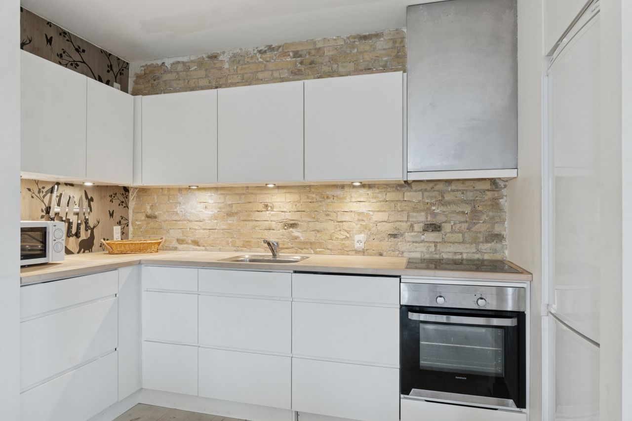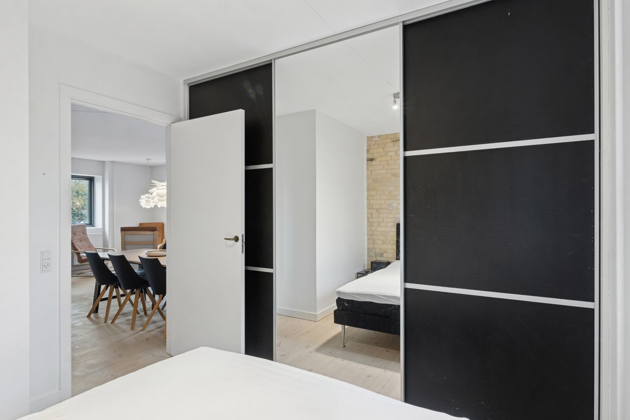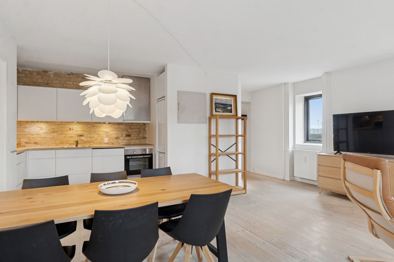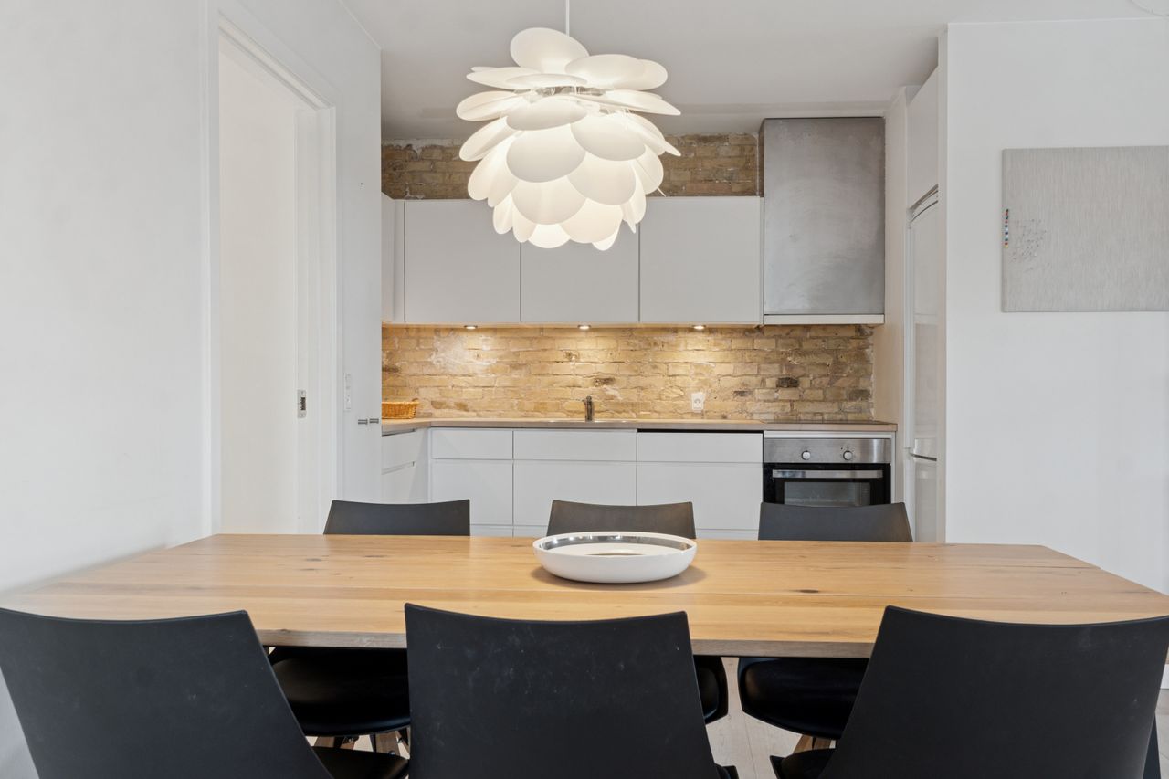 Man bydes velkommen i en flot opgang med elevator. Fra opgangen er der adgang til en møblerbar entré, der giver adgang til et pænt badeværelse med vaskesøjle og bruseniche. Den store, lyse stue er i åben forbindelse med køkkenet, som fremstår moderne med hvide elementer og en rustik, blotlagt murstensvæg, der skaber kontrast til det moderne udtryk. Stuen er så stor, at her er rigelig plads til både spise- og opholdsafdeling – du kan sågar indrette et lille ekstra værelse. Herudover rummer lejligheden to gode soveværelser.