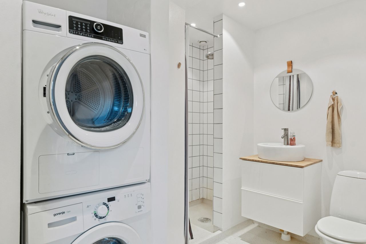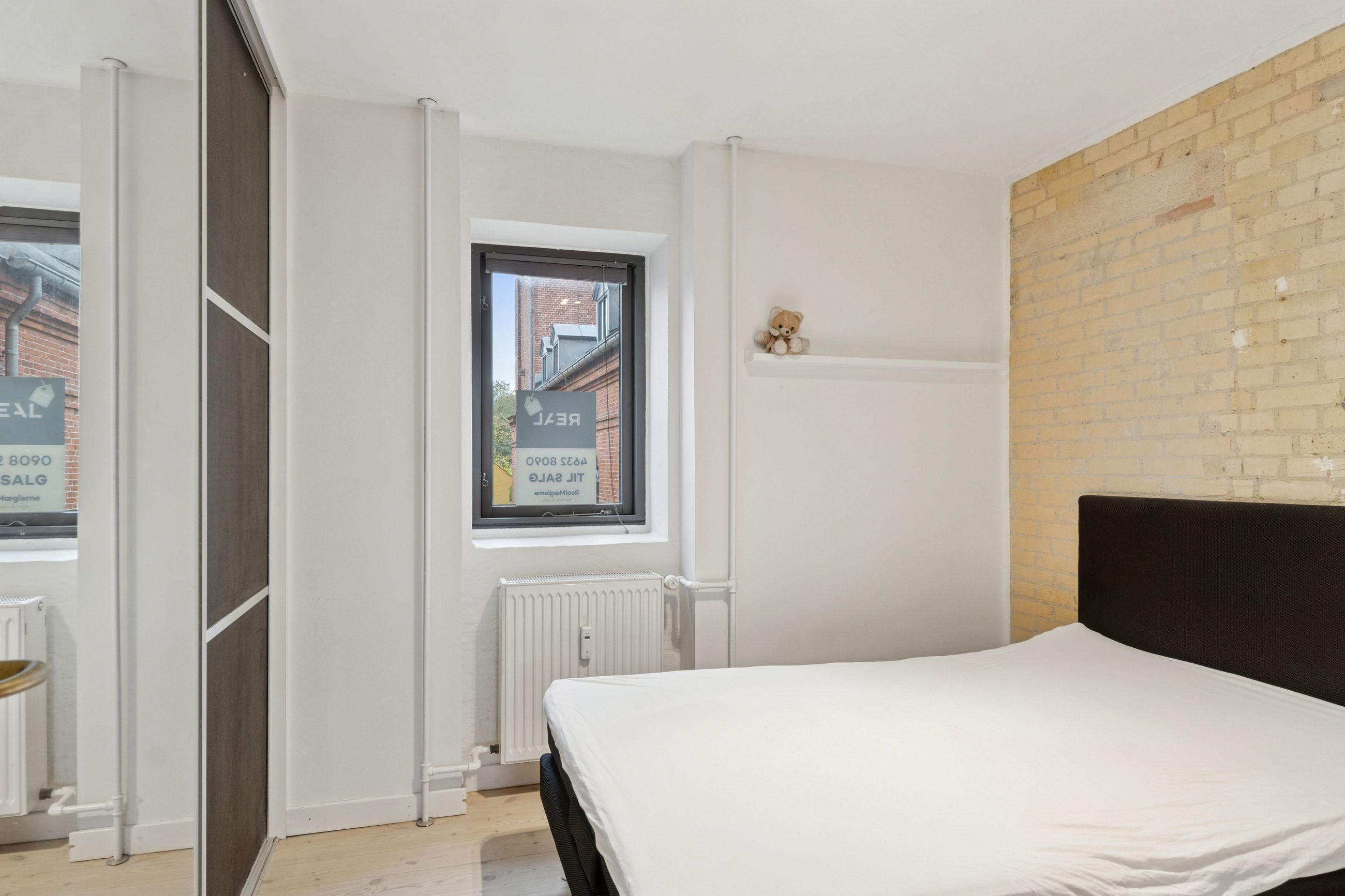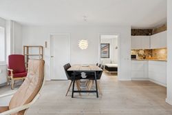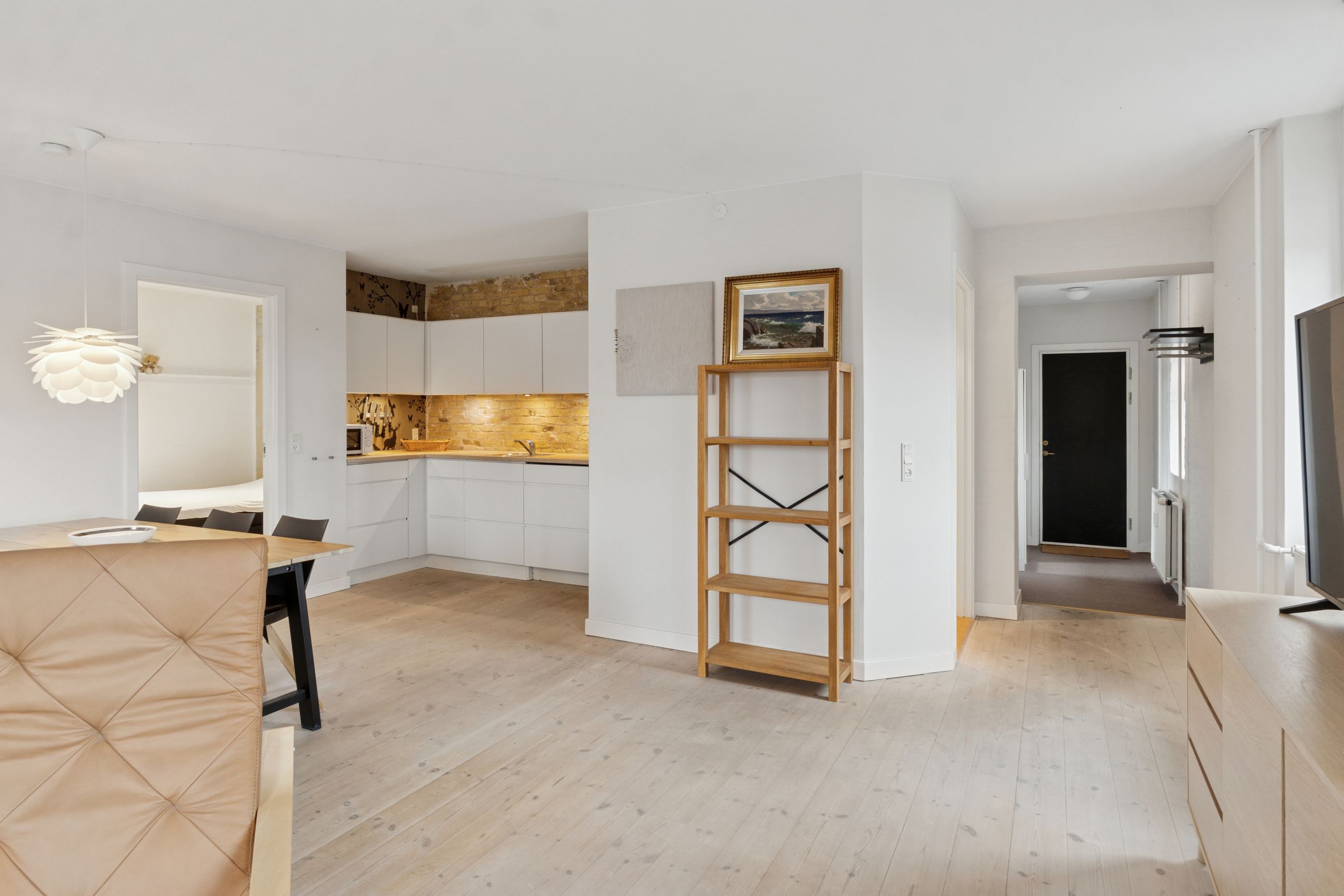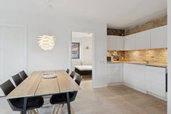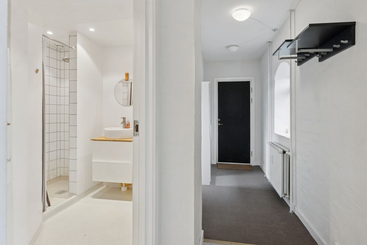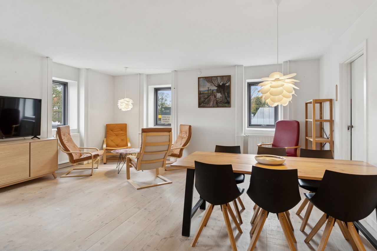 Man bydes velkommen i en flot opgang med elevator. Fra opgangen er der adgang til en møblerbar entré, der giver adgang til et pænt badeværelse med vaskesøjle og bruseniche. Den store, lyse stue er i åben forbindelse med køkkenet, som fremstår moderne med hvide elementer og en rustik, blotlagt murstensvæg, der skaber kontrast til det moderne udtryk. Stuen er så stor, at her er rigelig plads til både spise- og opholdsafdeling – du kan sågar indrette et lille ekstra værelse. Herudover rummer lejligheden to gode soveværelser.