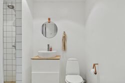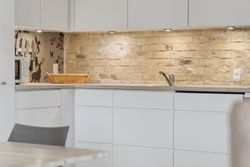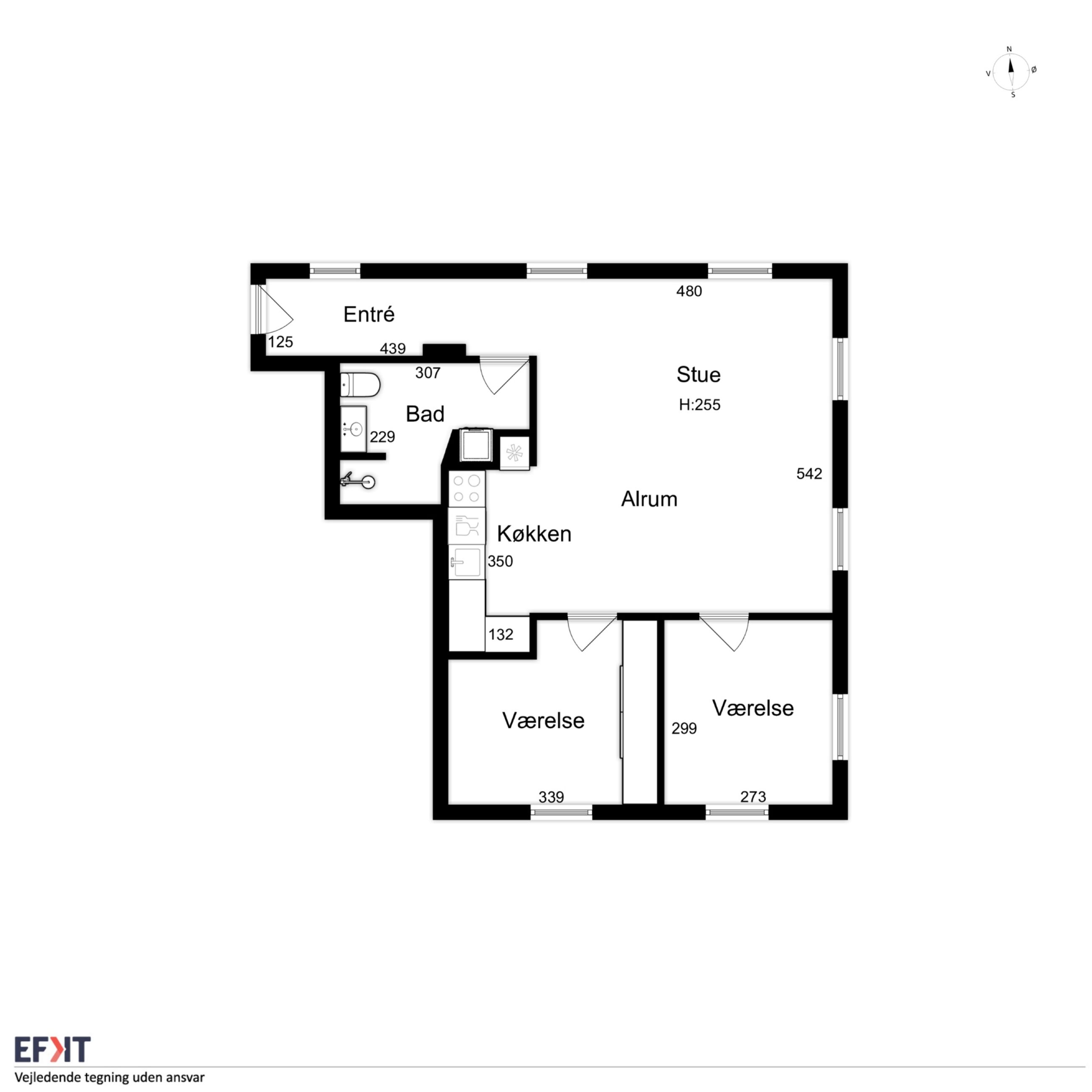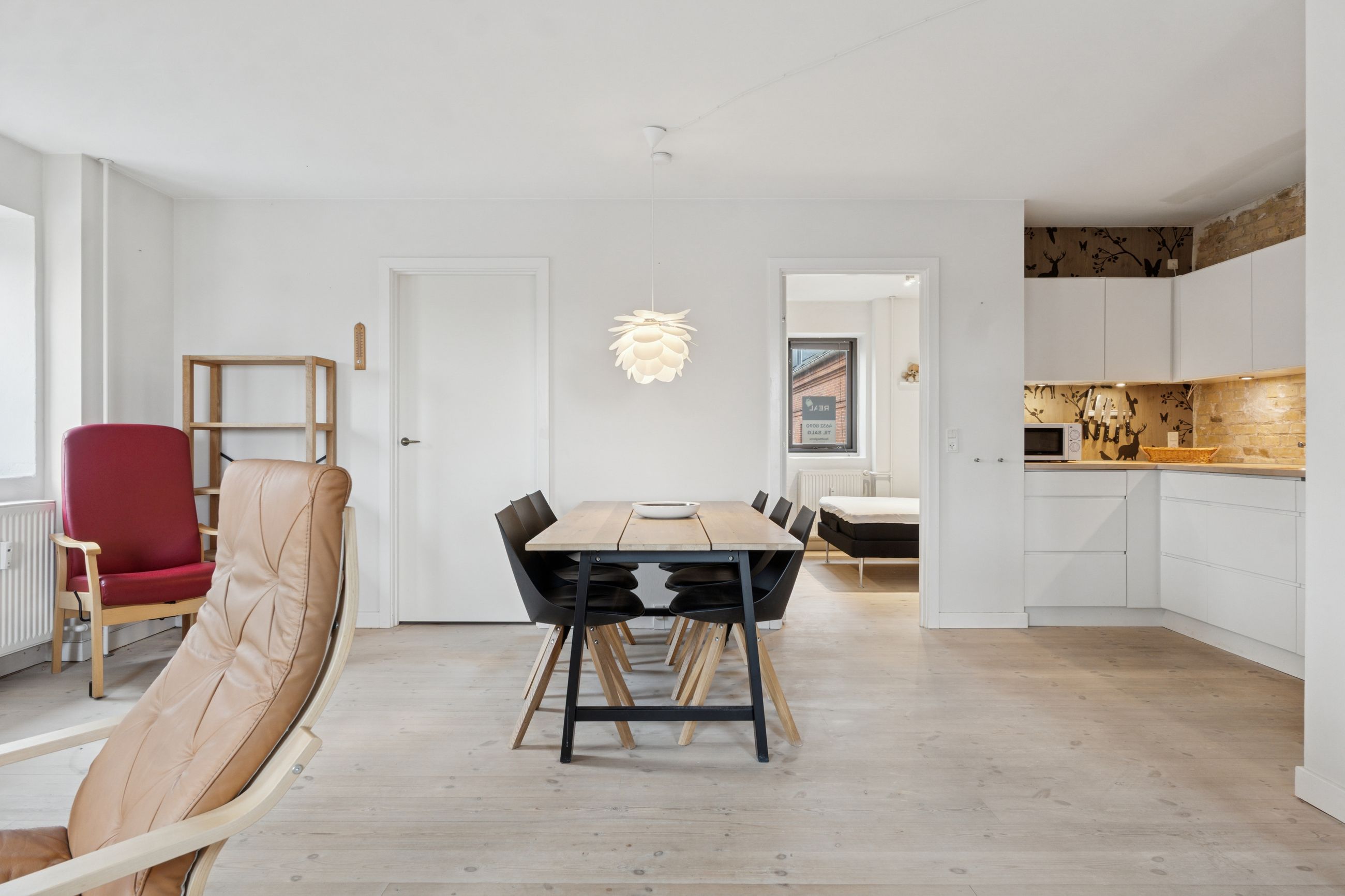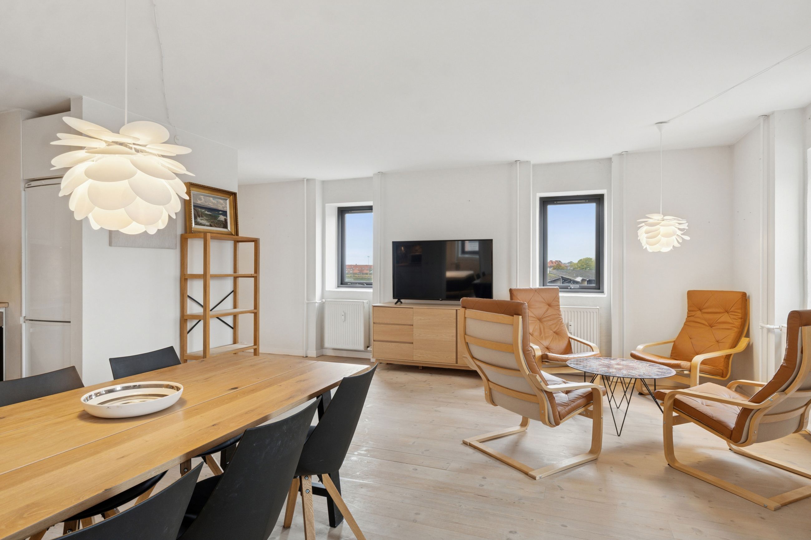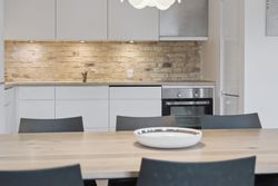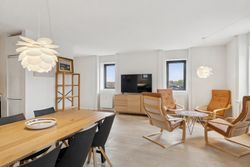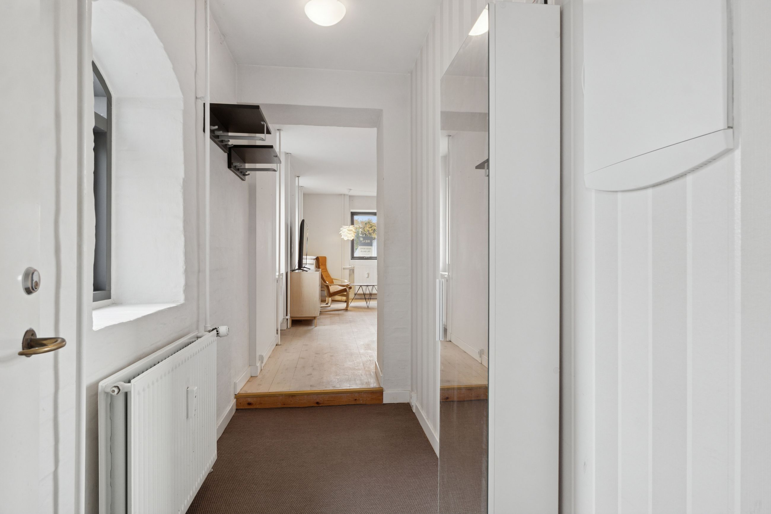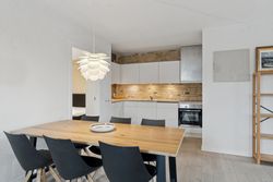 Man bydes velkommen i en flot opgang med elevator. Fra opgangen er der adgang til en møblerbar entré, der giver adgang til et pænt badeværelse med vaskesøjle og bruseniche. Den store, lyse stue er i åben forbindelse med køkkenet, som fremstår moderne med hvide elementer og en rustik, blotlagt murstensvæg, der skaber kontrast til det moderne udtryk. Stuen er så stor, at her er rigelig plads til både spise- og opholdsafdeling – du kan sågar indrette et lille ekstra værelse. Herudover rummer lejligheden to gode soveværelser.