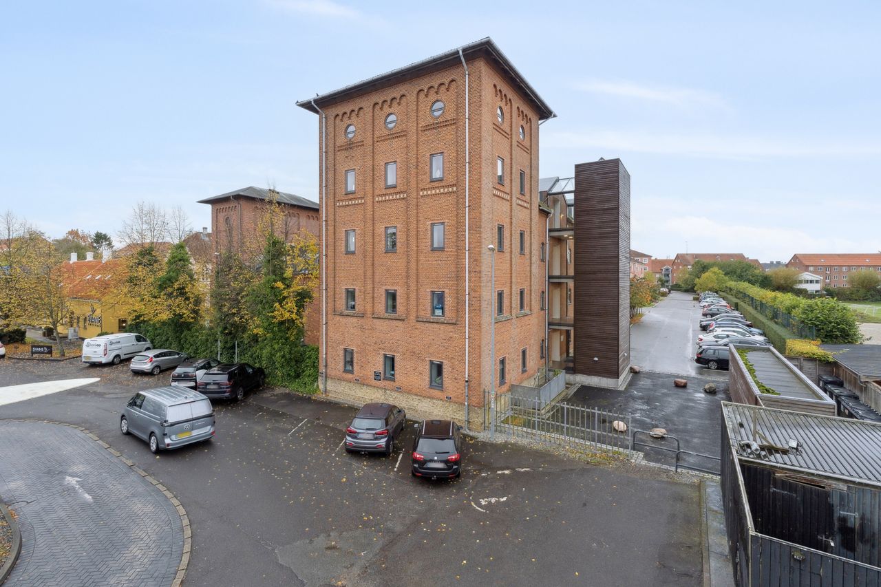 Bebyggelsen stammer fra 1906 og er en del af den historiske spritfabrik, hvor blandt andet den ikoniske bitter Gammel Dansk blev udviklet. Fabrikken var en vigtig del af Roskildes industrihistorie og var en af de første bygninger i Danmark med elektrisk belysning. For lidt over 20 år siden blev der indrettet boliger i de gamle, historiske bygninger. Lejligheden er på 91 velindrettede kvadratmeter og fremstår i pæn stand med mange fine detaljer som fx flotte plankegulve og køkken med synlige mursten. Til lejligheden hører kælderrum og pæne fællesarealer med fælles parkering.