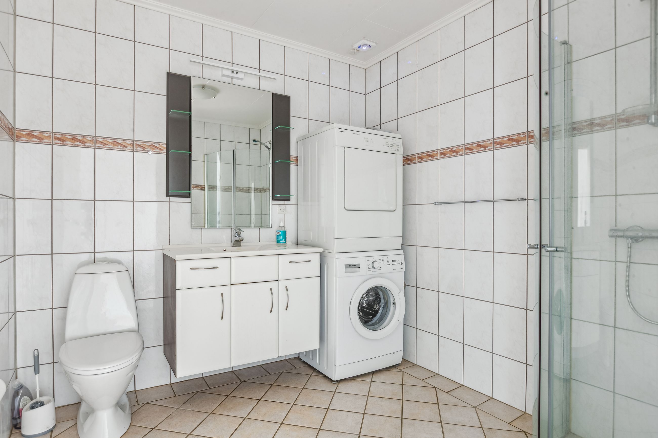 Badeværelset fremstår velholdt og rummeligt med moderne faciliteter, der sikrer din daglige komfort. Ejendommen ligger i gåafstand til alle byens bekvemmeligheder såsom indkøbsmuligheder, skole og offentlig transport.
