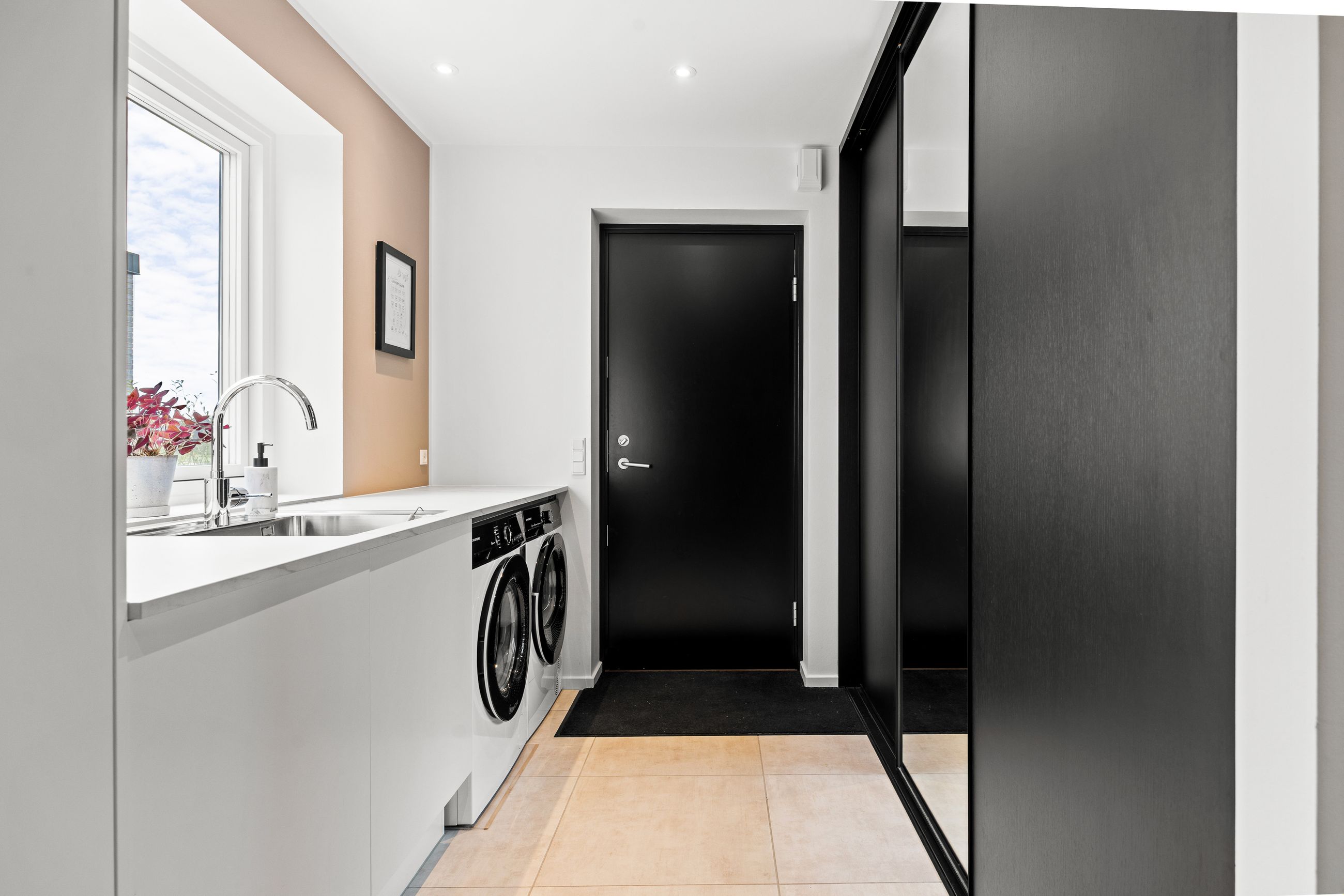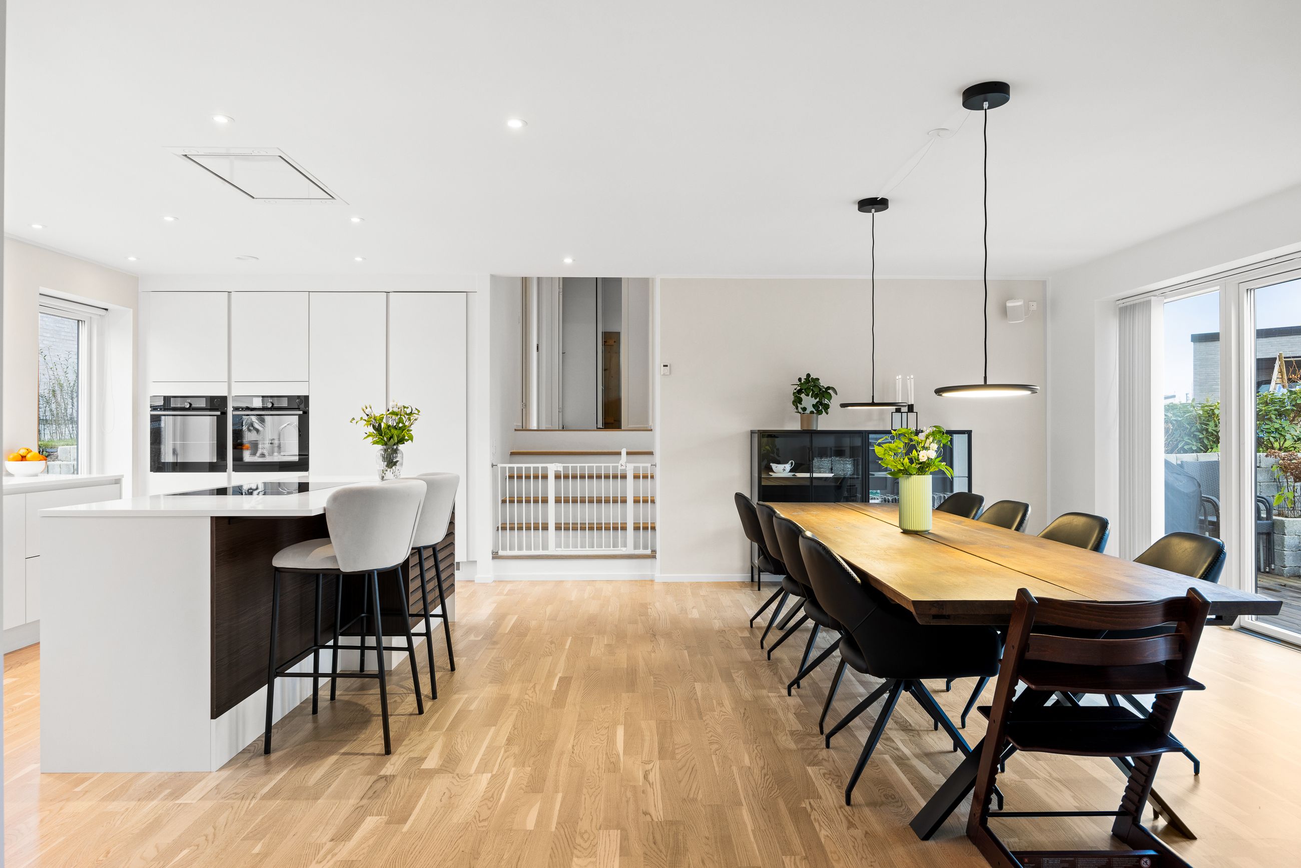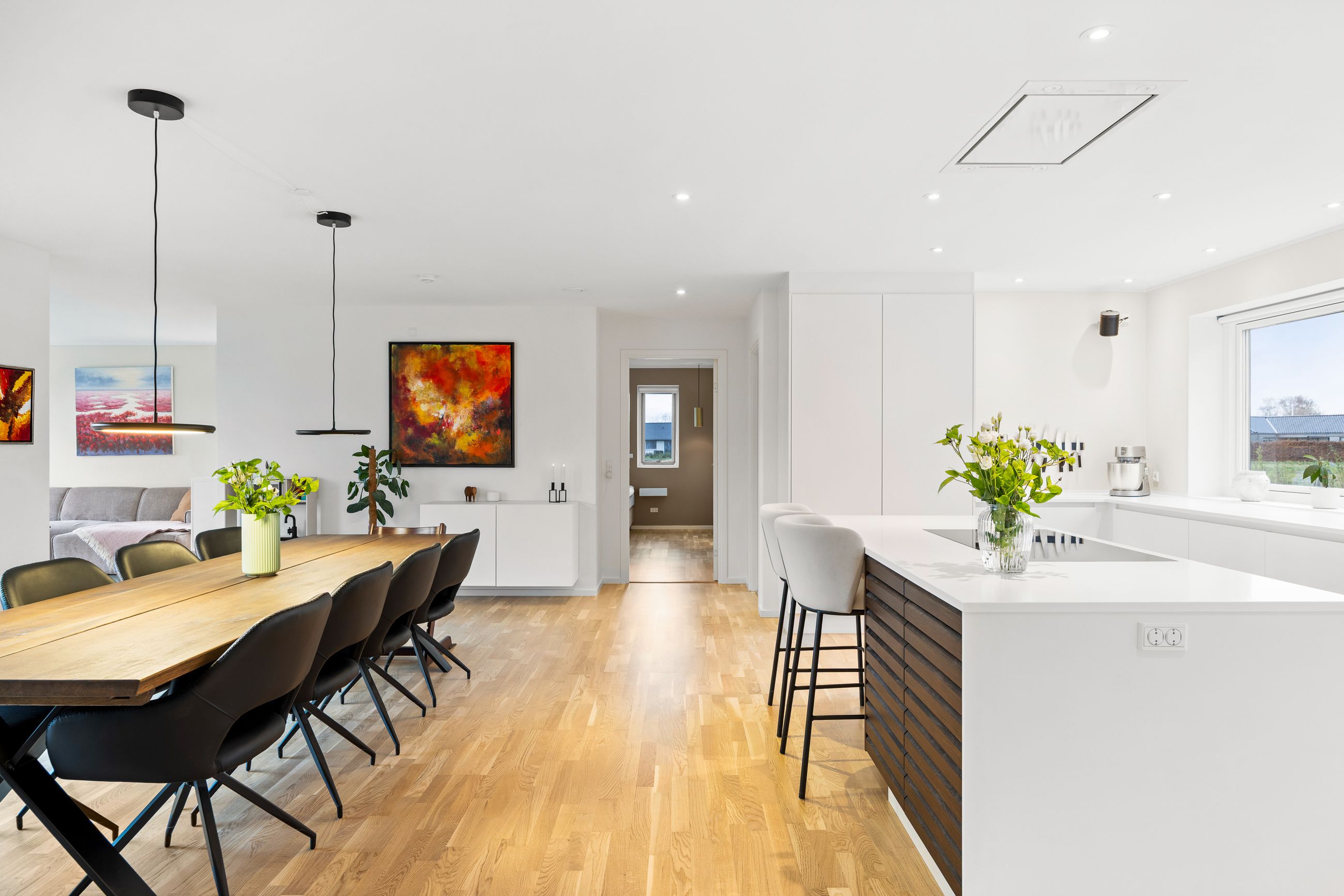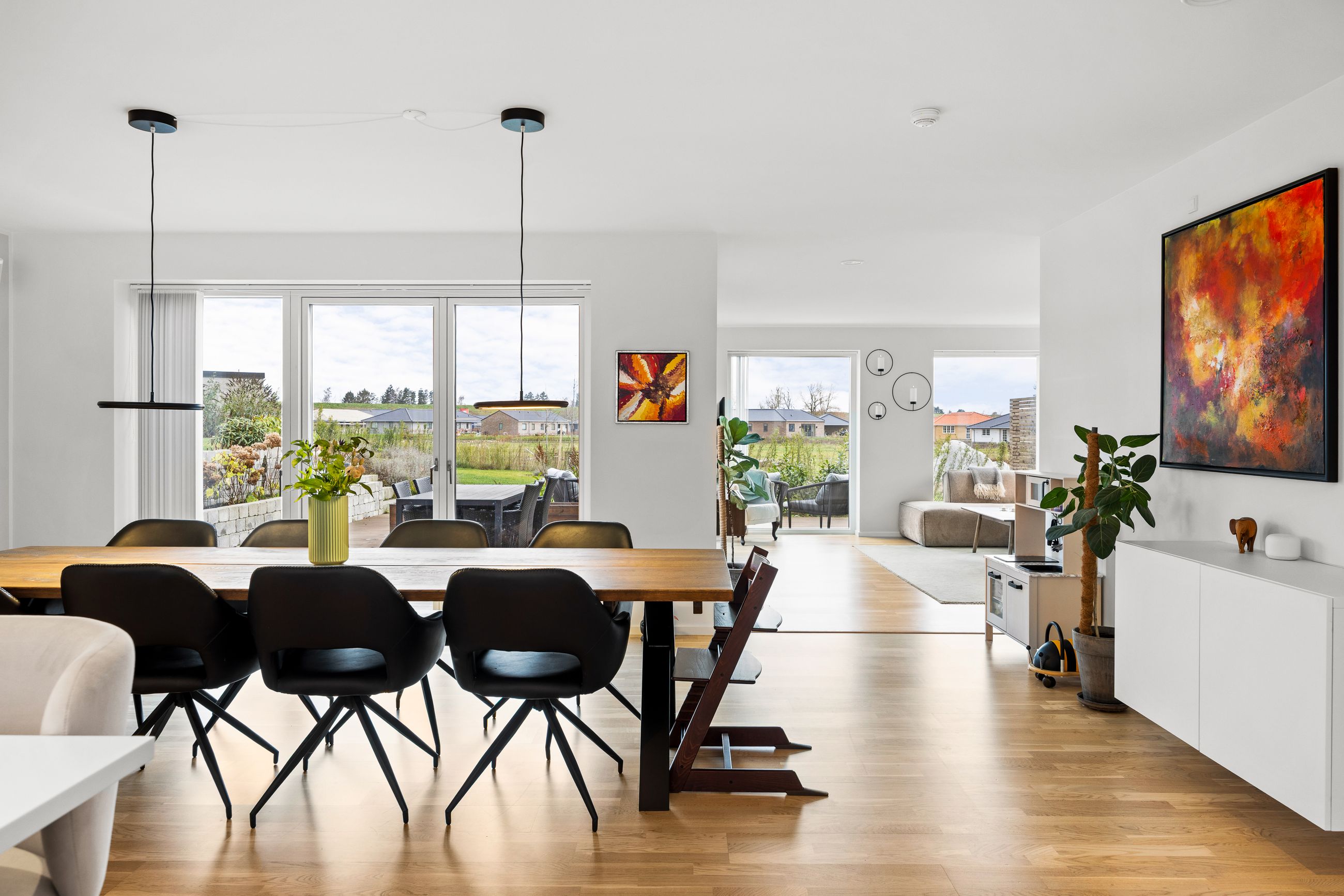 Villaen imponerer med sine rummelige værelser og det åbne køkken/alrum ligger i direkte forbindelse med stuen, hvilket skaber en flydende overgang mellem madlavning og afslapning. Dette gør det nemt at underholde gæster eller holde øje med børnene, mens du laver aftensmaden. De forskudte plan giver huset karakter. Den gennemtænkte planløsning sikrer desuden optimal udnyttelse af pladsen samt masser af opbevaringsmuligheder.