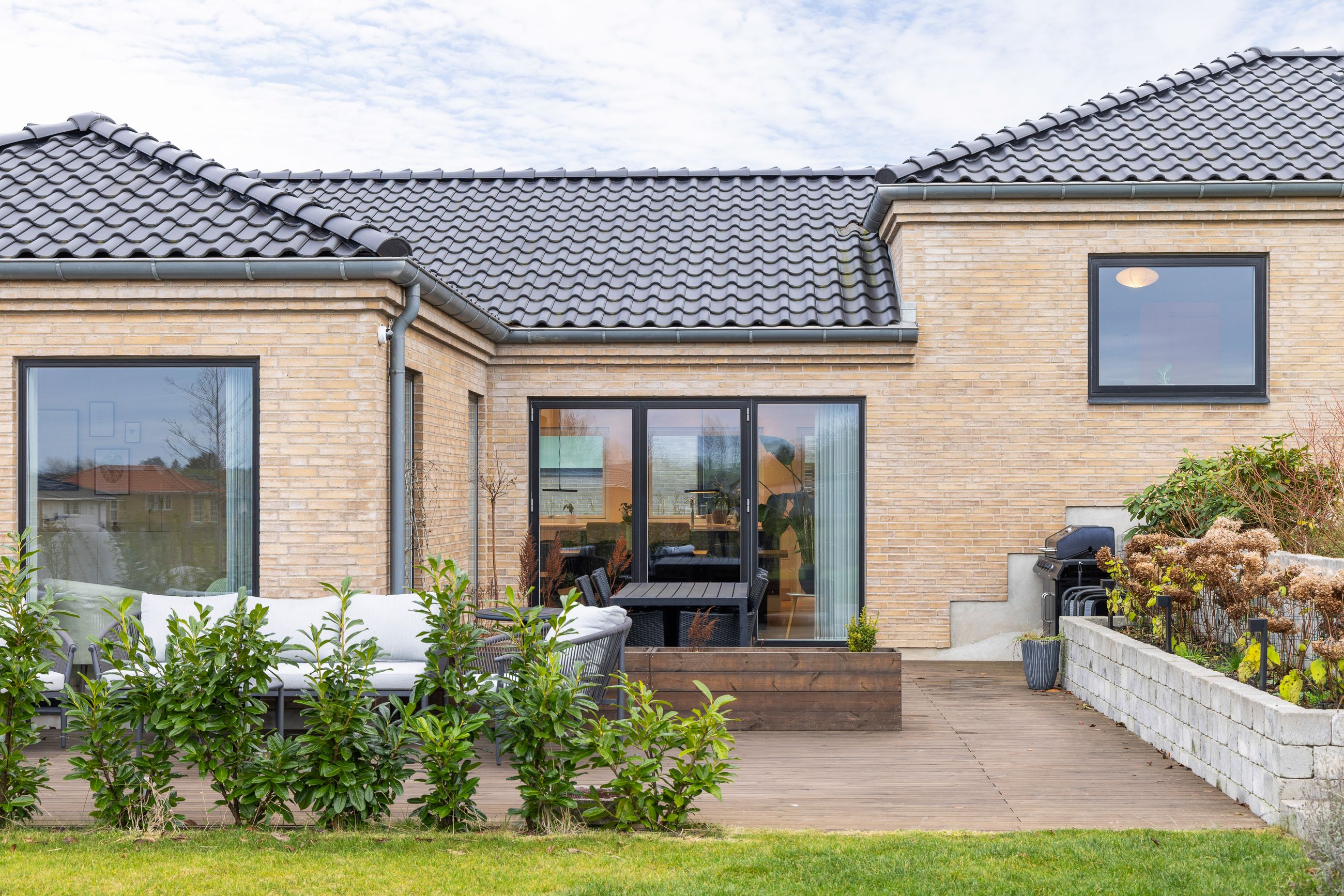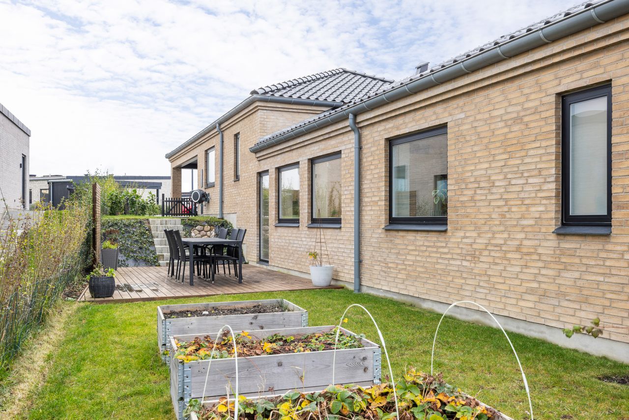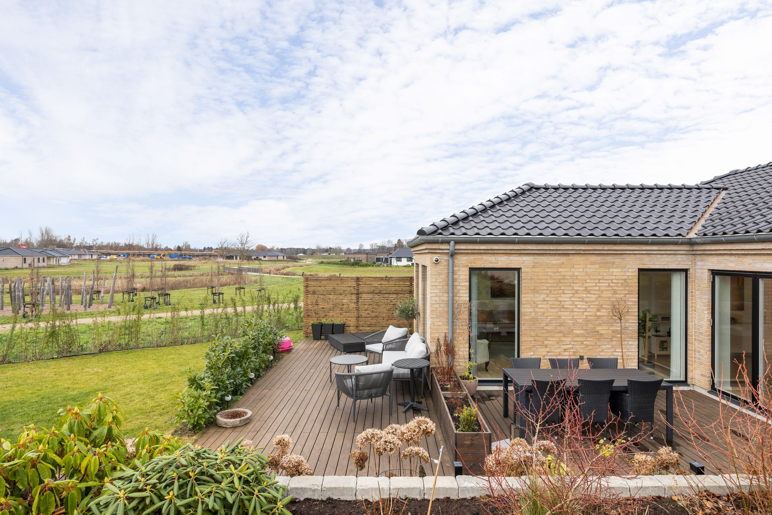 Udendørs venter en fantastisk have anlagt i flere niveauer. Her er rigelig plads til børnenes trampolin eller fodboldmål samt områder dedikeret til grillhygge på sommeraftenerne. Haven tilbyder et frit udsyn over området, hvilket skaber en følelse af ro og åbenhed.