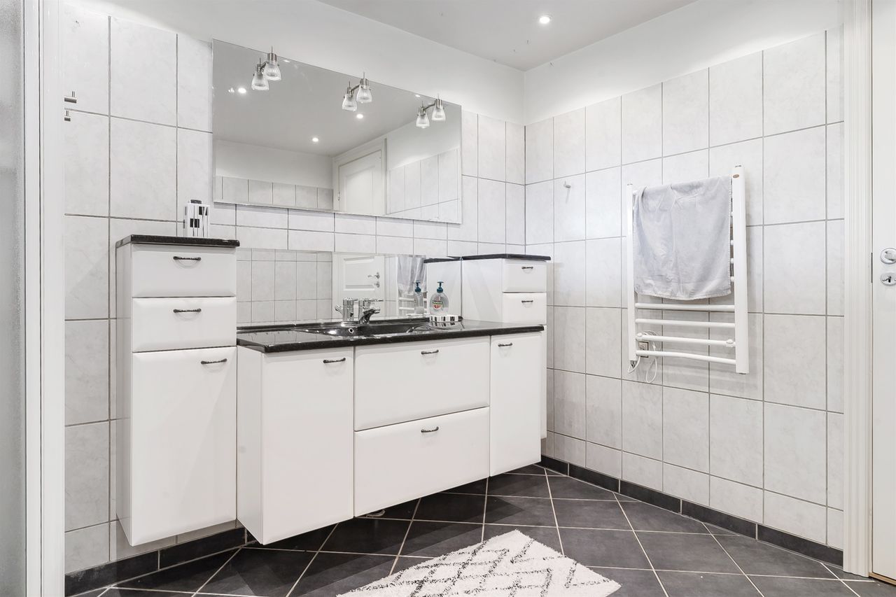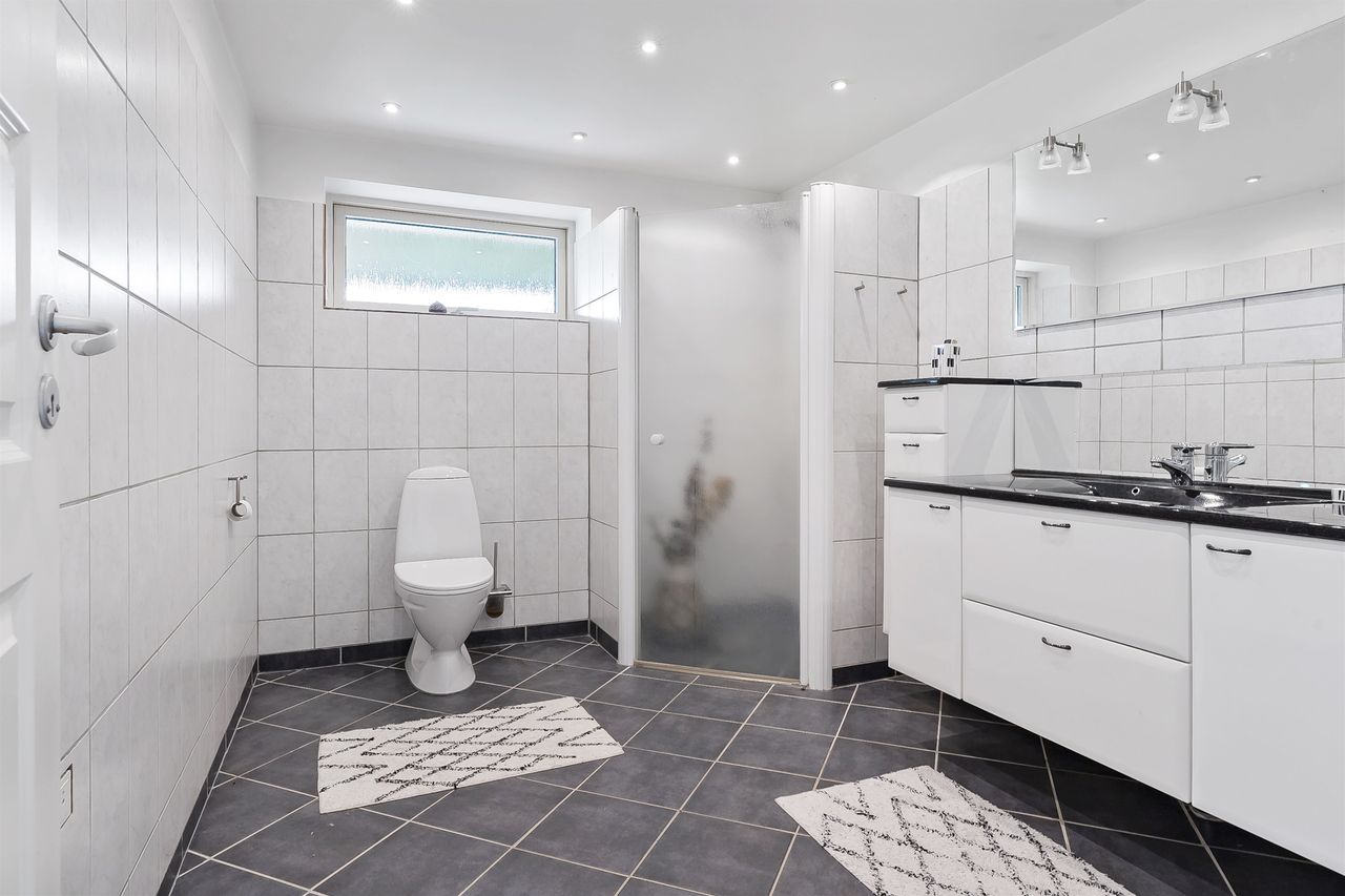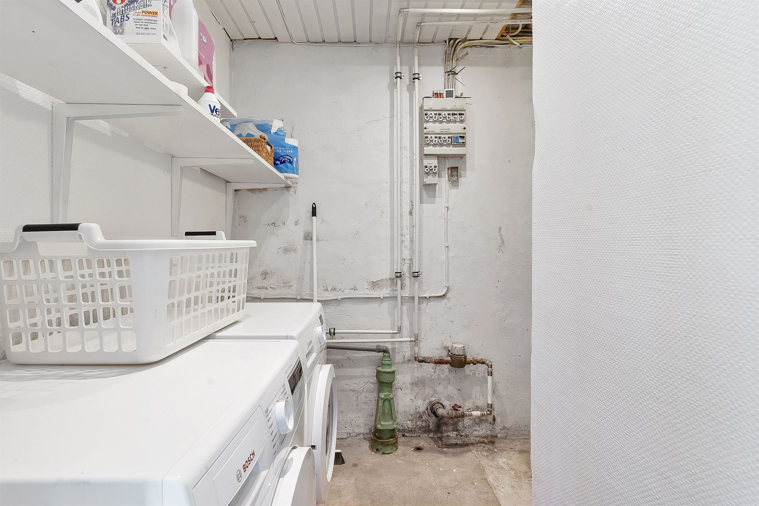 Ejendommens stueplan fremstår i realiteten som en første sal, da huset er bygget med en kælder der er delvist gravet fri, samt har altan – i kælderplan venter yderligere 65 m2 med egen direkte udgang til haven, indrettet med 2 disponible rum, der i dag bruges som værelser, samt et stort badeværelse med gulvvarme, og yderligere et opbevaringsrum og et fyrrum.