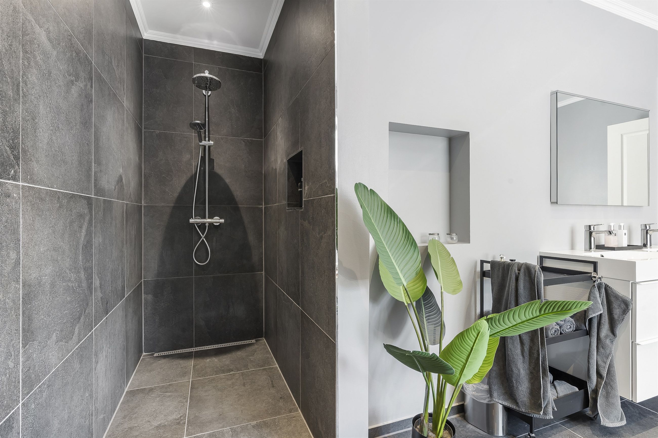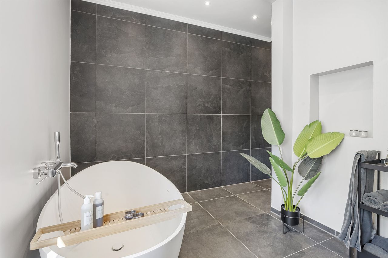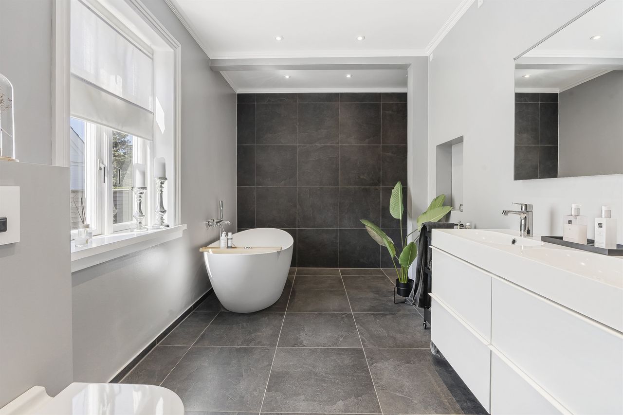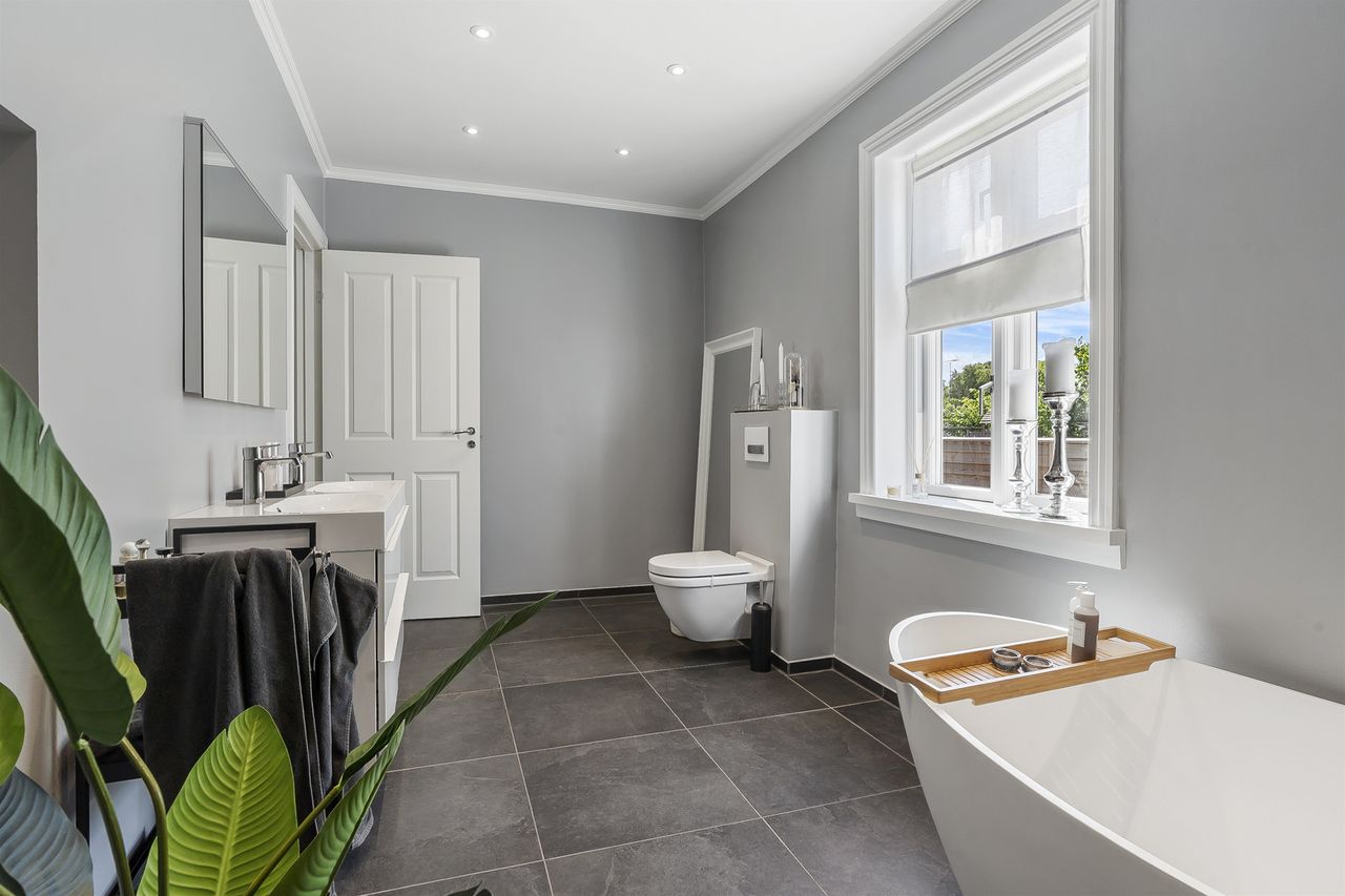 I stueplan finder du ikke bare ét, men to moderne badeværelser – herunder et luksuriøst og stilrent badeværelse med både karbad og bruseniche, samt et ekstra badeværelse, der giver både komfort og fleksibilitet i hverdagen. I det store badeværelse er der desuden ført strøm til skuffen, for nem adgang til opladere eller f.eks. føntørrer.
