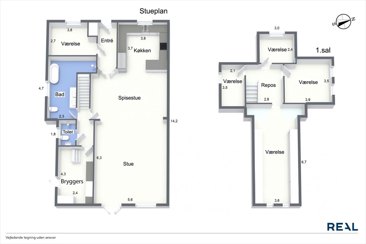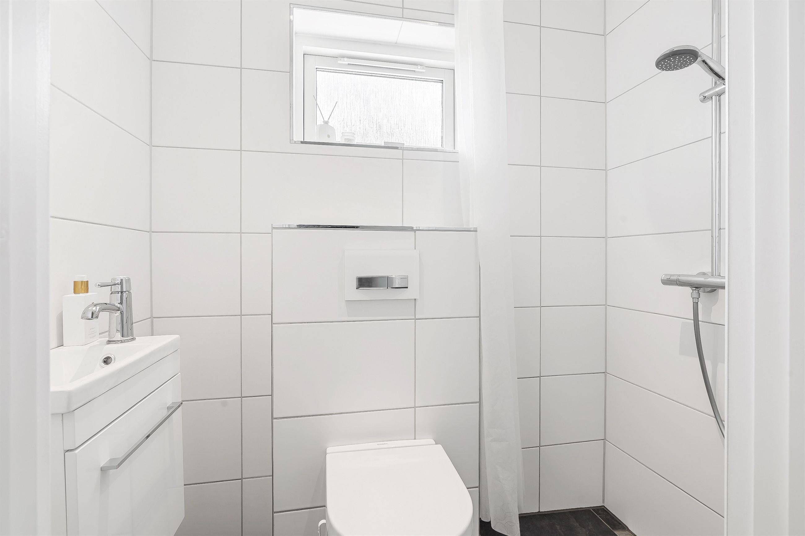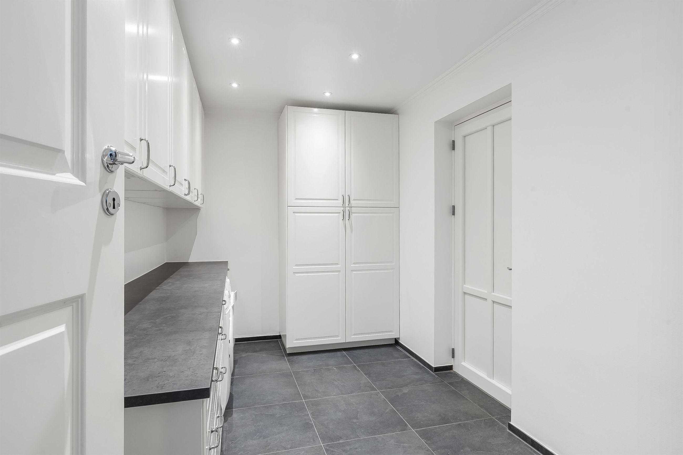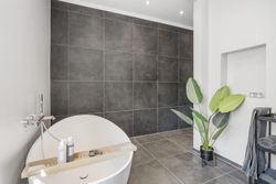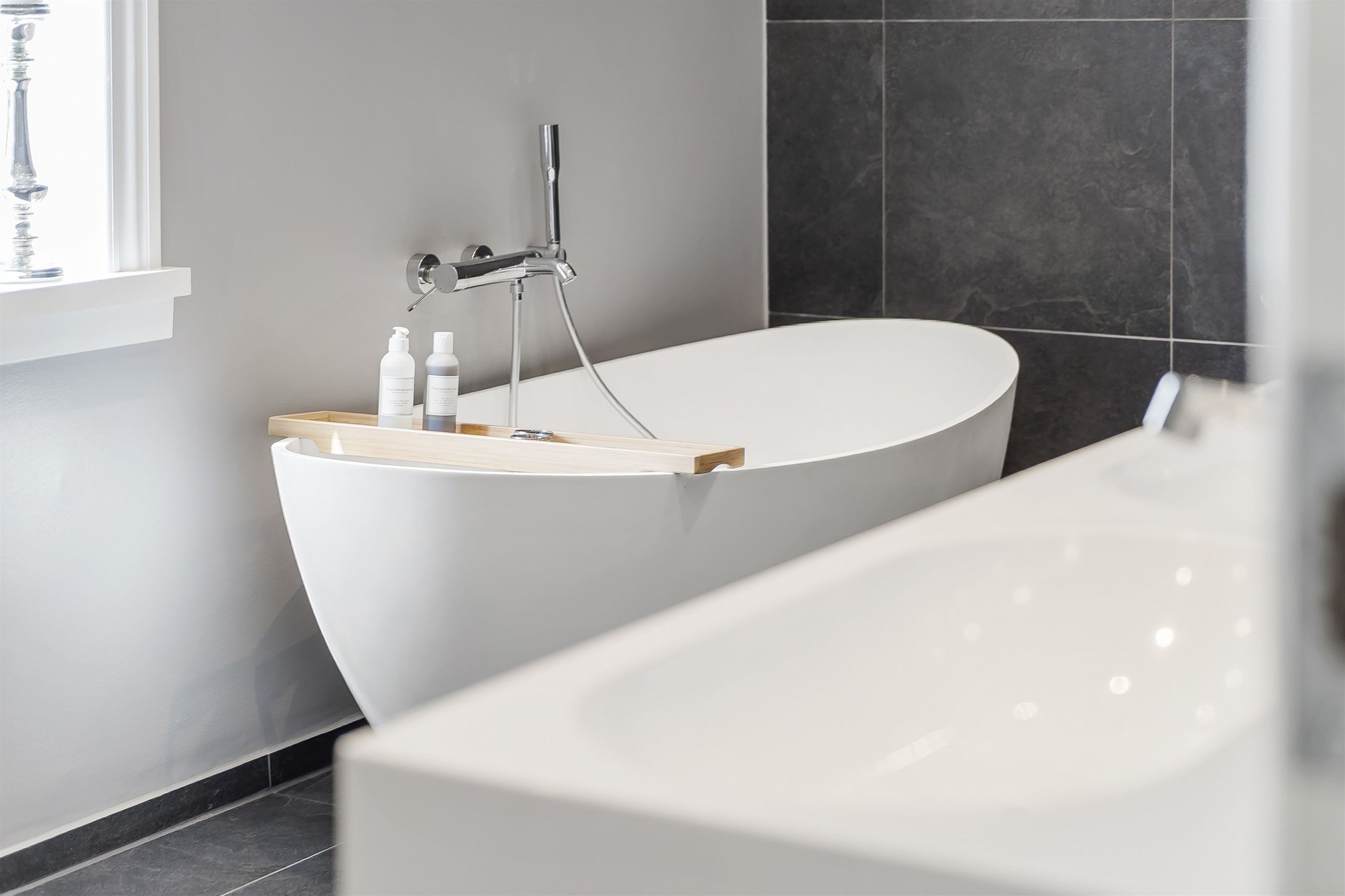 I stueplan finder du ikke bare ét, men to moderne badeværelser – herunder et luksuriøst og stilrent badeværelse med både karbad og bruseniche, samt et ekstra badeværelse, der giver både komfort og fleksibilitet i hverdagen. I det store badeværelse er der desuden ført strøm til skuffen, for nem adgang til opladere eller f.eks. føntørrer.