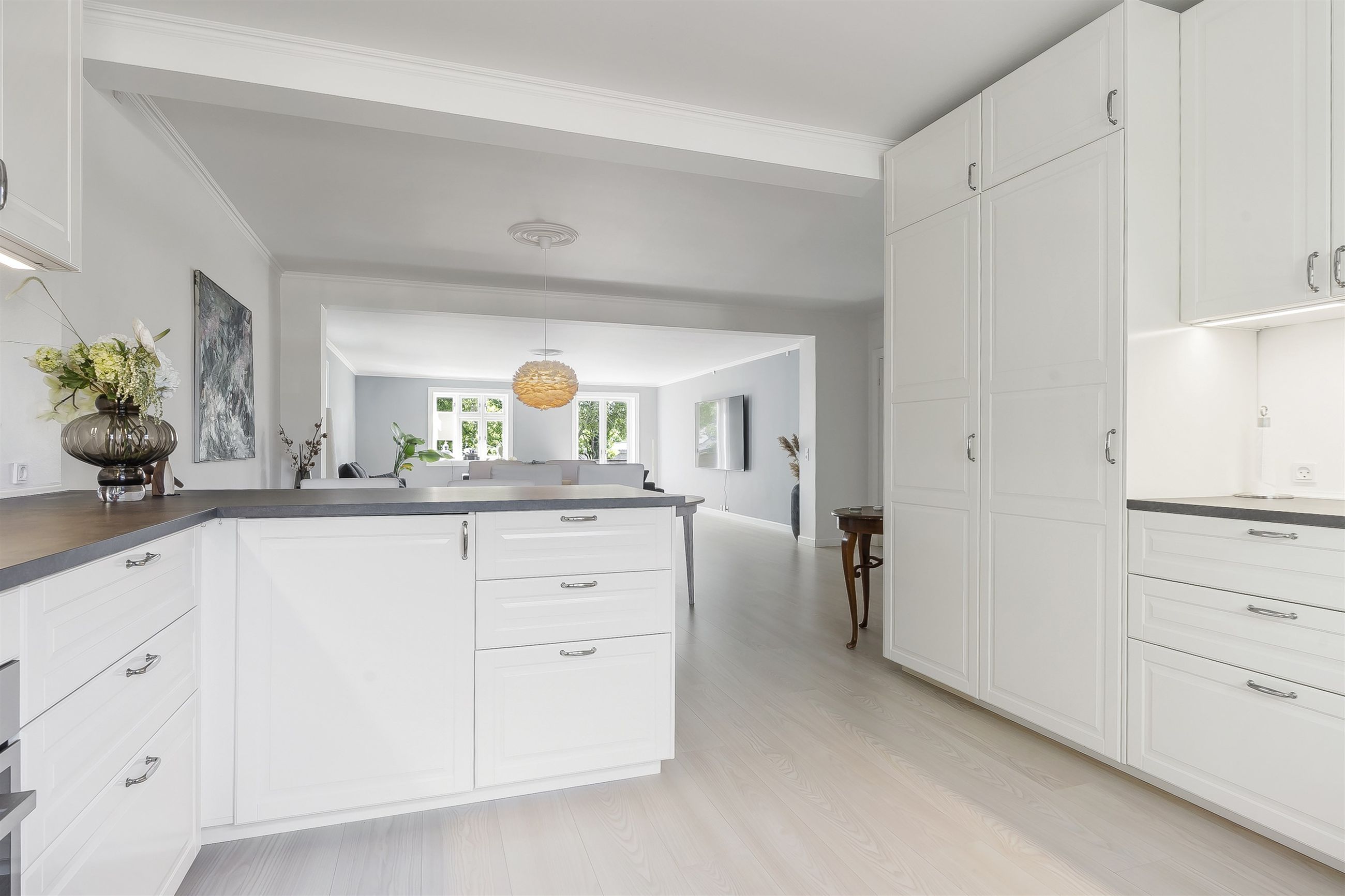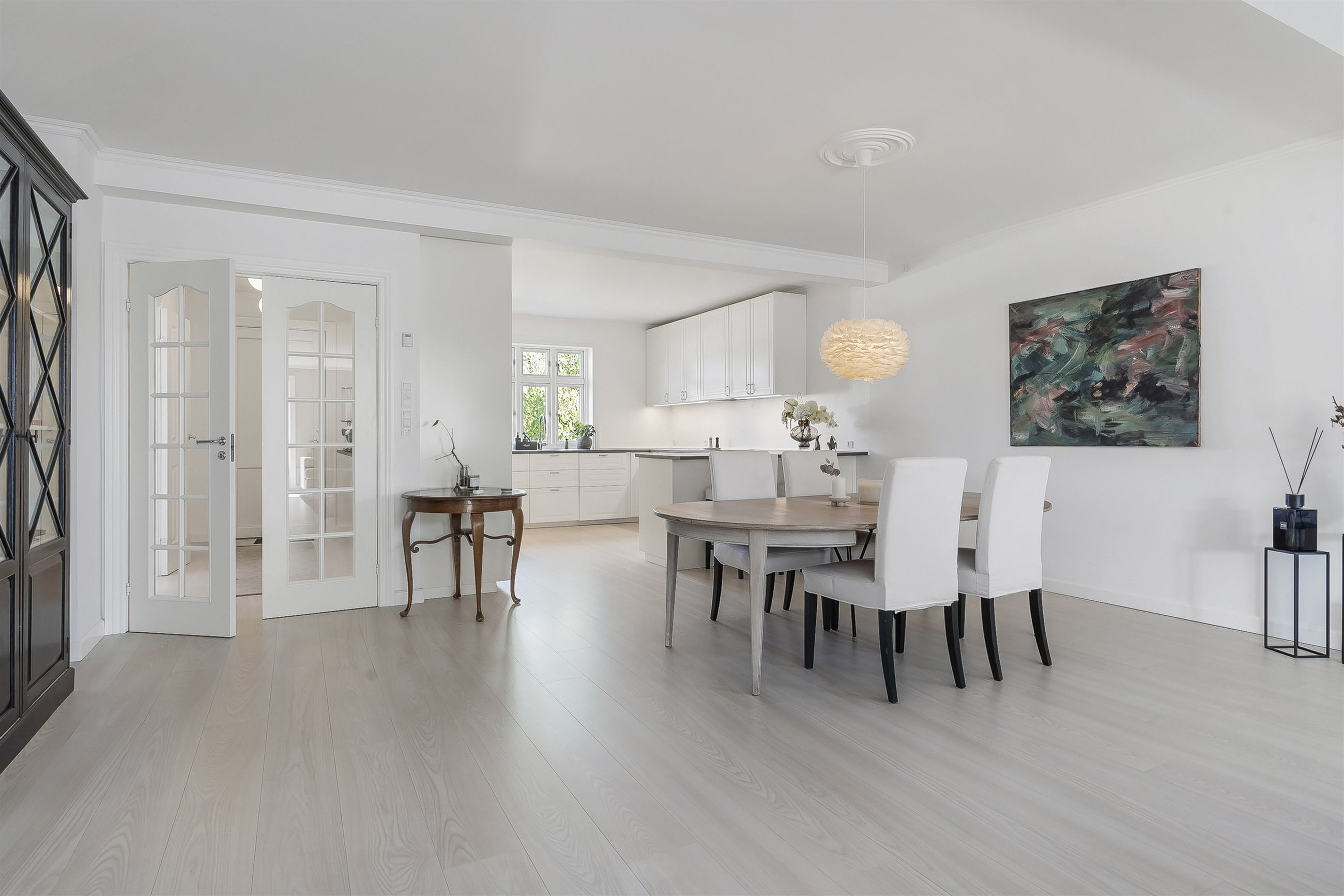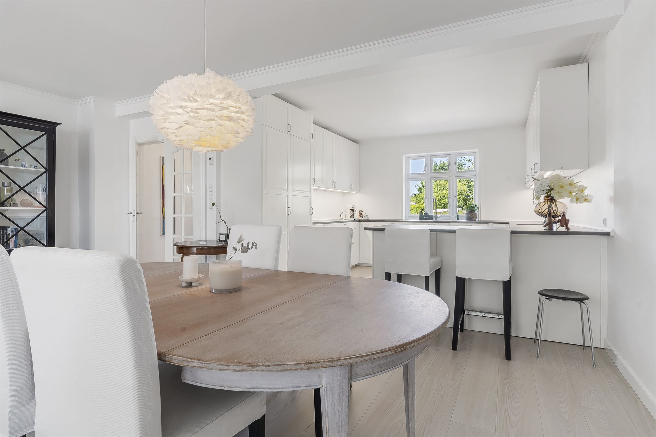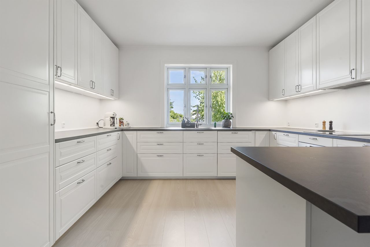 Indenfor bydes du velkommen af store, lyse rum med gulvvarme overalt – et hjem der både føles indbydende og funktionelt. Det stilrene køkkenalrum er boligens naturlige samlingspunkt, hvor der er god plads til både hverdag og selskaber.