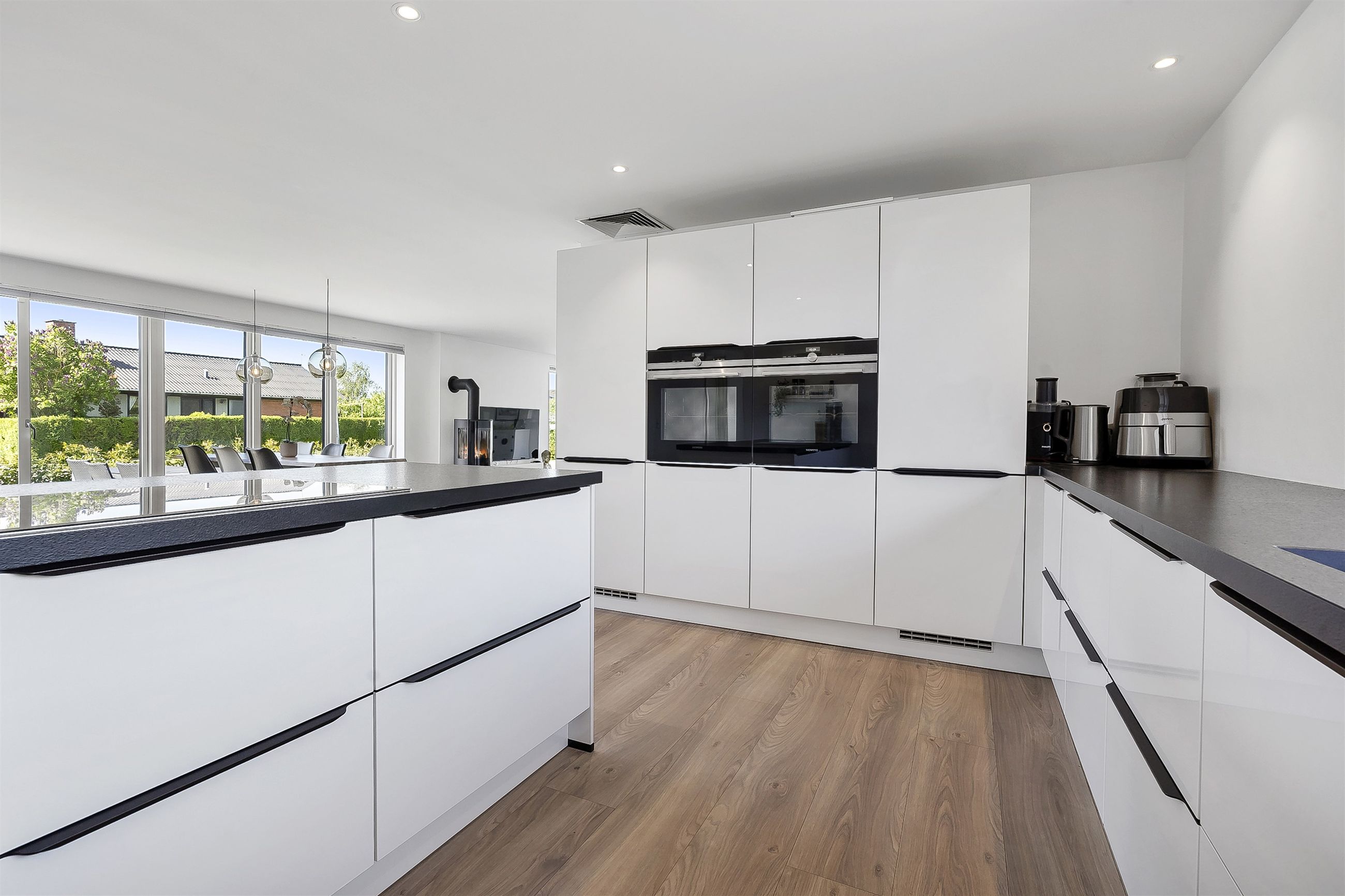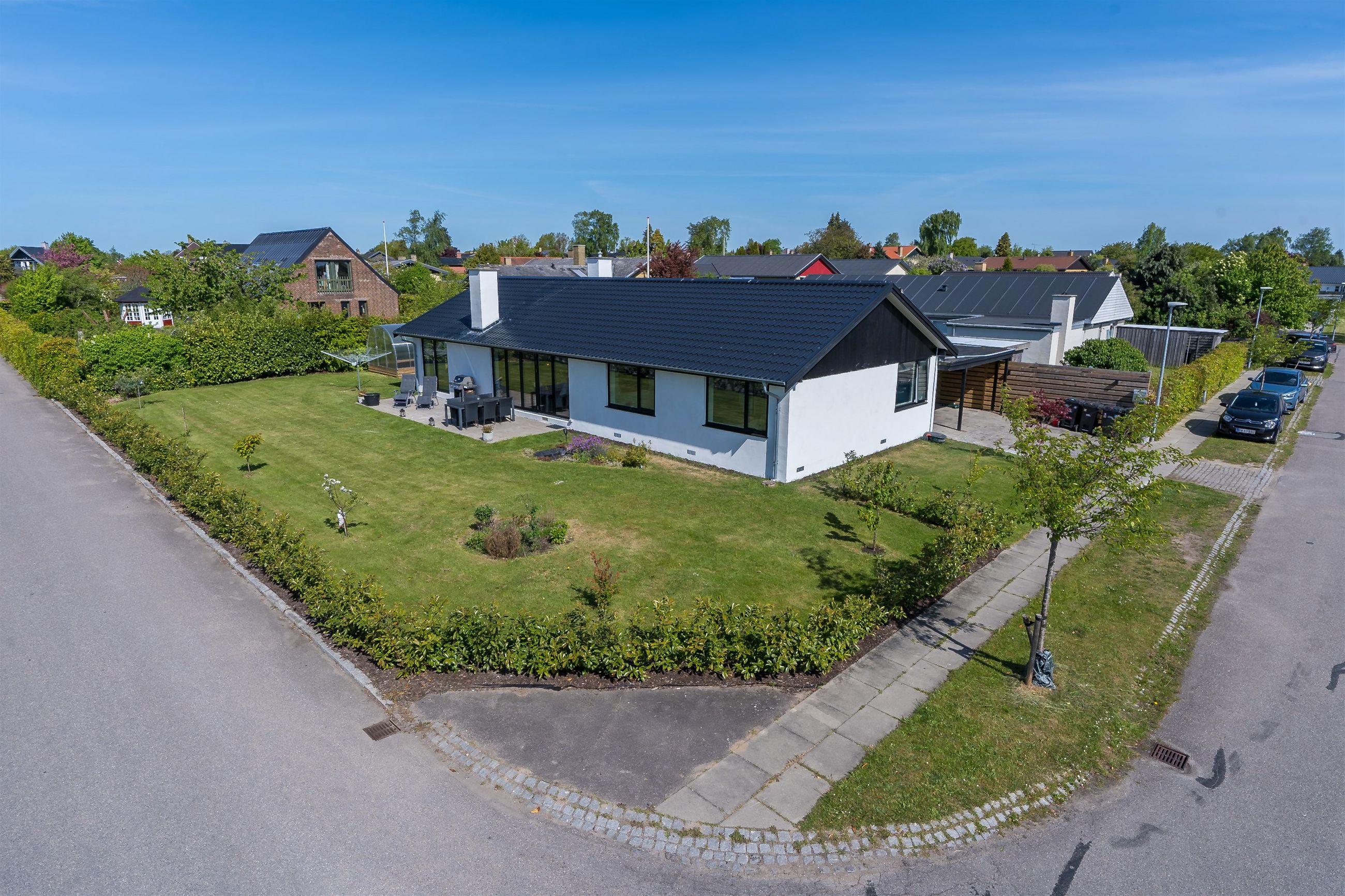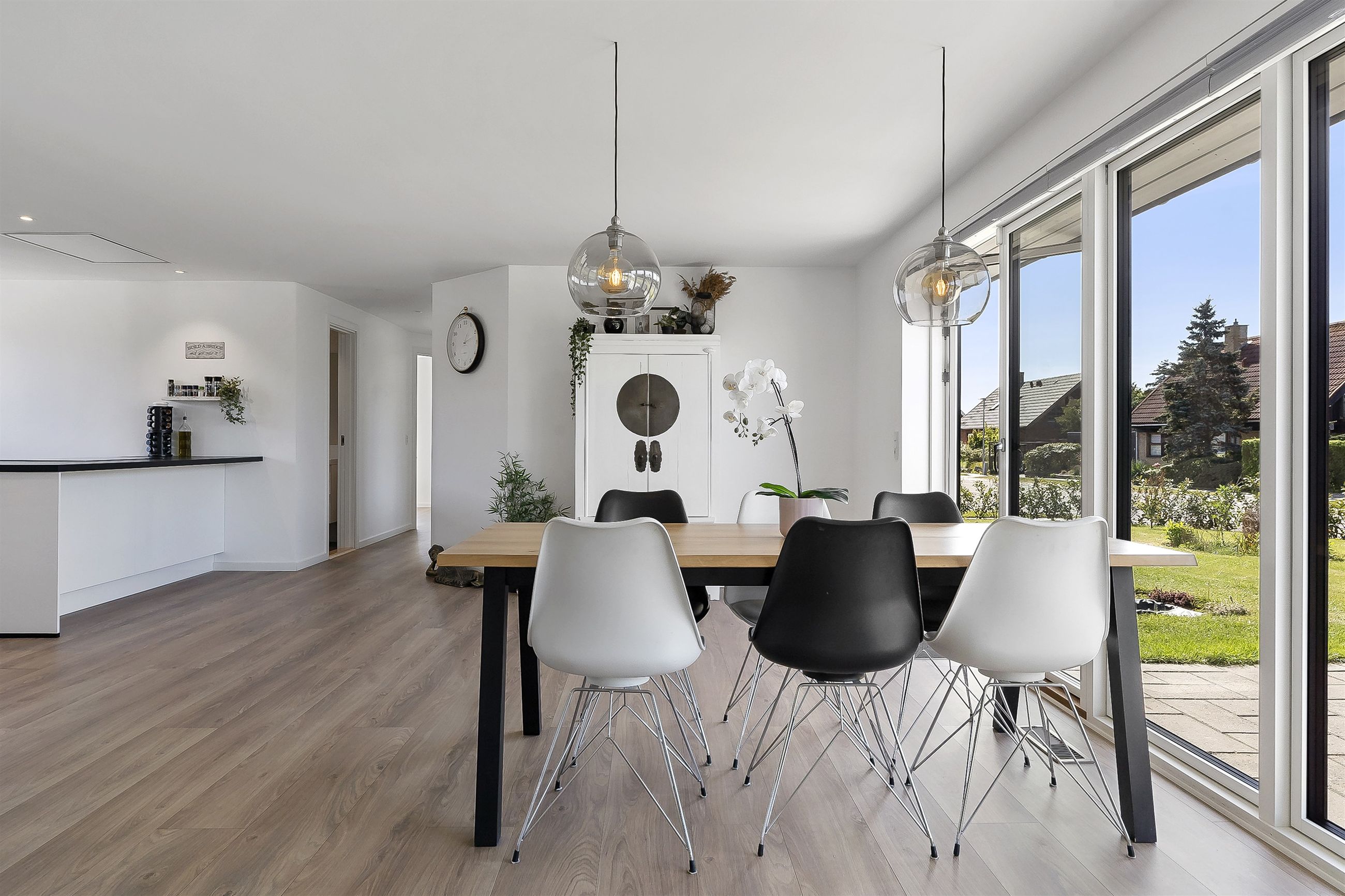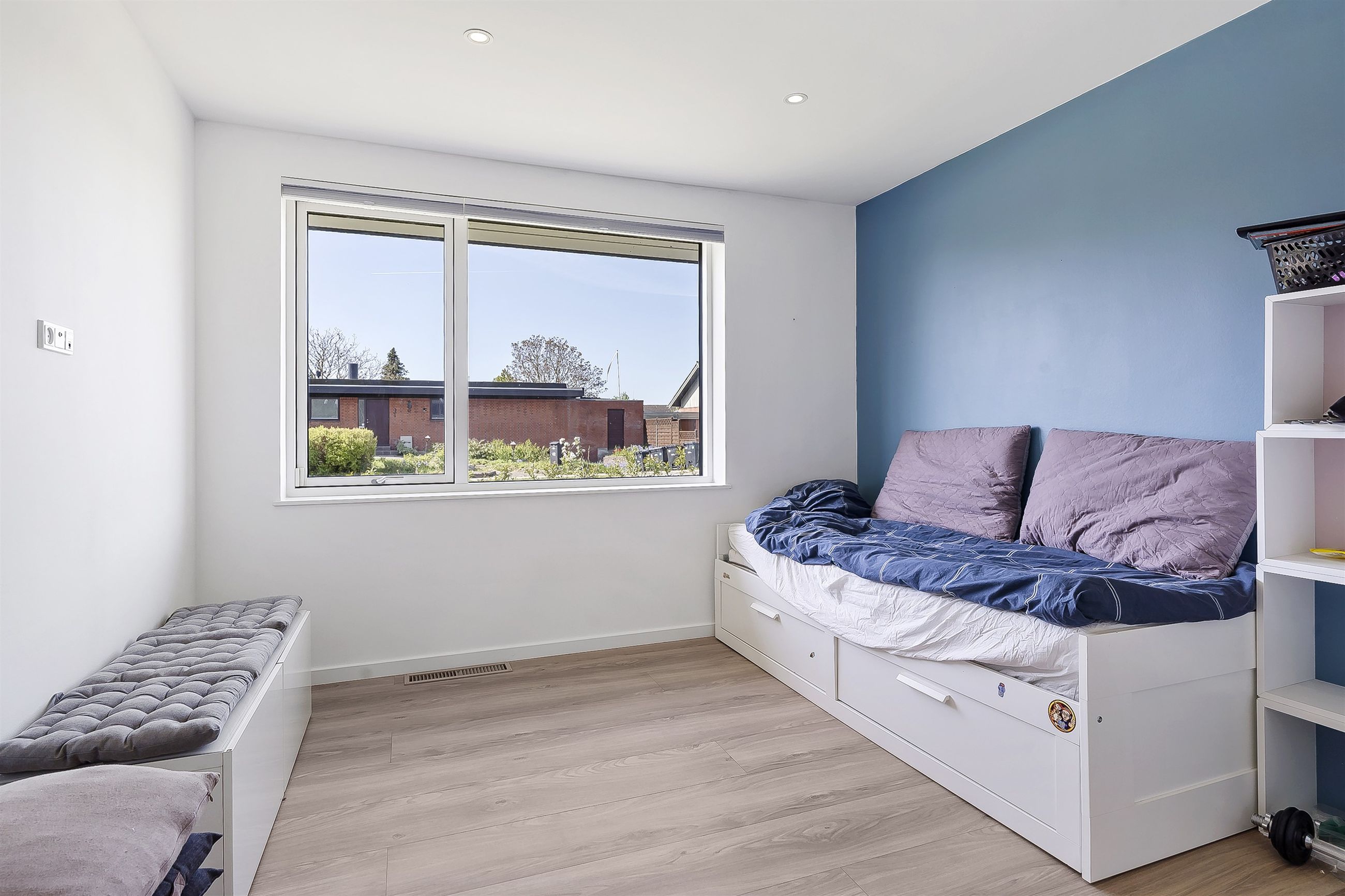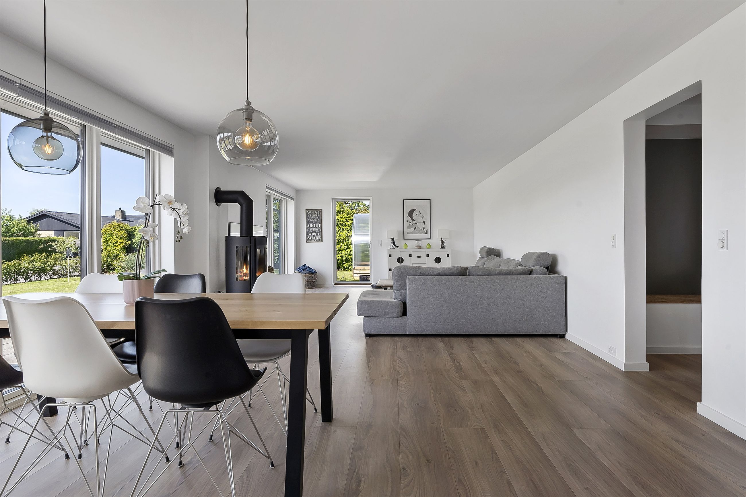 Hjemmet er indrettet med en værelsesafdeling, hvor tre store soveværelser giver masser af rum til både børn og voksne. Badeværelset fremstår flot og moderne med stilrene sorte fliser, og det store køkkenalrum bades i naturligt lys fra de store vinduespartier, der inviterer haven helt indenfor. Her er der rig mulighed for at samle familien til fællesspisning, lektielæsning og hyggelige aftener. Køkkenet har godt med bordplads og ligger som samtalekøkken åbent til den rummelige stue, som skaber en dejlig sammenhæng i boligen.