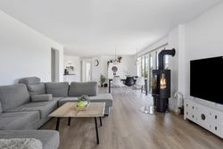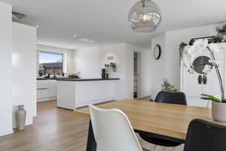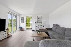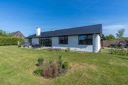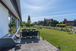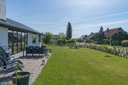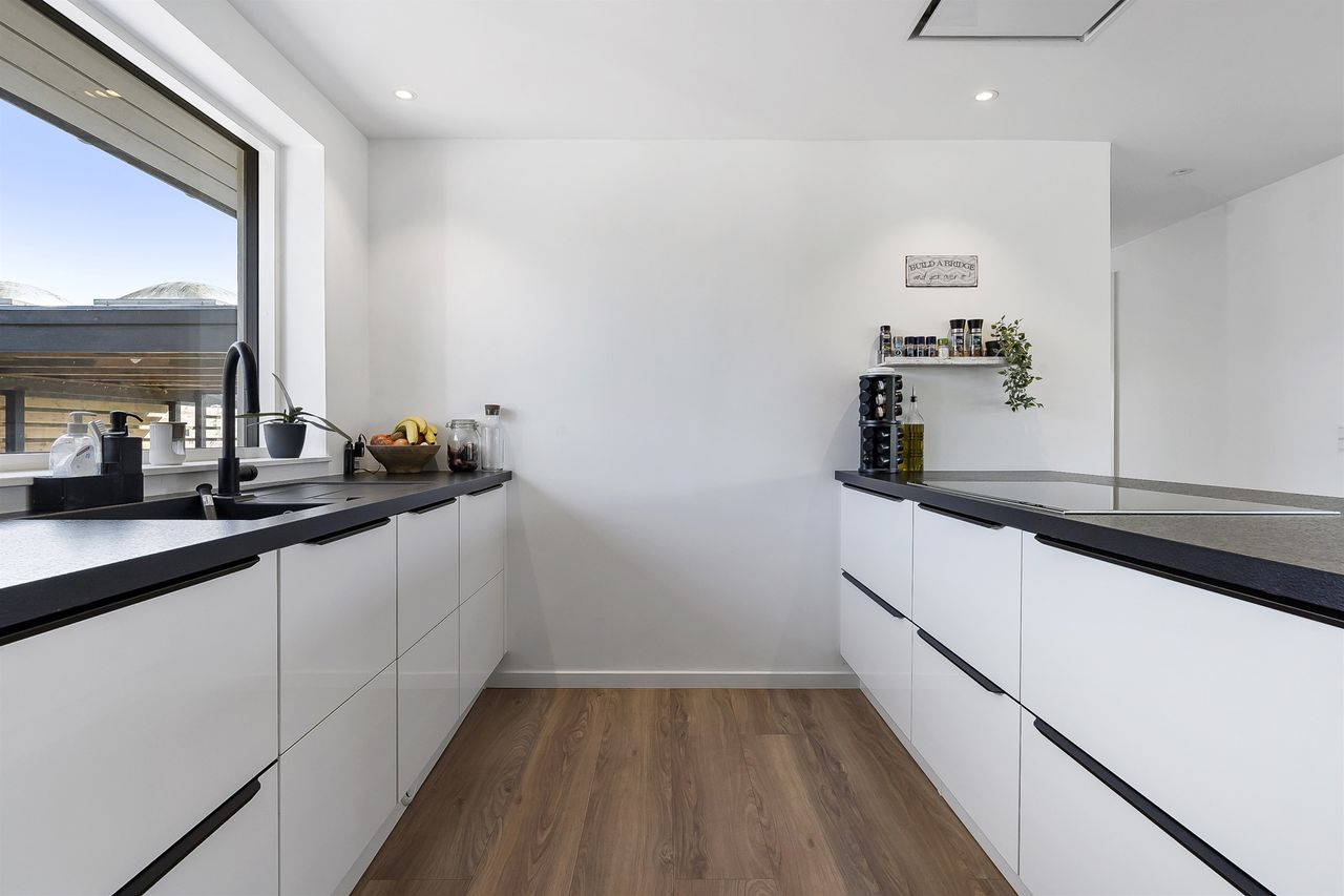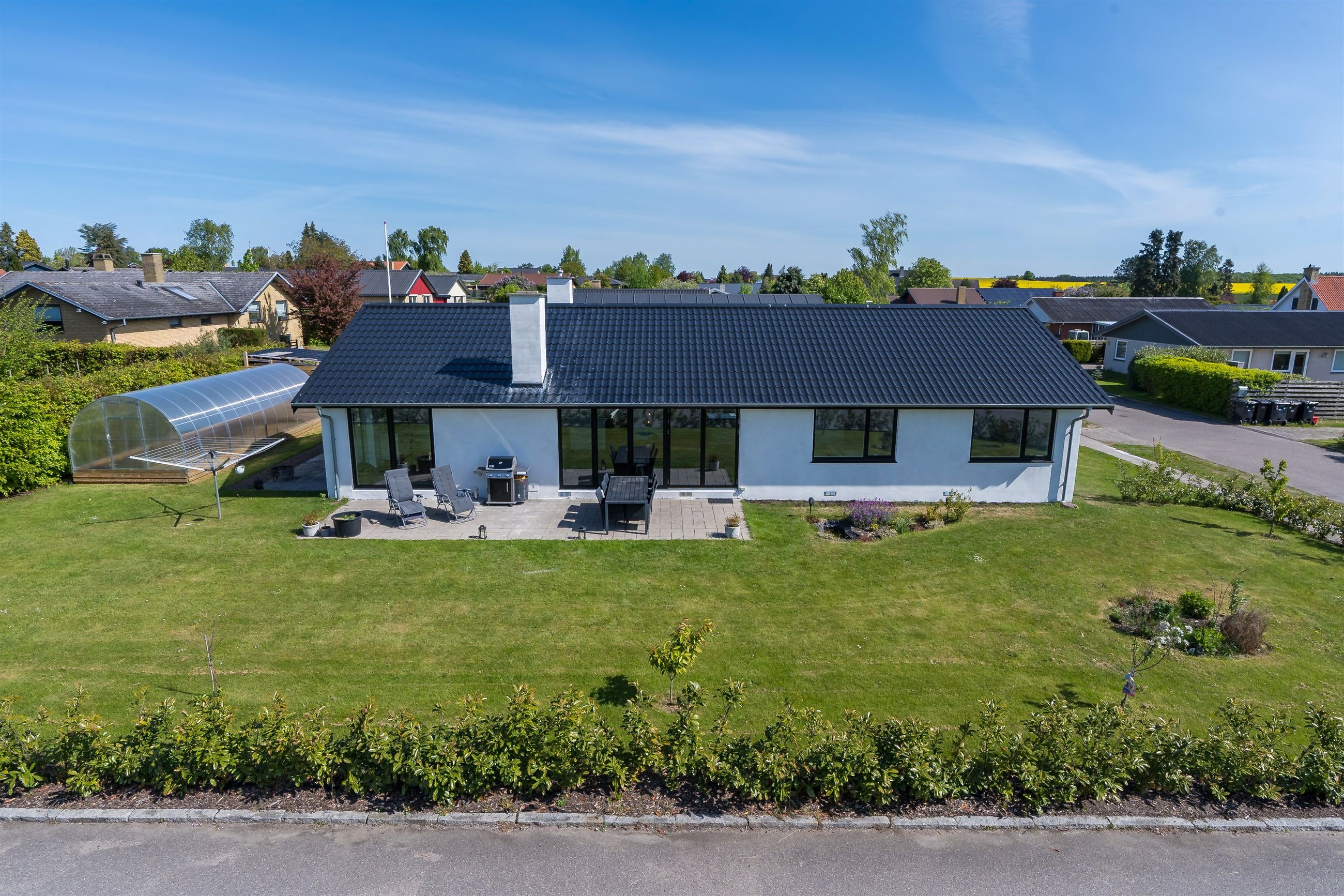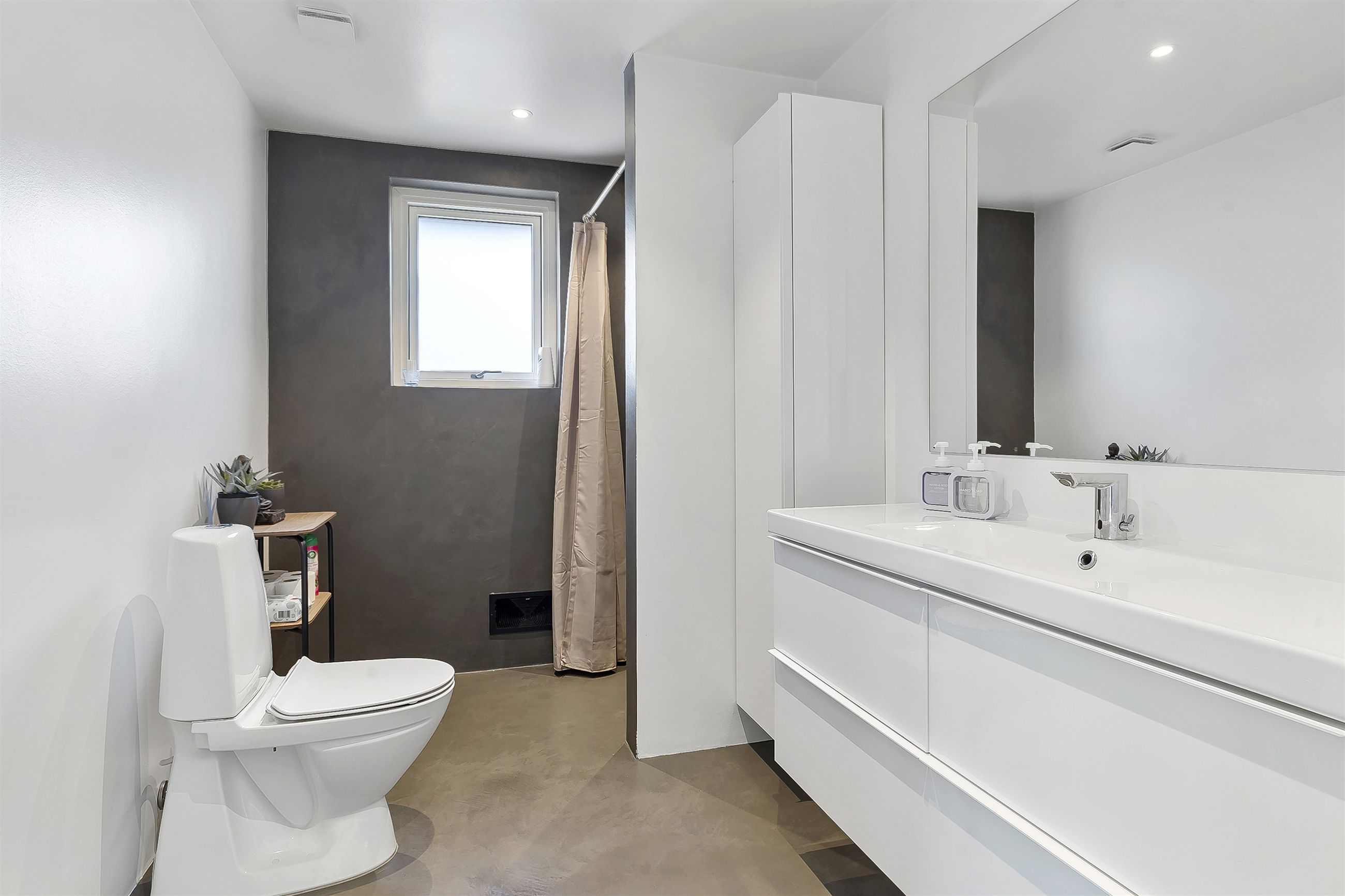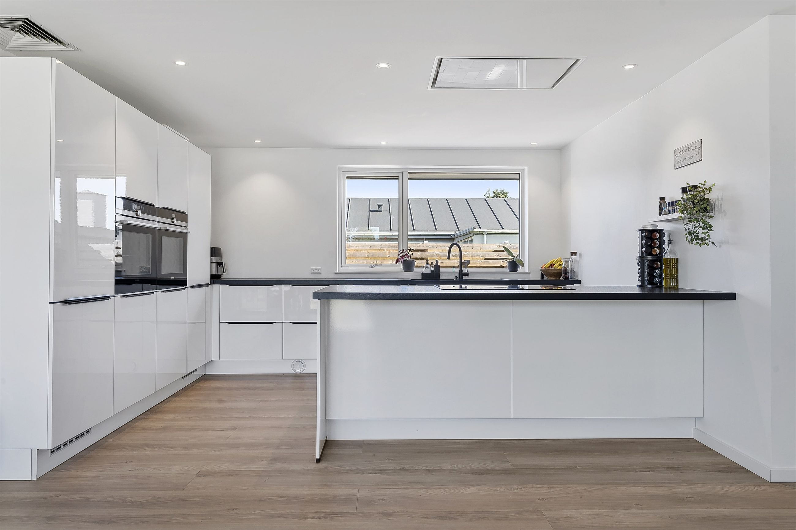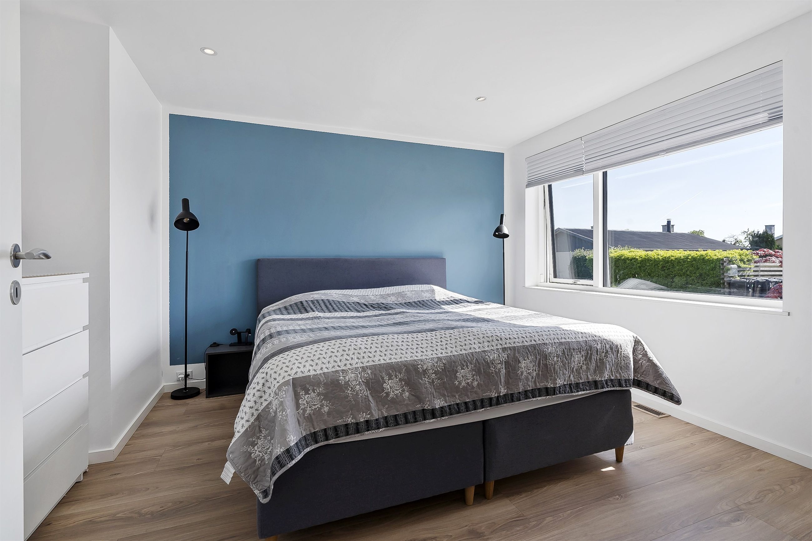 Hjemmet er indrettet med en værelsesafdeling, hvor tre store soveværelser giver masser af rum til både børn og voksne. Badeværelset fremstår flot og moderne med stilrene sorte fliser, og det store køkkenalrum bades i naturligt lys fra de store vinduespartier, der inviterer haven helt indenfor. Her er der rig mulighed for at samle familien til fællesspisning, lektielæsning og hyggelige aftener. Køkkenet har godt med bordplads og ligger som samtalekøkken åbent til den rummelige stue, som skaber en dejlig sammenhæng i boligen.