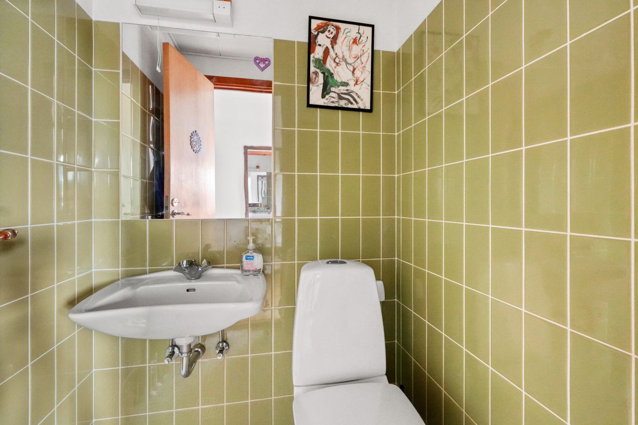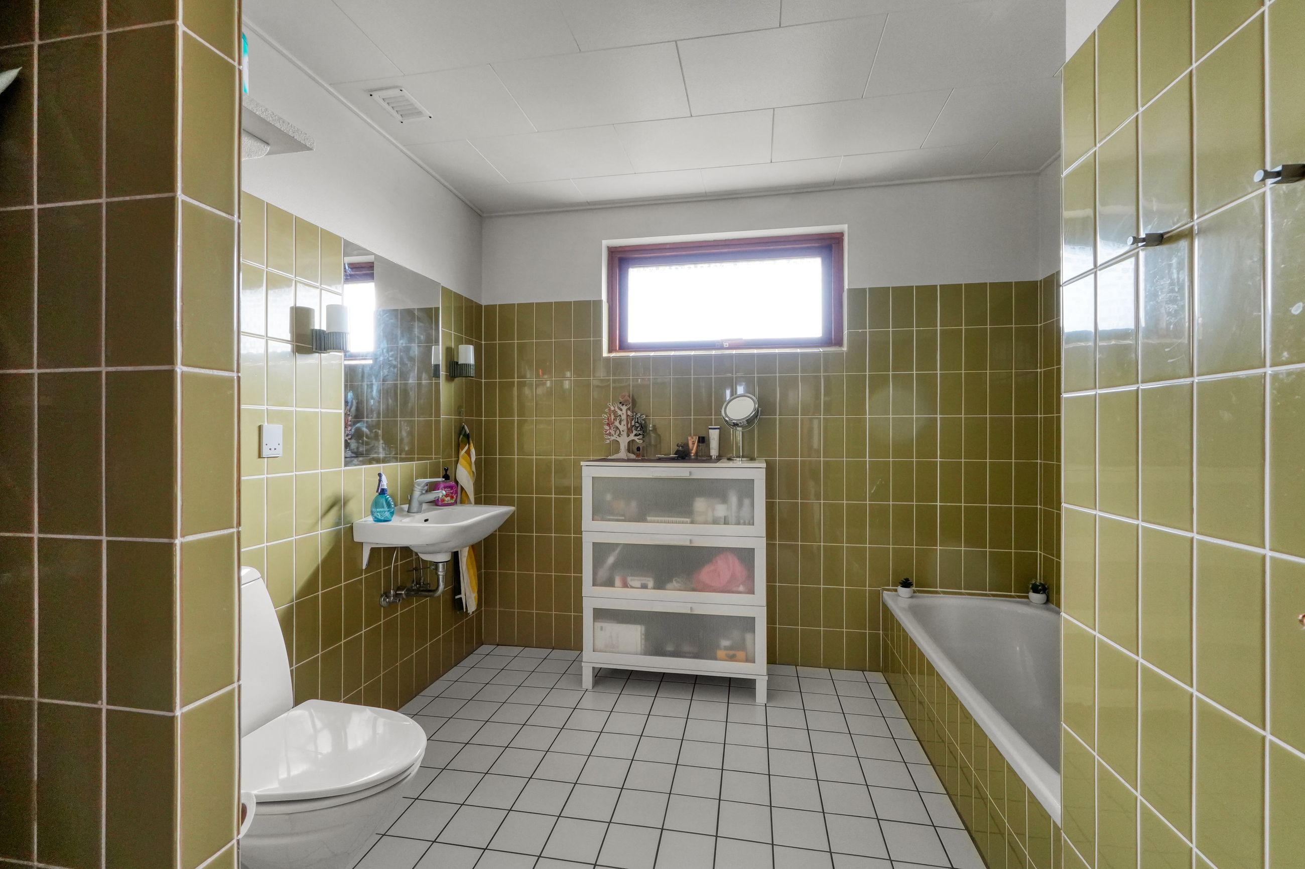 Badeværelse med både kar og brus, gæstetoilet – begge med gulvvarme