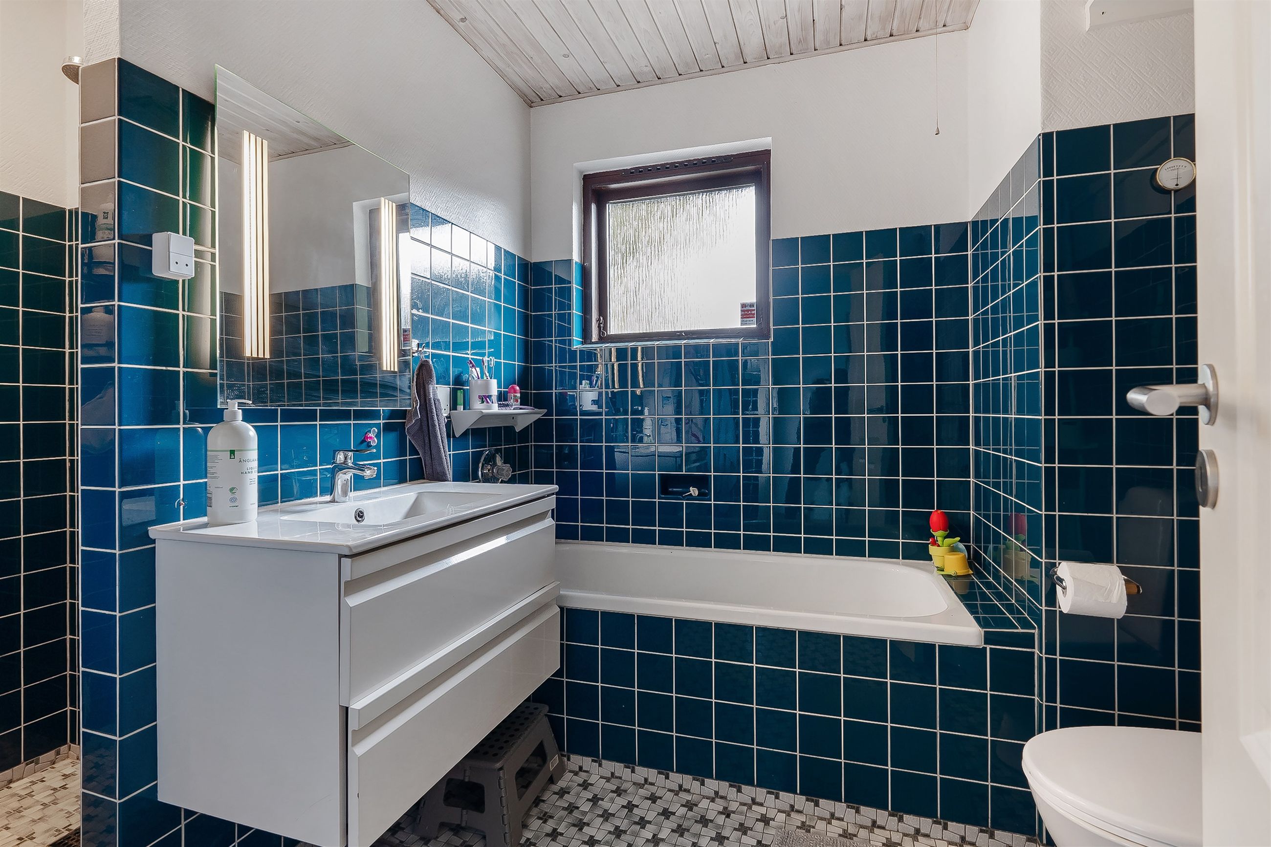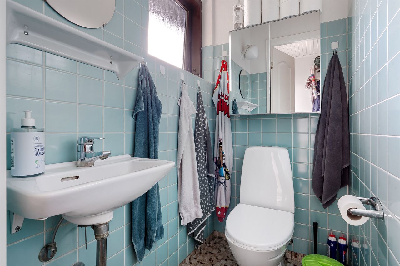 Gæstetoilet, samt stort badeværelse med gulvvarme, karbad og brus