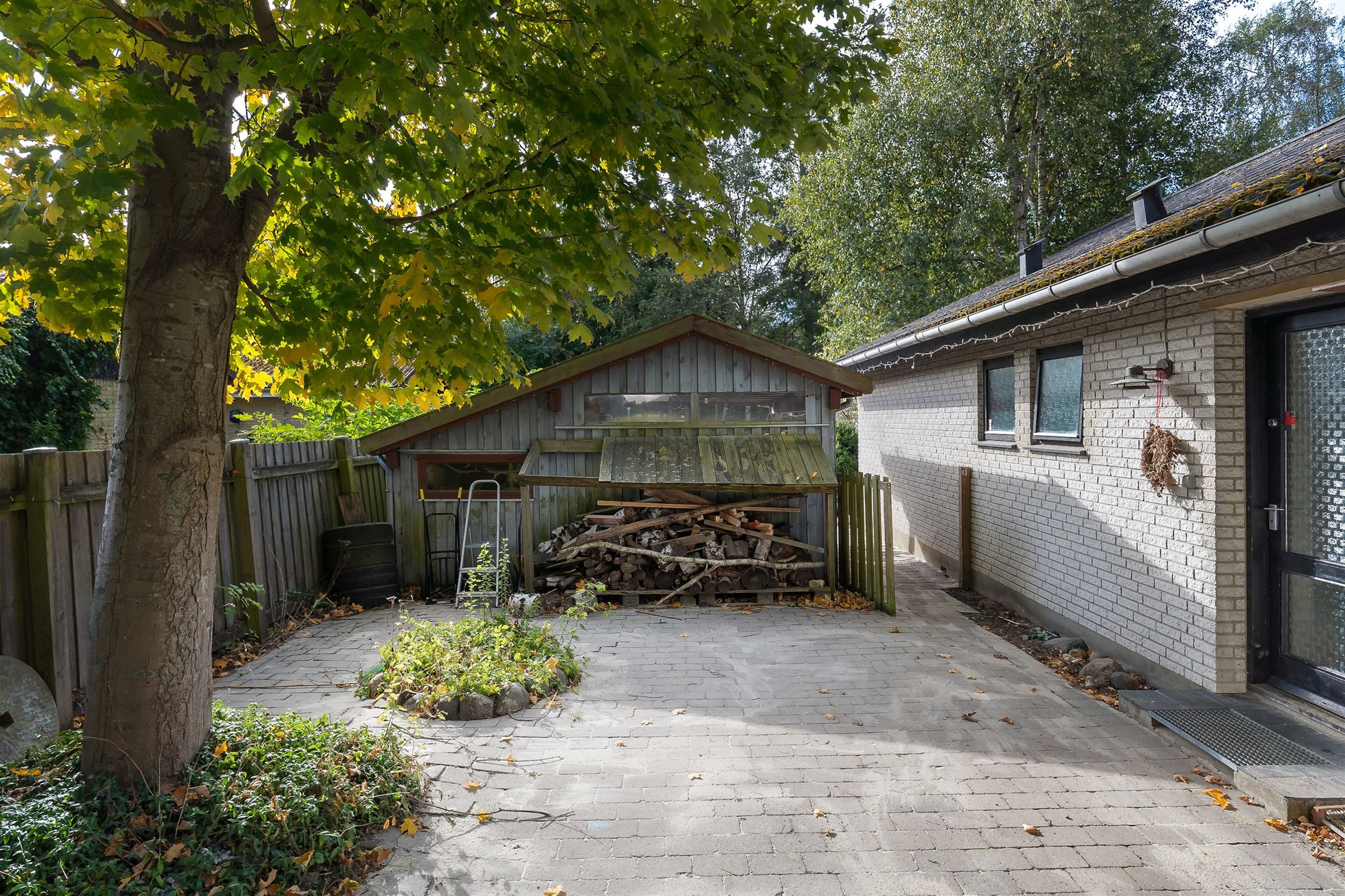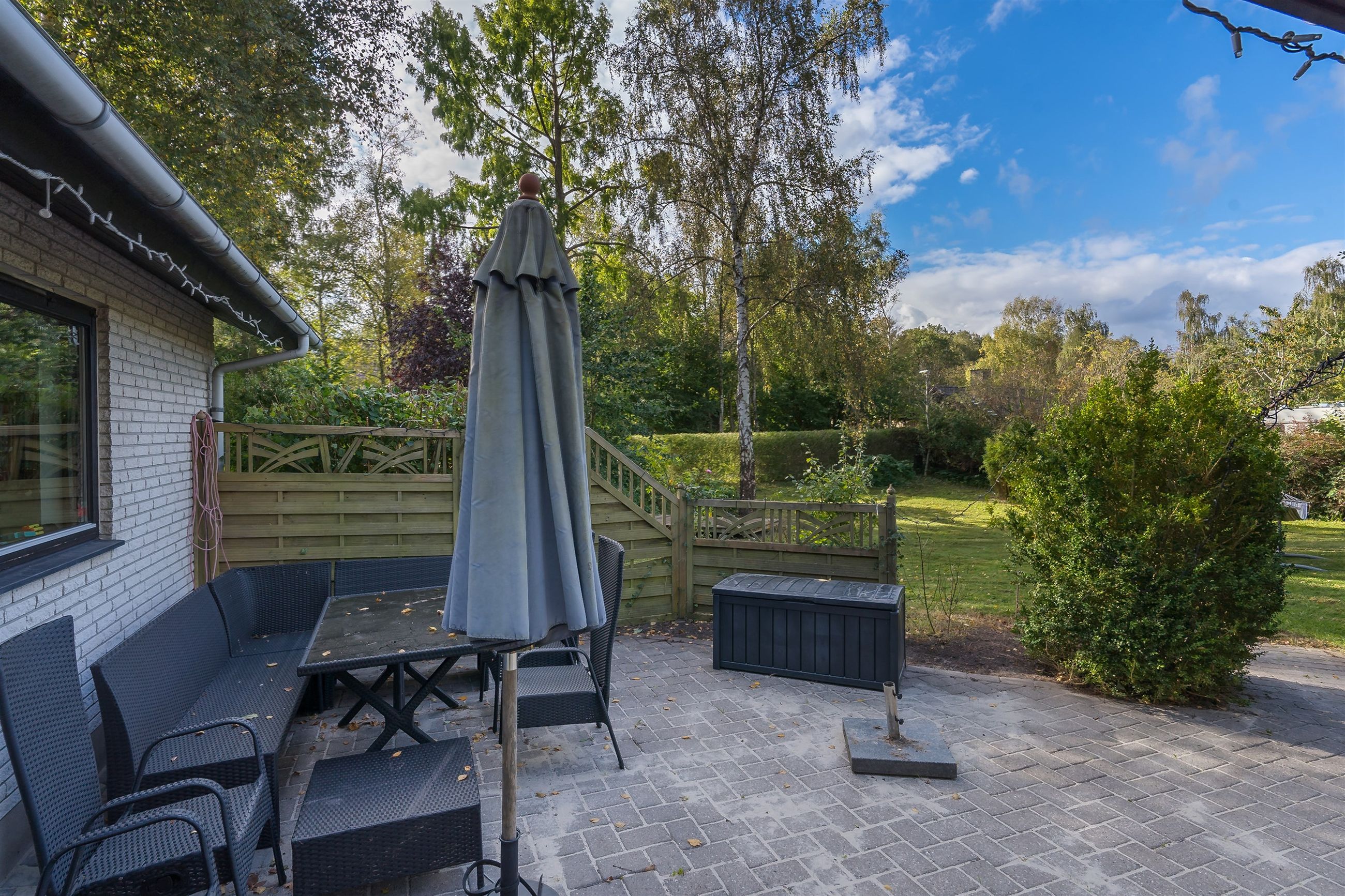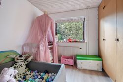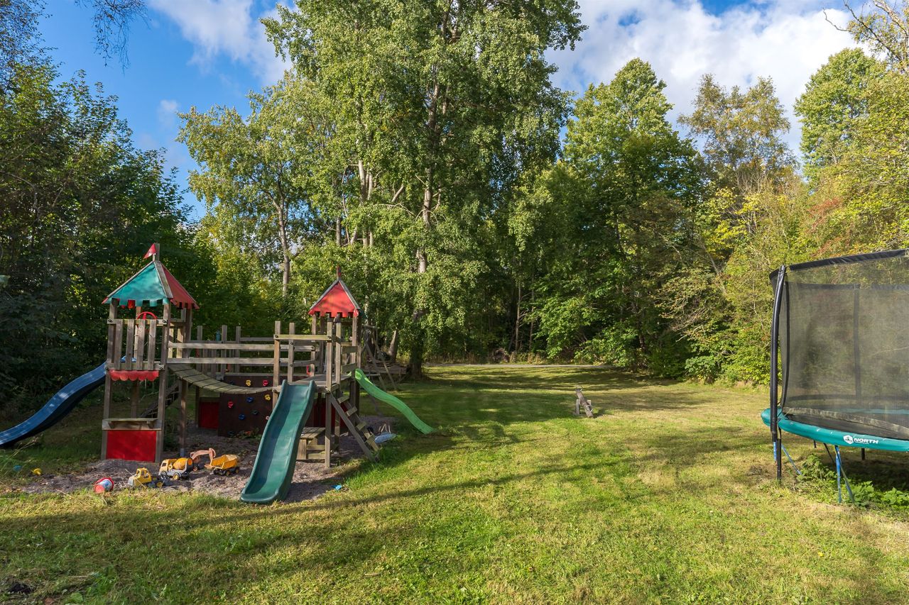 Udenfor venter en stor, eventyrlig have, hvor både børn og voksne kan udfolde sig. Den solrige fliseterrasse i forlængelse af udestuen danner rammen om hyggelige grill-aftener, mens det tilstødende jordstykke med legestativ, gynge og en lille fårestald giver ekstra charme og plads til aktiviteter.