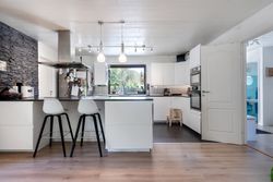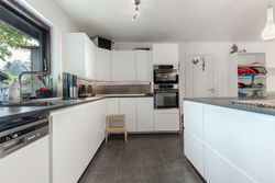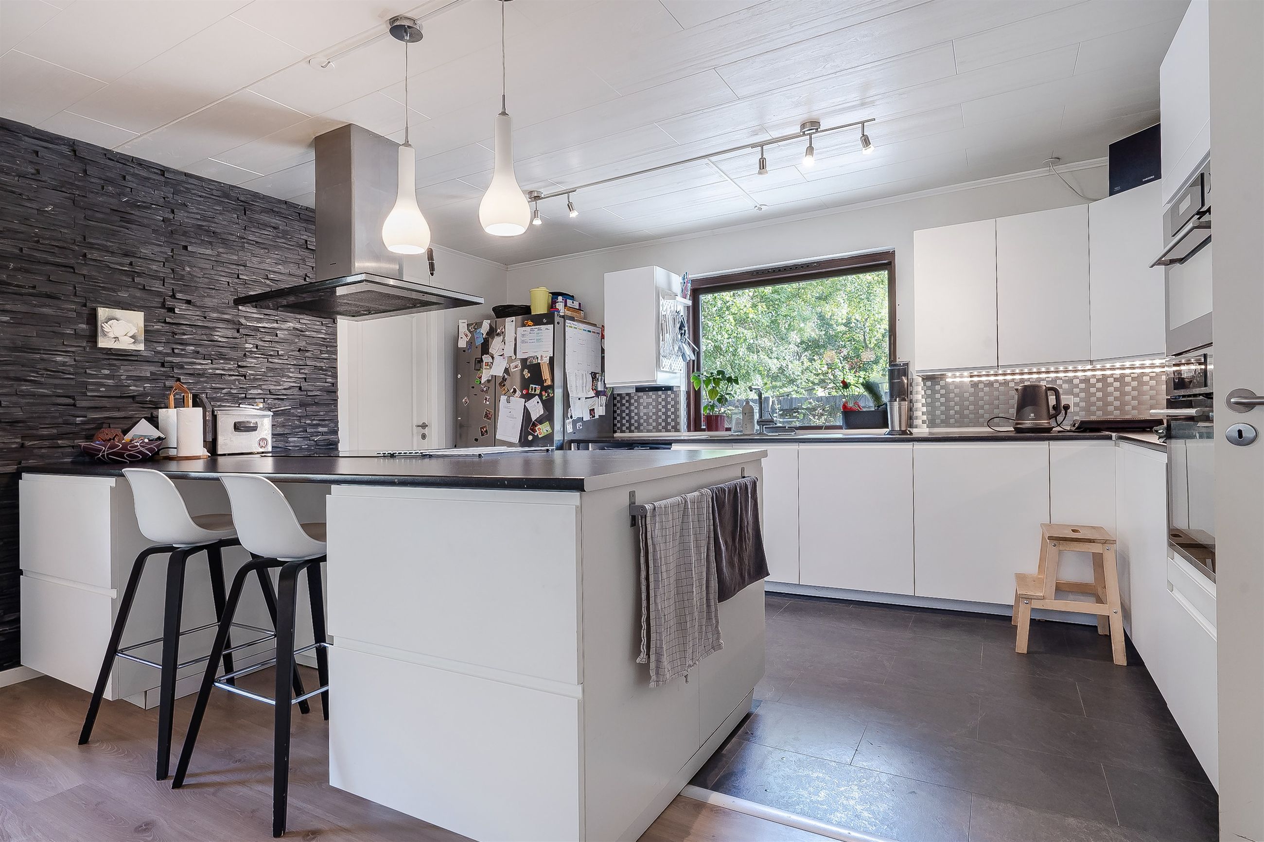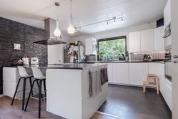 Et imponerende køkkenalrum med moderne køkken fra 2017 og stor køkken-ø – familiens naturlige samlingspunkt