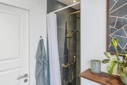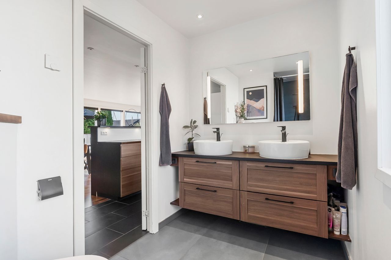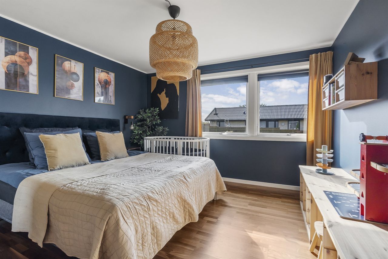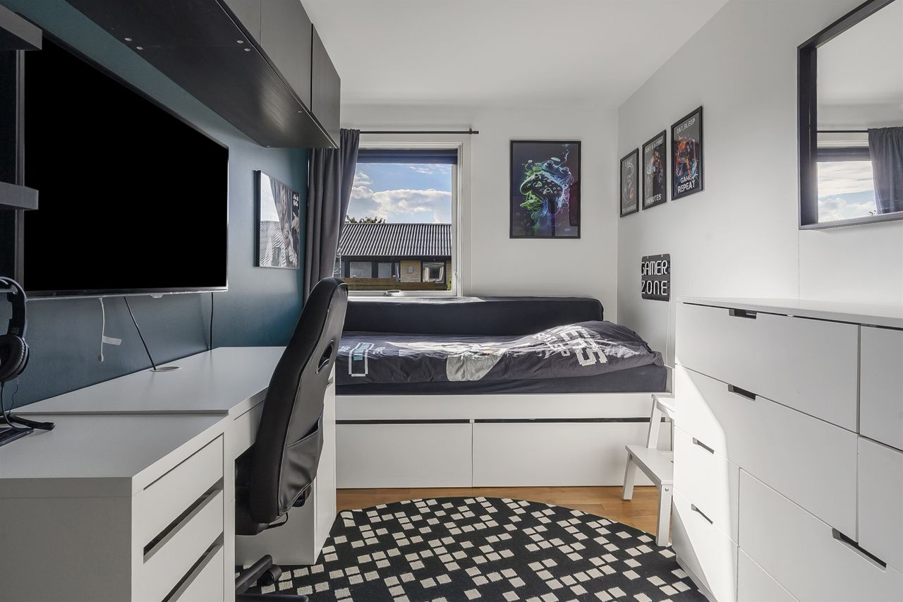 Langs fordelingsgangen finder I tre gode værelser, ideelle til børn, gæster eller kontor – samt to moderne badeværelser, så morgenrutinen glider problemfrit.