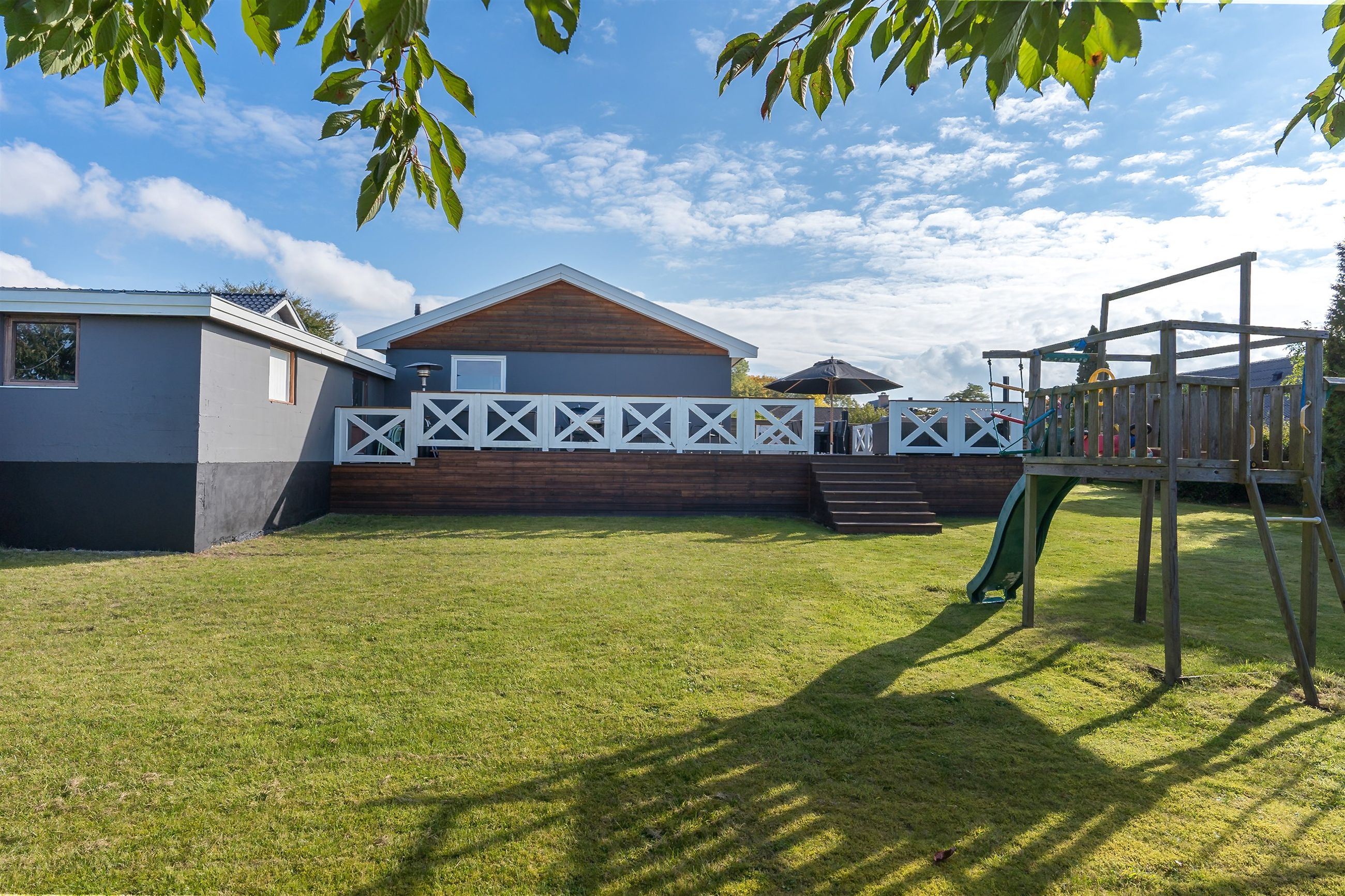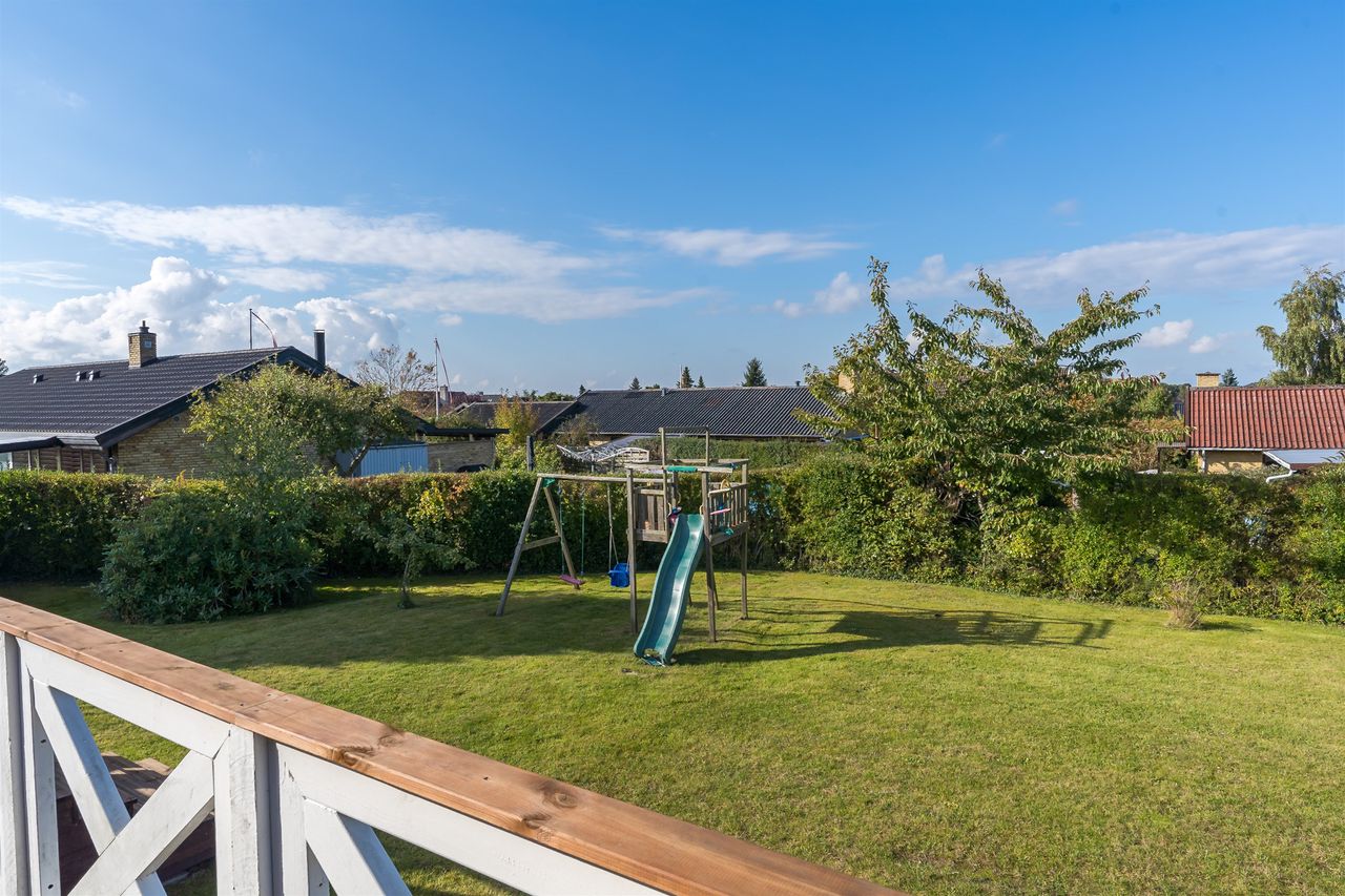 Udenfor venter en enorm sydvendt have på hele 971 m2, hvor grunden falder let mod nabolaget og skaber en helt særlig fornemmelse af udsigt og luft. Her får I plads til både leg, afslapning og drømme – og med grundens størrelse ligger der en åben mulighed for at bygge ud eller tilføje ekstra funktioner i fremtiden.