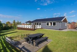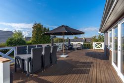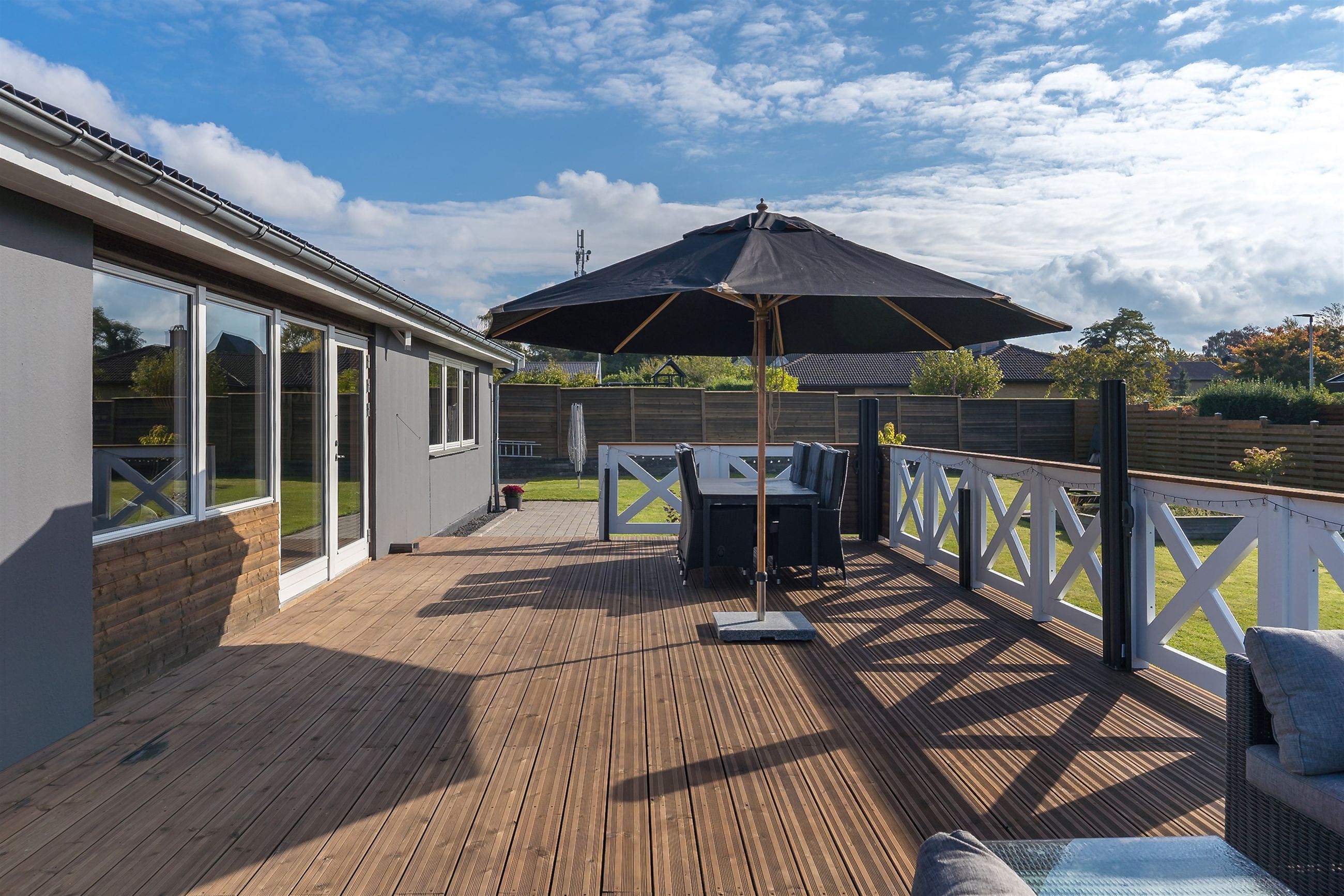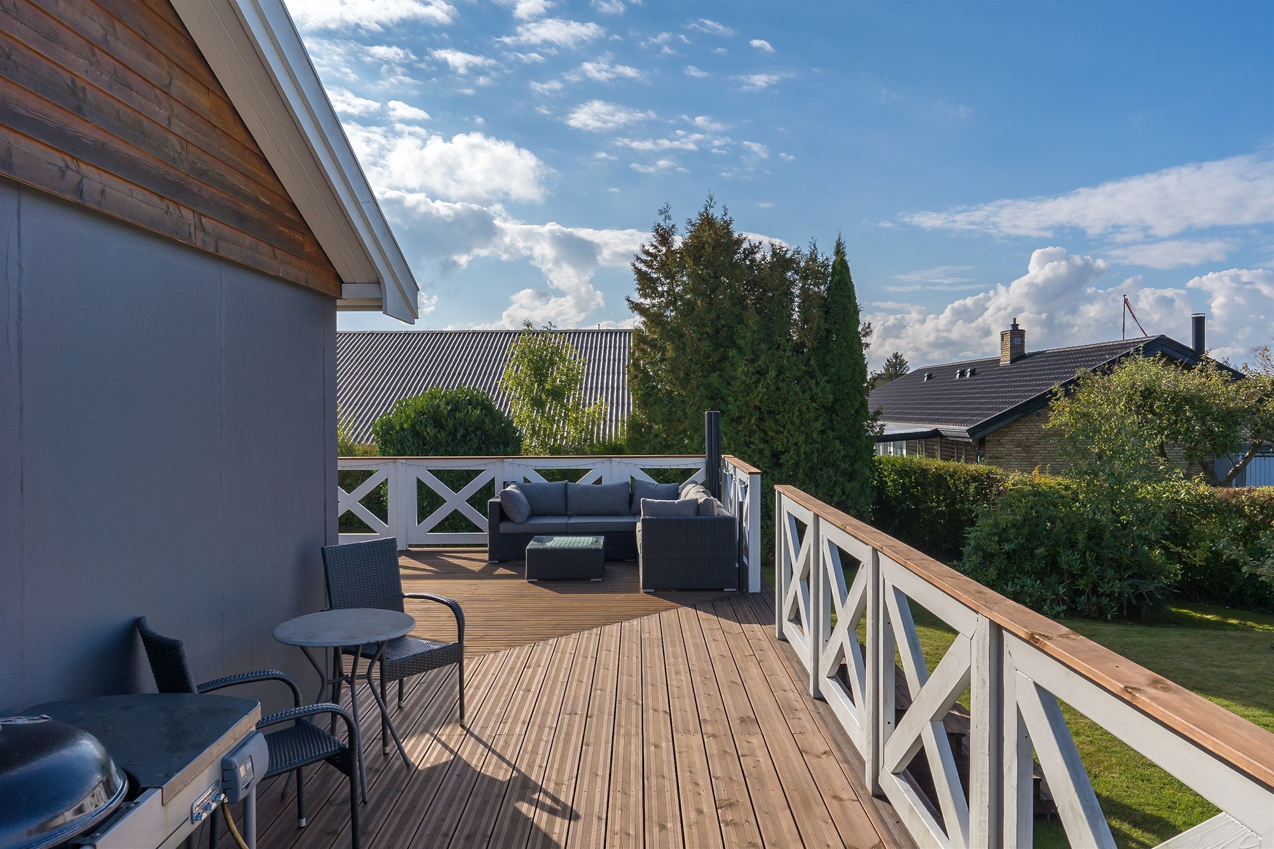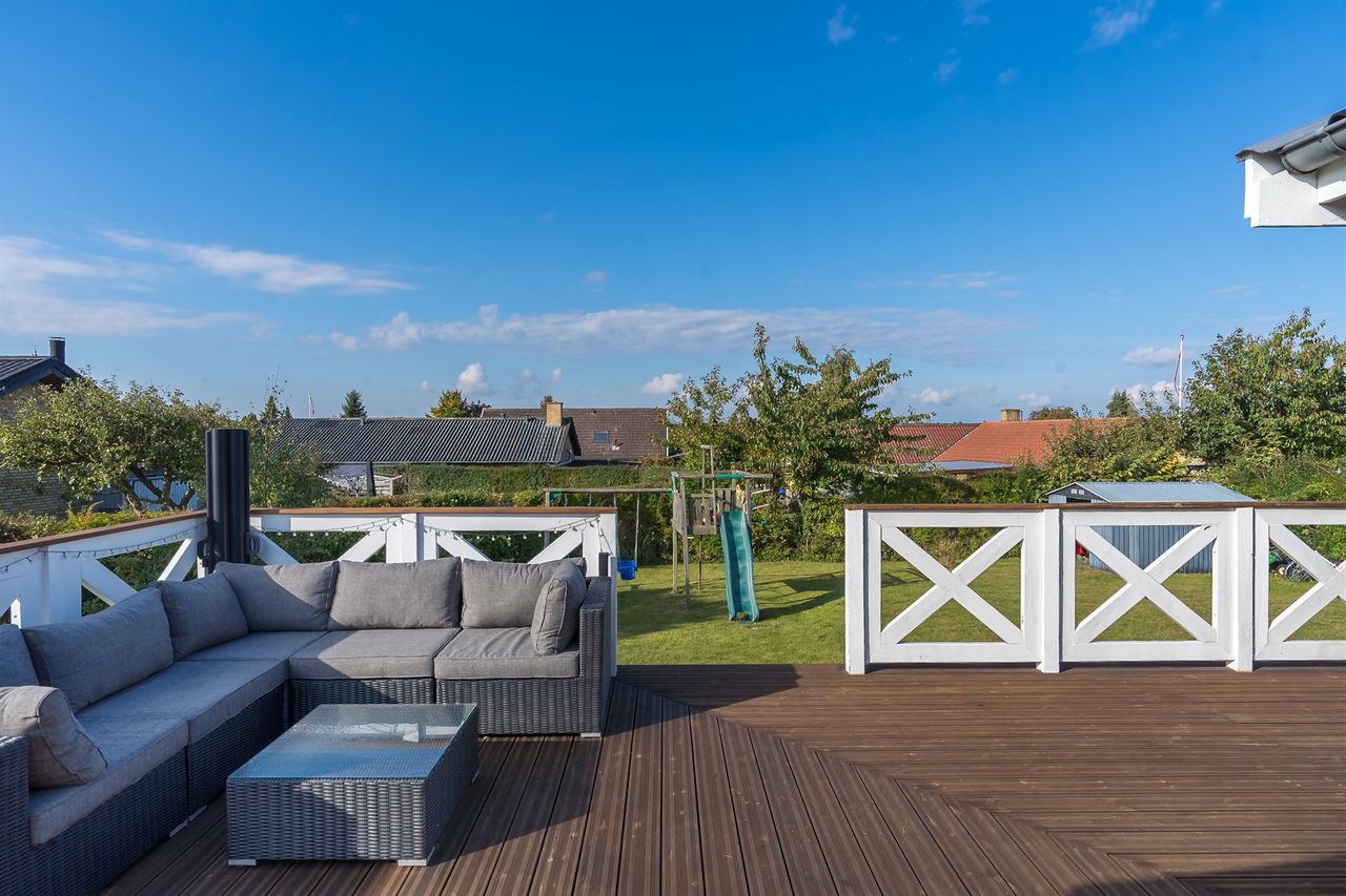 På den store træterrasse, der hæver sig over terrænet, kan I nyde sommeraftener med røde solnedgange, grill og godt selskab. Derudover får I en stor garage med strøm og egen eltavle – oplagt som værksted, hobbyrum eller ekstra opbevaring.