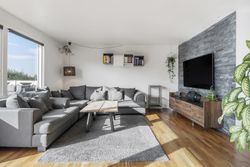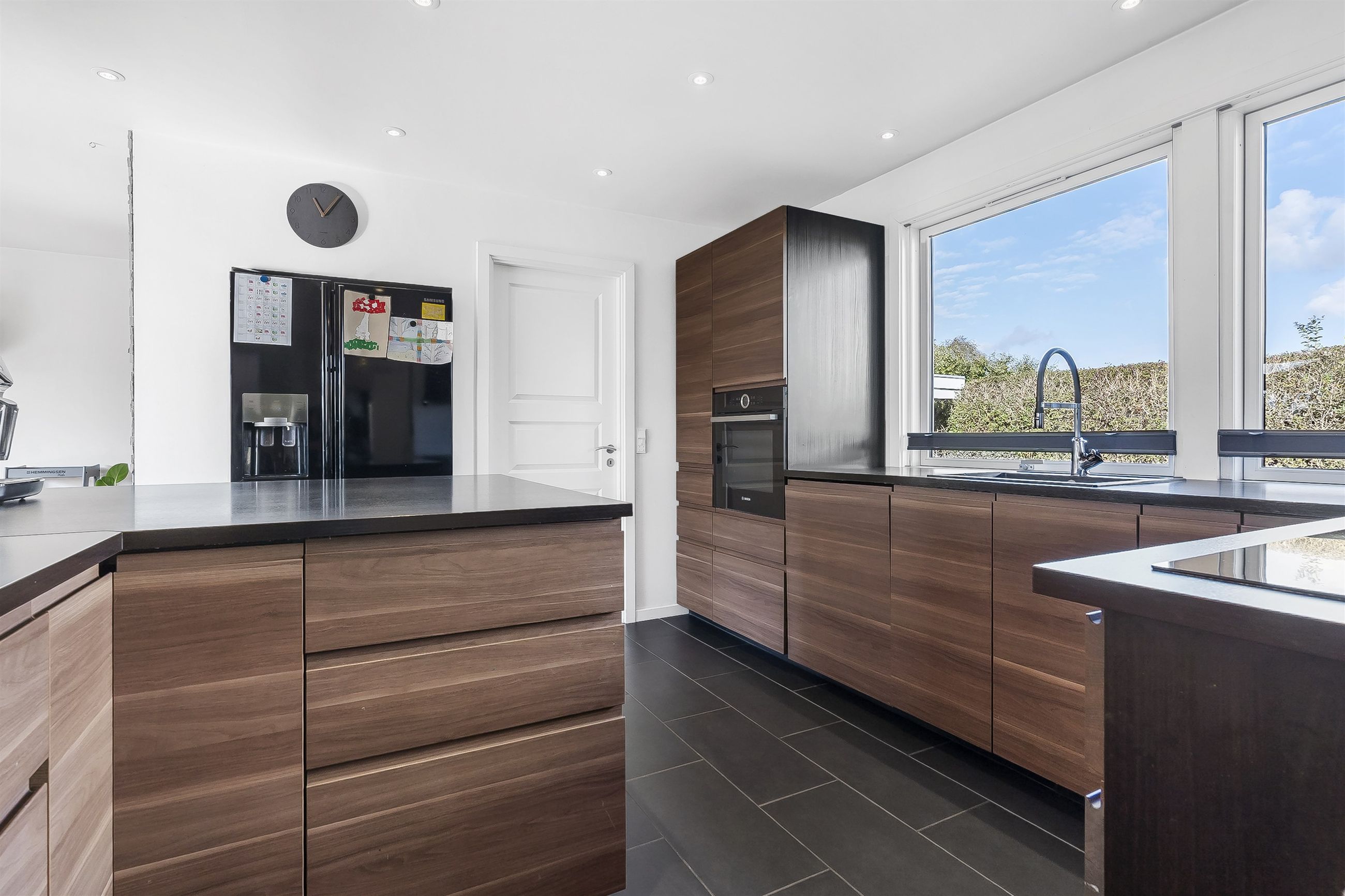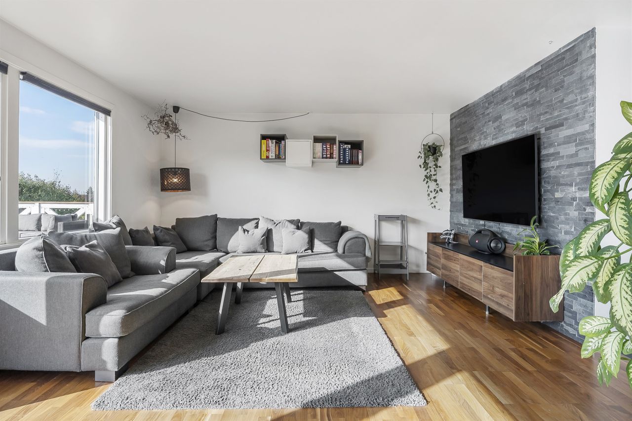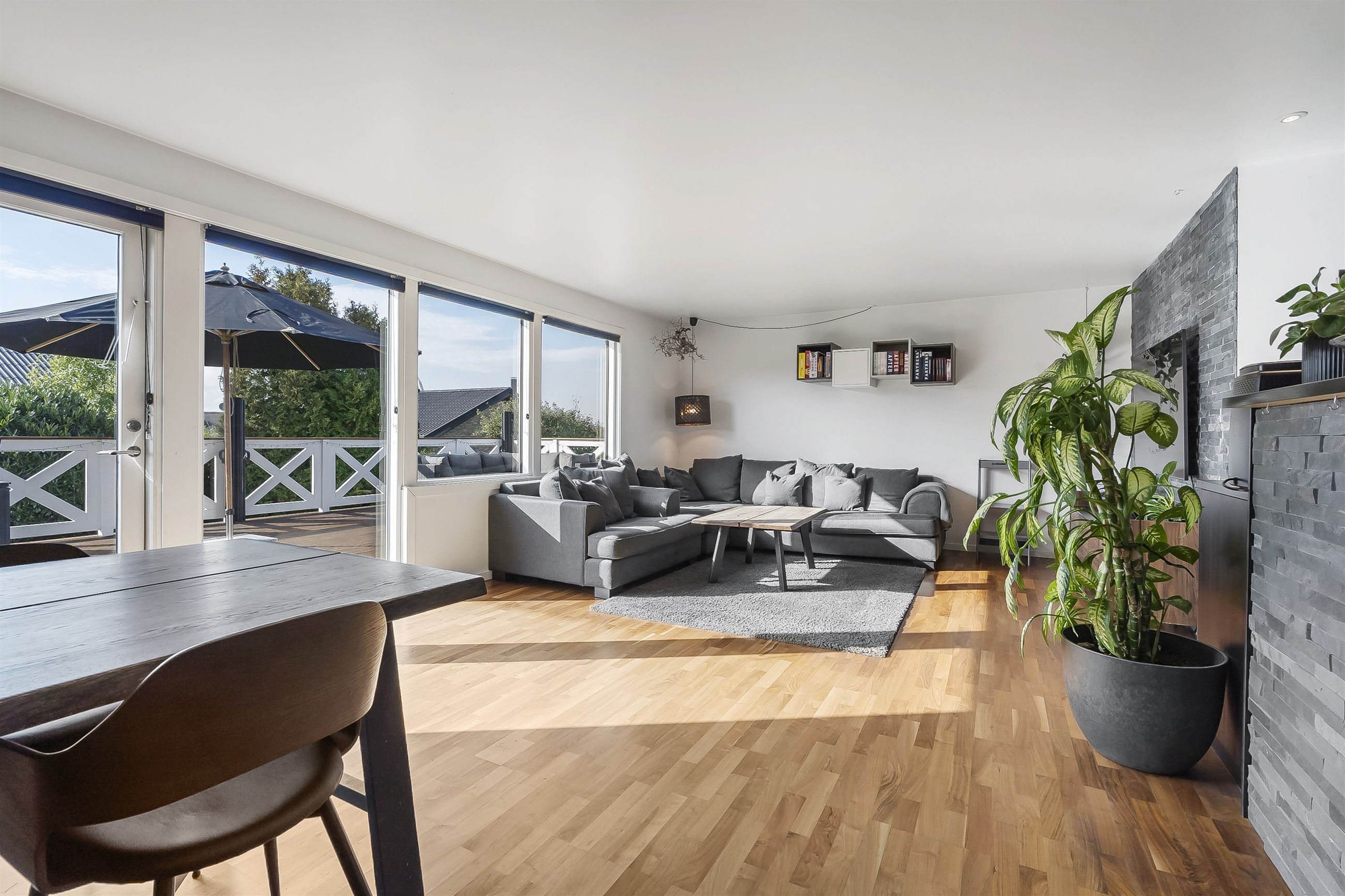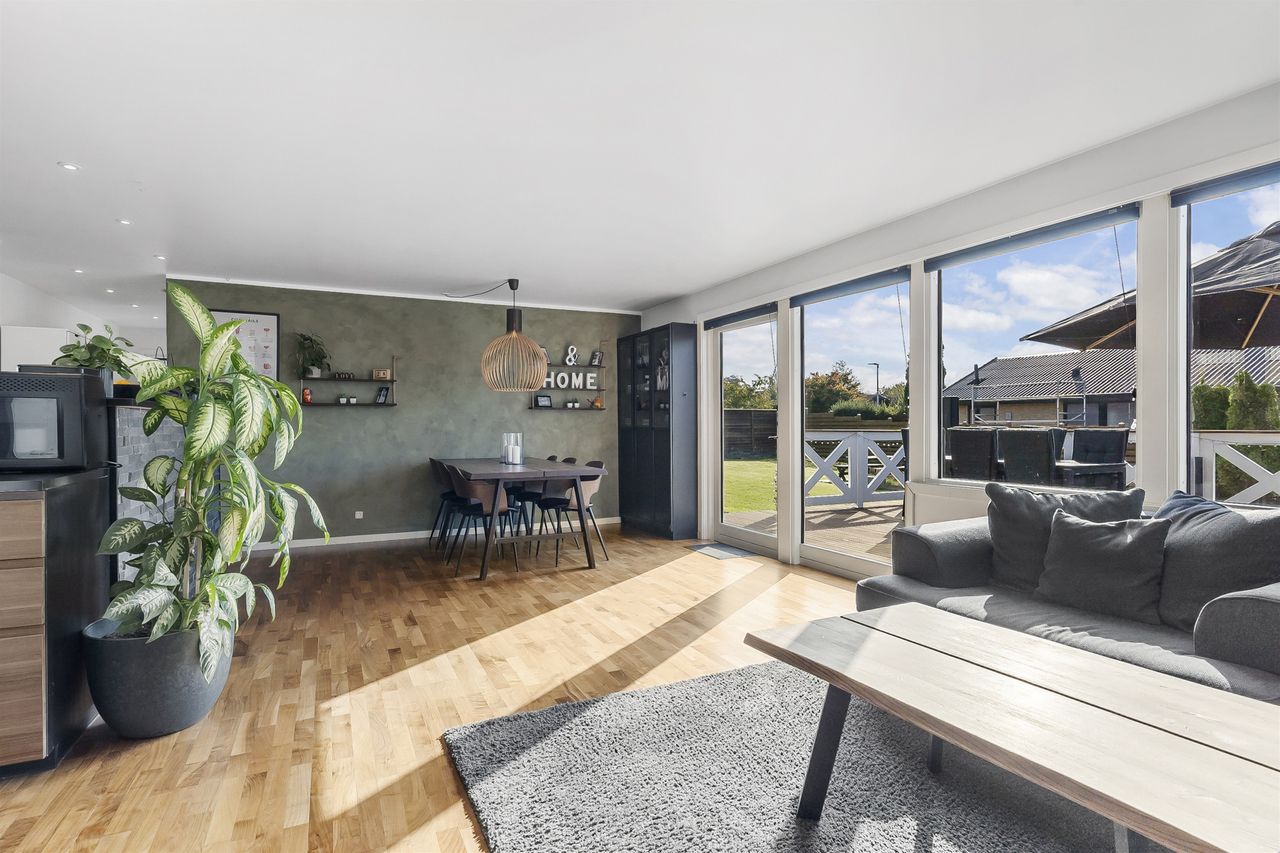 Den rummelige stue giver plads til både spiseområde og sofahjørne – og med de store vinduespartier og døren direkte ud til terrassen, smelter ude og inde naturligt sammen i sommermånederne. Herfra får I en fantastisk udsigt over haven og det højtliggende terræn, der giver et luftigt og lyst udtryk i hele boligen.