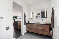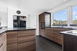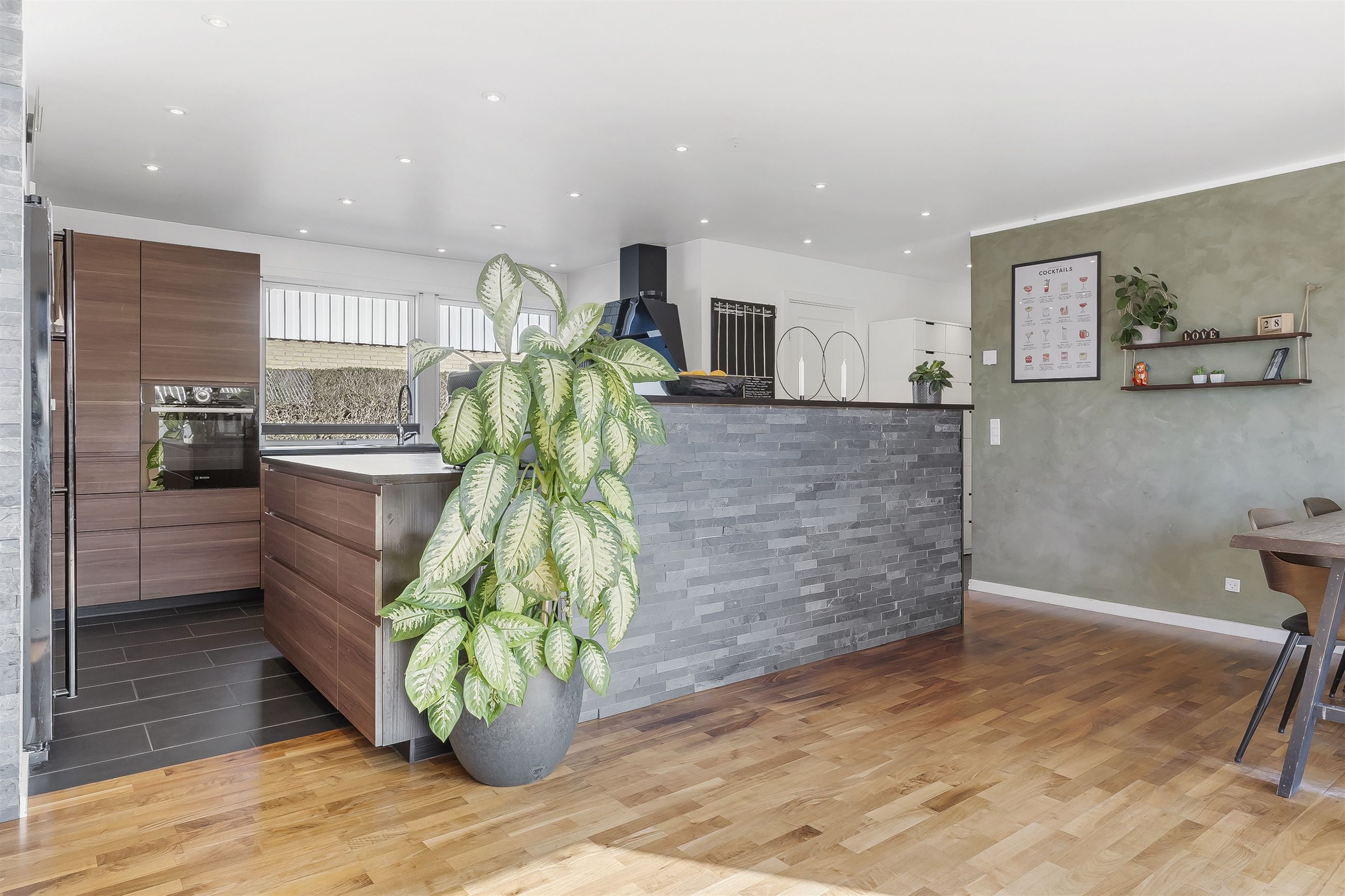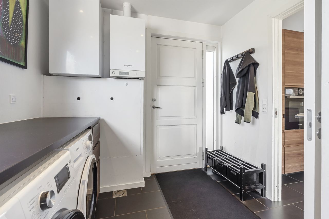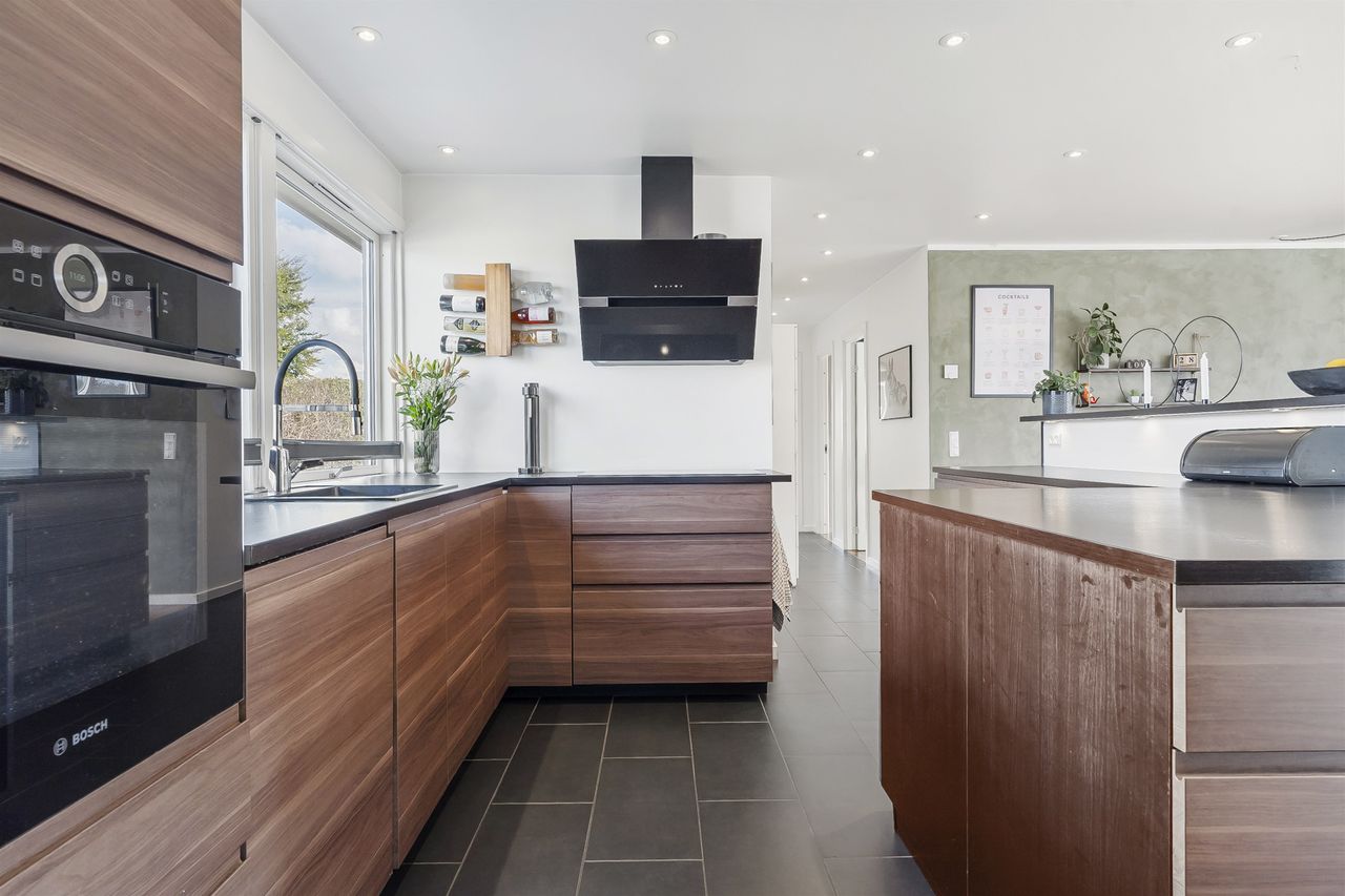 Indenfor mødes I af et praktisk bryggers, der fungerer som hverdagens indgang – perfekt til flyverdragter, sko og tasker. Herfra træder I ind i hjemmets hjerte: det store køkkenalrum, hvor familiens samvær står i centrum. Køkkenet er indrettet med god bordplads, rigelig opbevaring og en stor køkkenø, der samler både madlavning, lektier og småkagebagning på tværs af generationer.