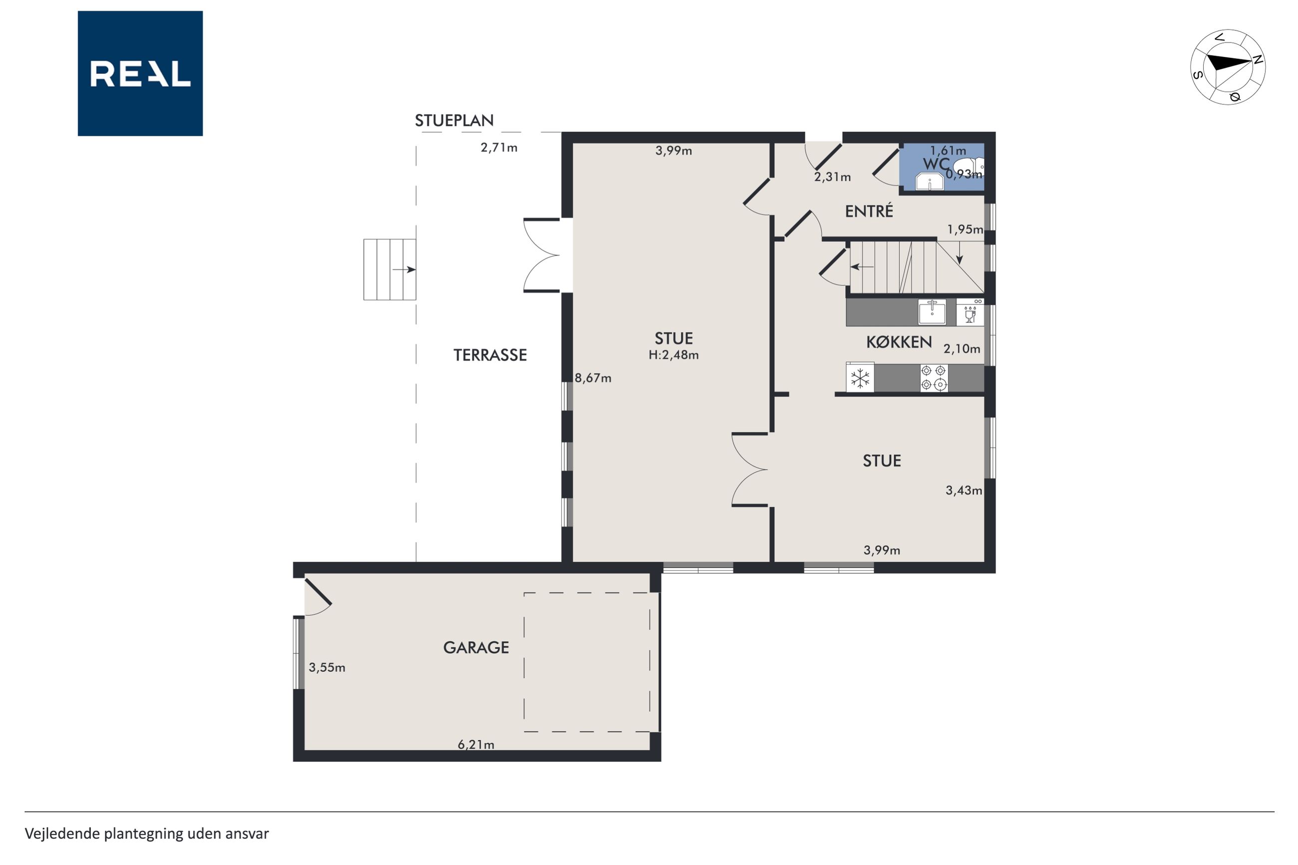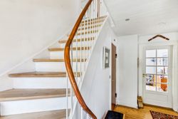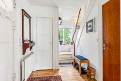 I stueetagen finder du en rummelig entré, et mindre gæstetoilet samt et køkken, som nemt kan åbnes op mod den tilstødende spisestue, hvis man ønsker et mere åbent plan. Den store stue har god plads til både spise- og opholdsområde, og herfra er der direkte udgang til en solrig terrasse med udsigt over den velholdte have.