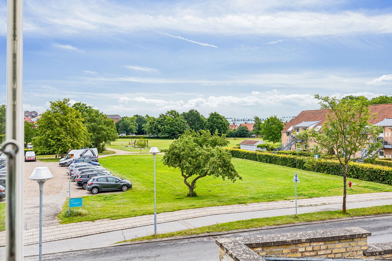 Ejendommen har en attraktiv placering blot få skridt fra Østergade, hvor byens mange butikker, caféer og specialforretninger ligger. Skulle du få lyst til endnu mere shopping, ligger Sillebroen Shopping center i gåafstand. Samtidig har du en skøn udsigt over det grønne område ved Bløden – en sjælden kombination af byliv og naturskønne omgivelser.