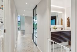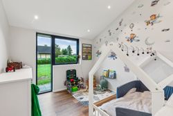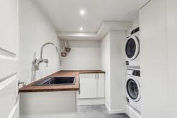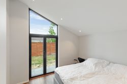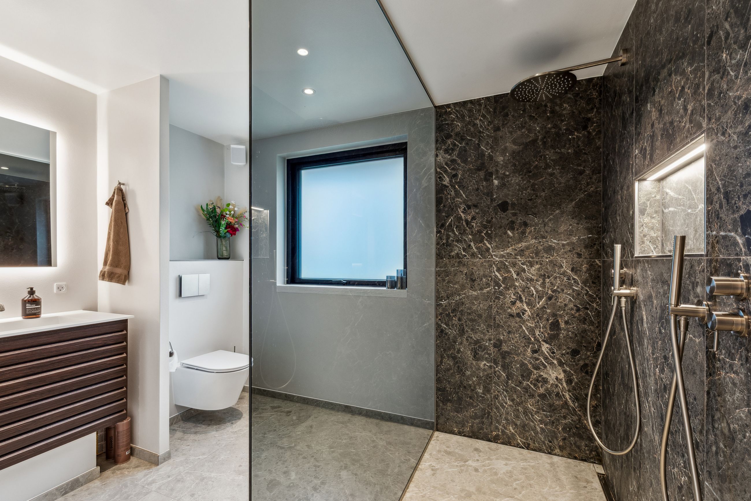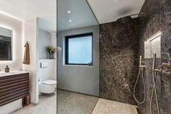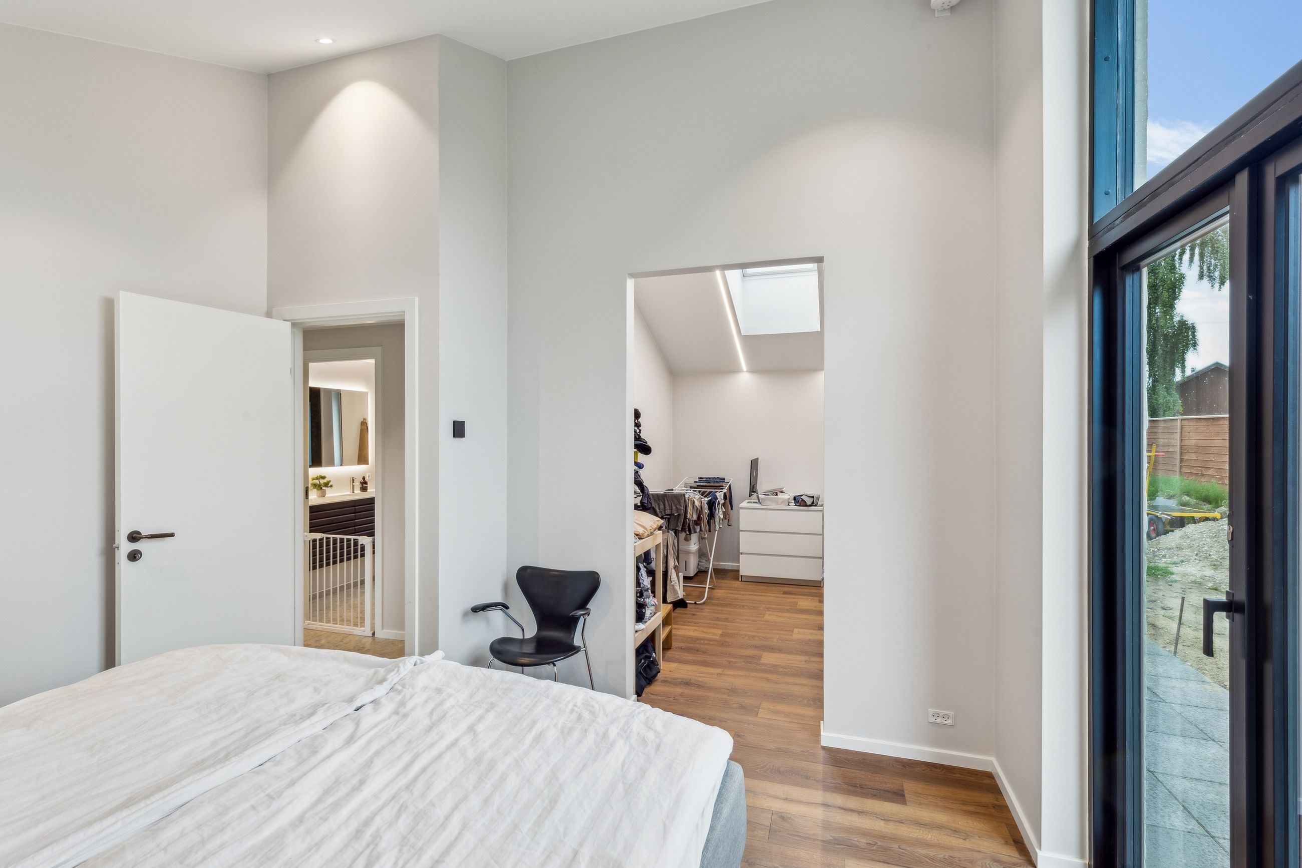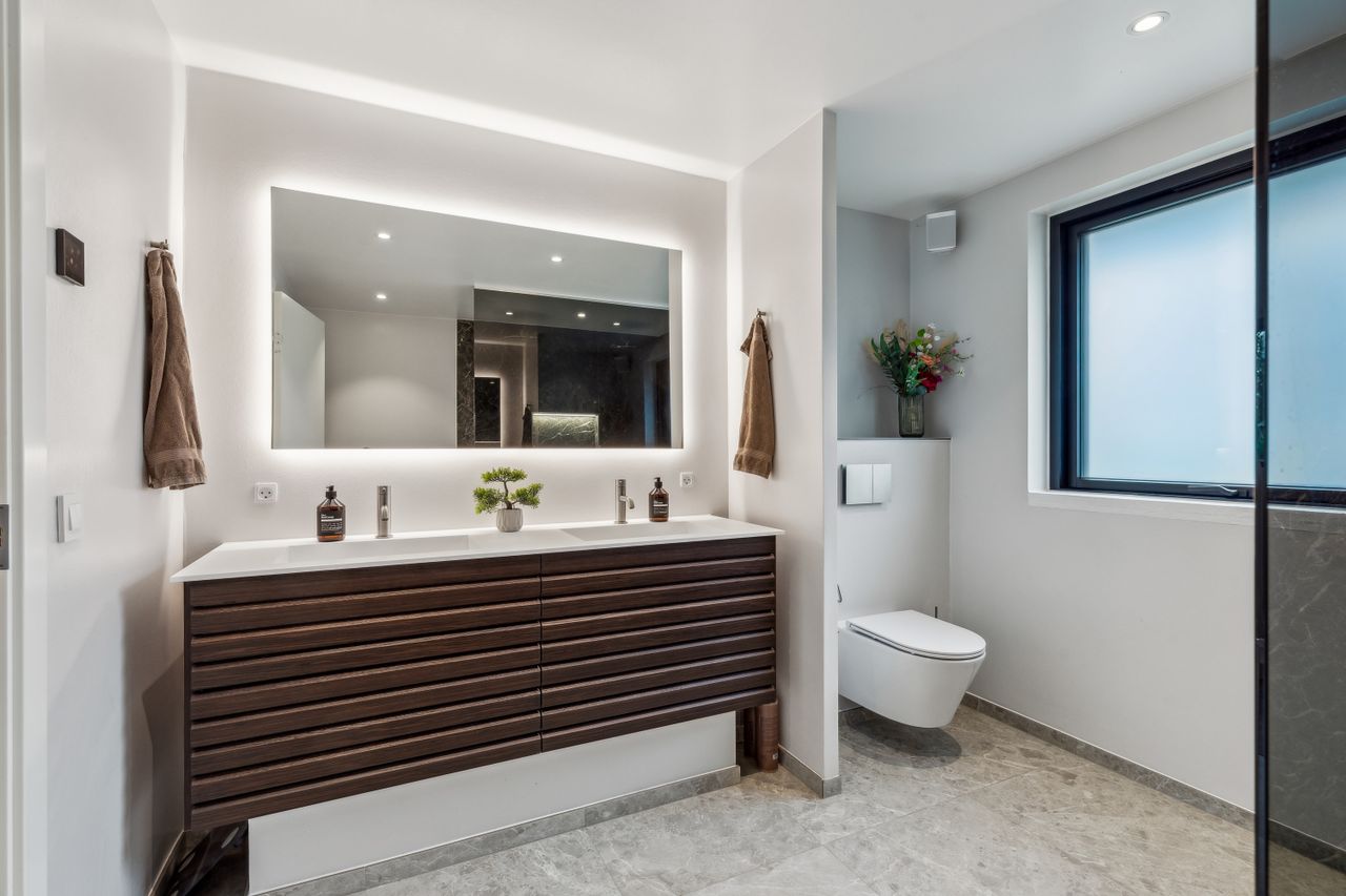 Badeværelset er i en klasse for sig. Her er der skabt en lille oase, der med sin rummelige dobbeltbrus og lækre materialer mest af alt minder om et eksklusivt spaophold. Derudover rummer stueplanet to gode værelser, hvoraf forældreafdelingen har direkte adgang til sit eget walk-in-område – en luksuriøs og praktisk detalje i en travl hverdag.