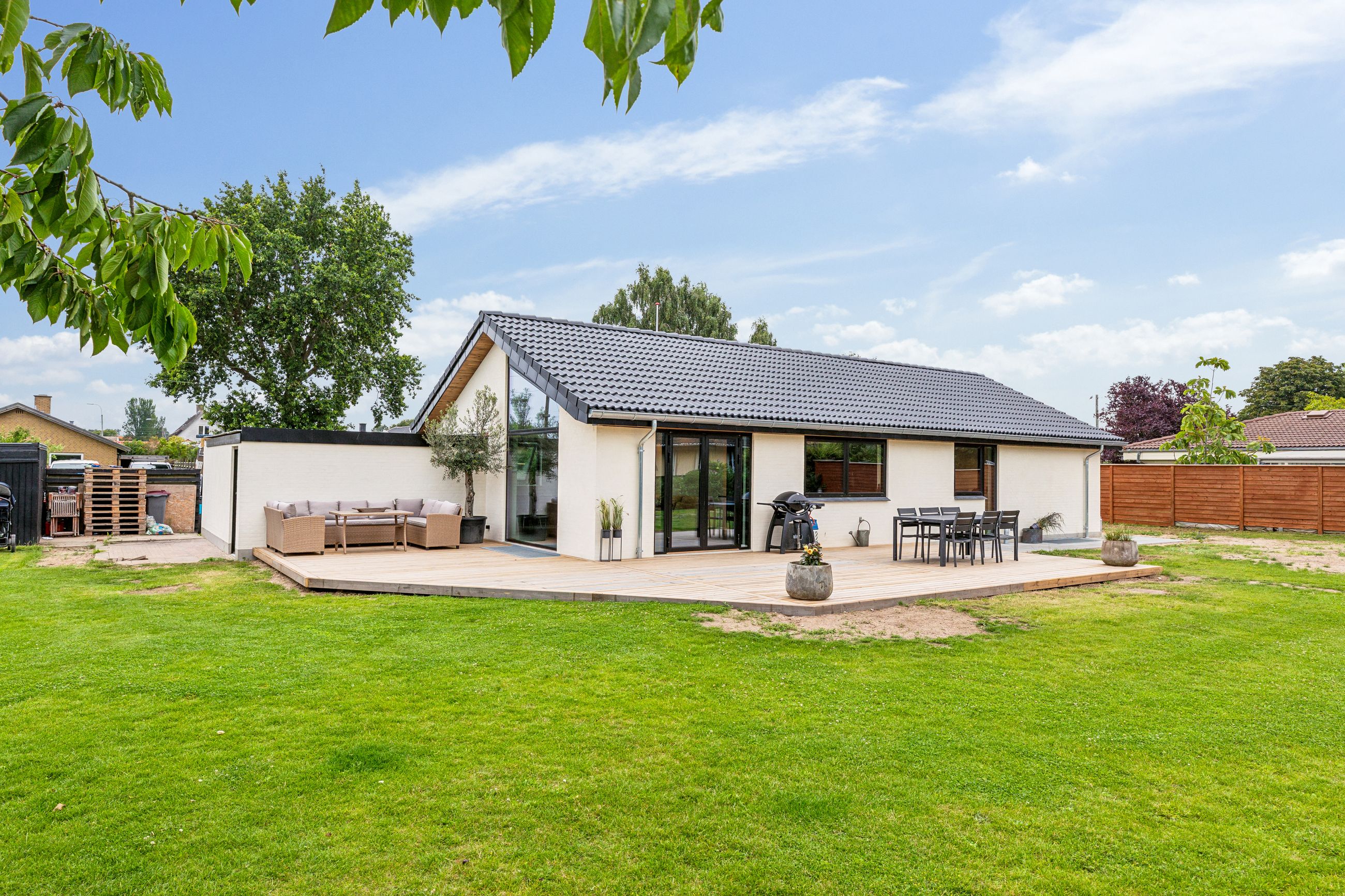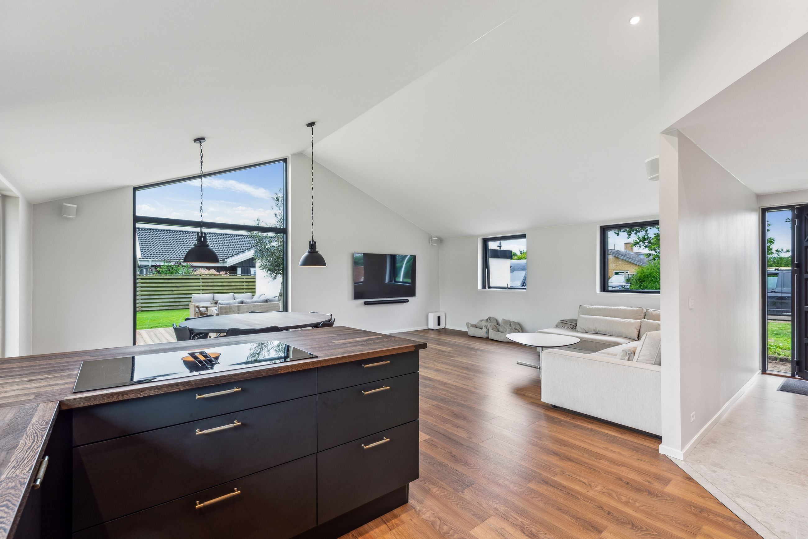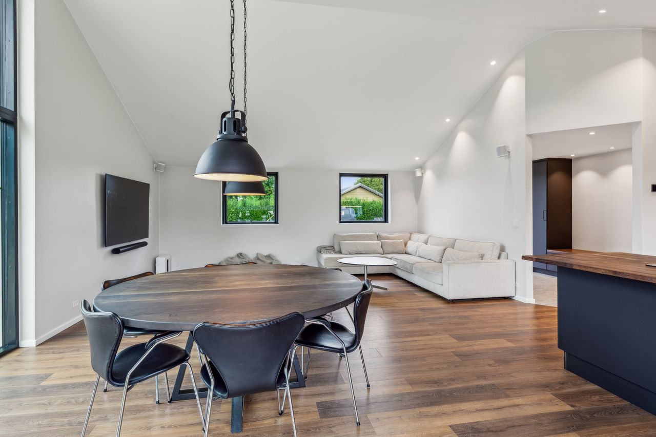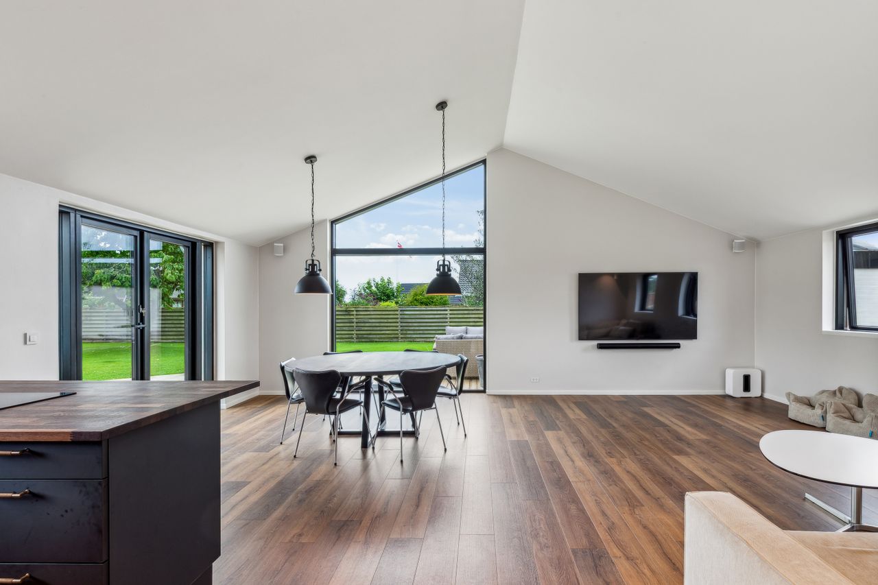 Når du træder indenfor, mødes du af en rummelig og indbydende entré, der giver adgang til boligens hjerte – et stilfuldt og lyst køkken-alrum med god plads til hele familien. Her er indretningen gennemtænkt og moderne, og fra alrummet er der direkte udgang til en vestvendt have, hvor solen kan nydes fra morgen til aften. Det skaber en naturlig sammenhæng mellem inde- og udeliv, perfekt til både afslapning og hyggelige stunder med gæster.