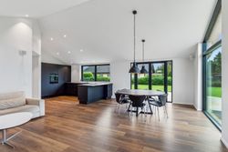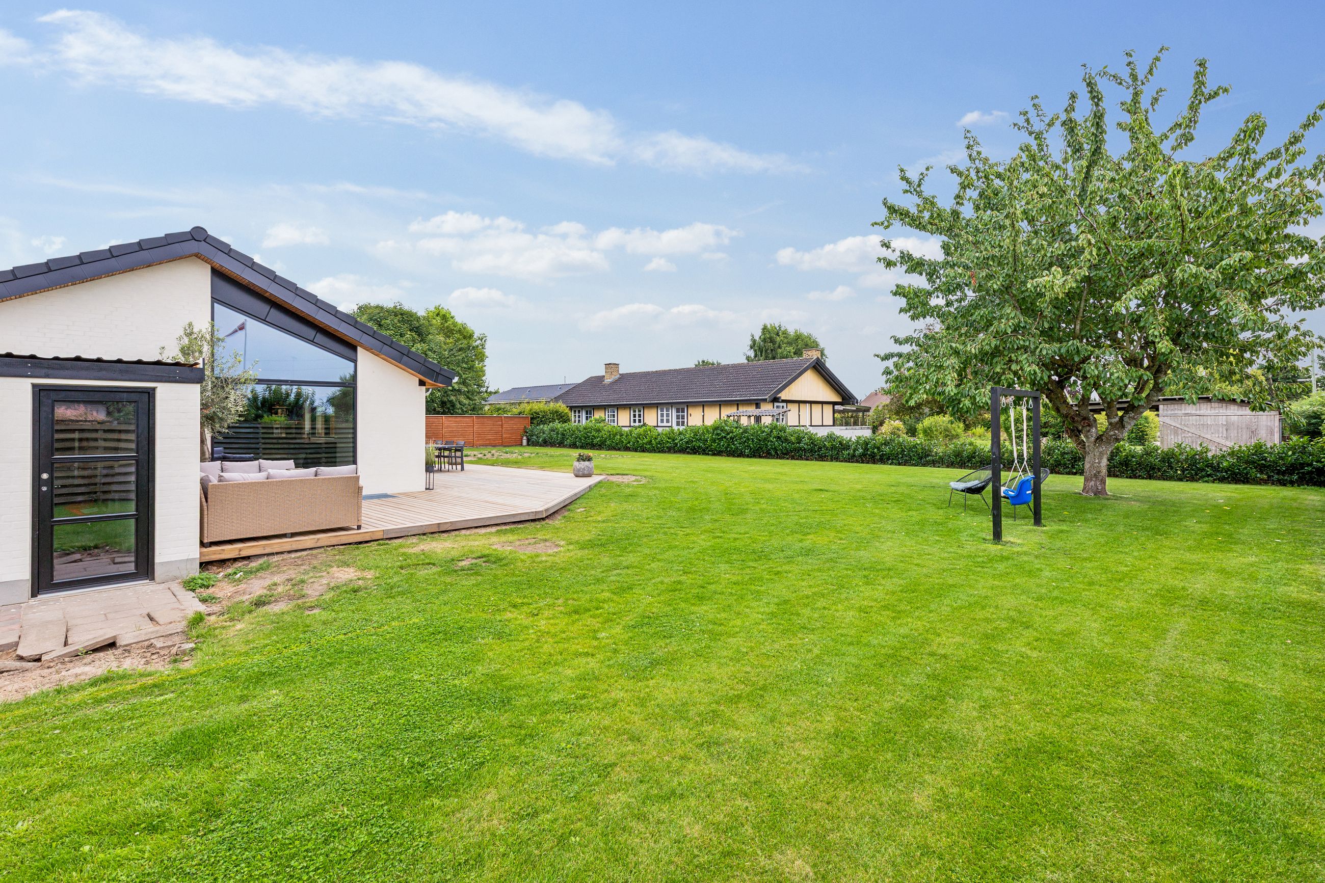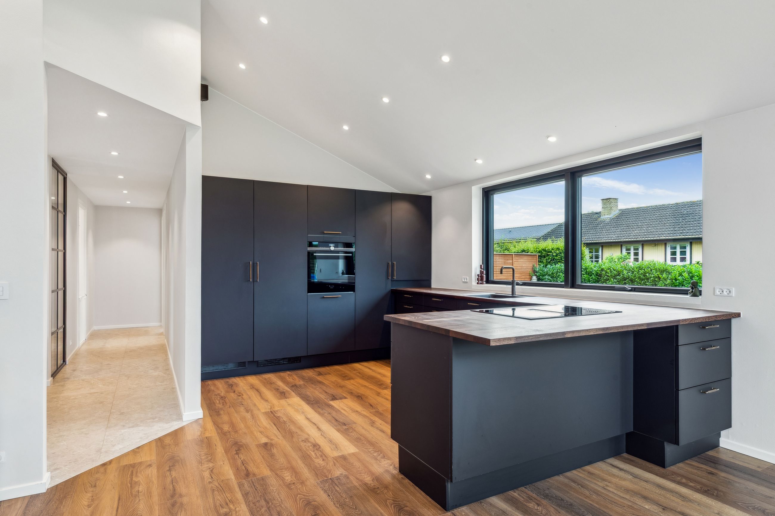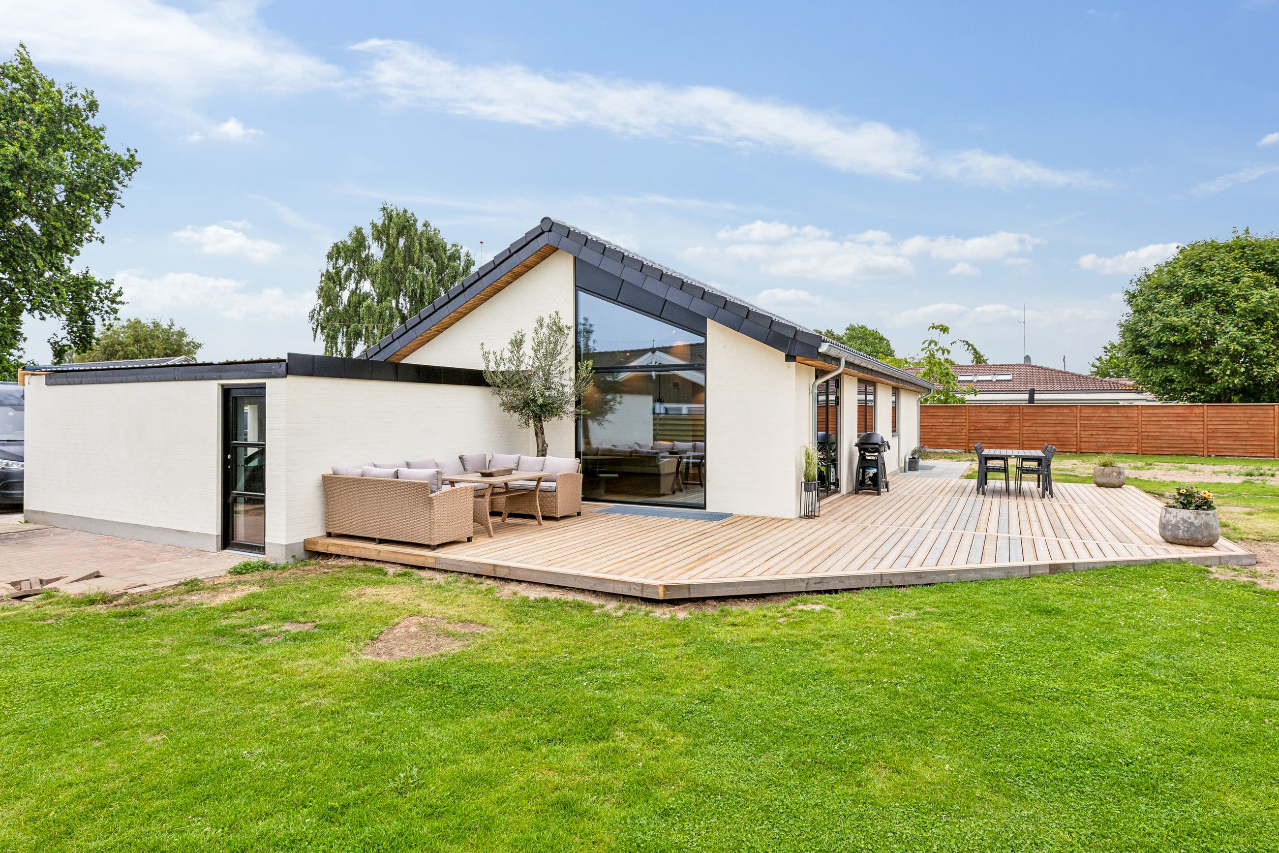 Når du træder indenfor, mødes du af en rummelig og indbydende entré, der giver adgang til boligens hjerte – et stilfuldt og lyst køkken-alrum med god plads til hele familien. Her er indretningen gennemtænkt og moderne, og fra alrummet er der direkte udgang til en vestvendt have, hvor solen kan nydes fra morgen til aften. Det skaber en naturlig sammenhæng mellem inde- og udeliv, perfekt til både afslapning og hyggelige stunder med gæster.