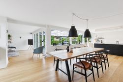 Husets hjerte er uden tvivl det store køkken-alrum i åben forbindelse med stuen. Det moderne køkken med god skabsplads står skarpt og tidssvarende, mens de store glaspartier ud mod haven giver et fantastisk lysindfald. Her er der plads til både hverdagens samvær og de store middage, når familie og venner samles.