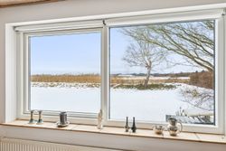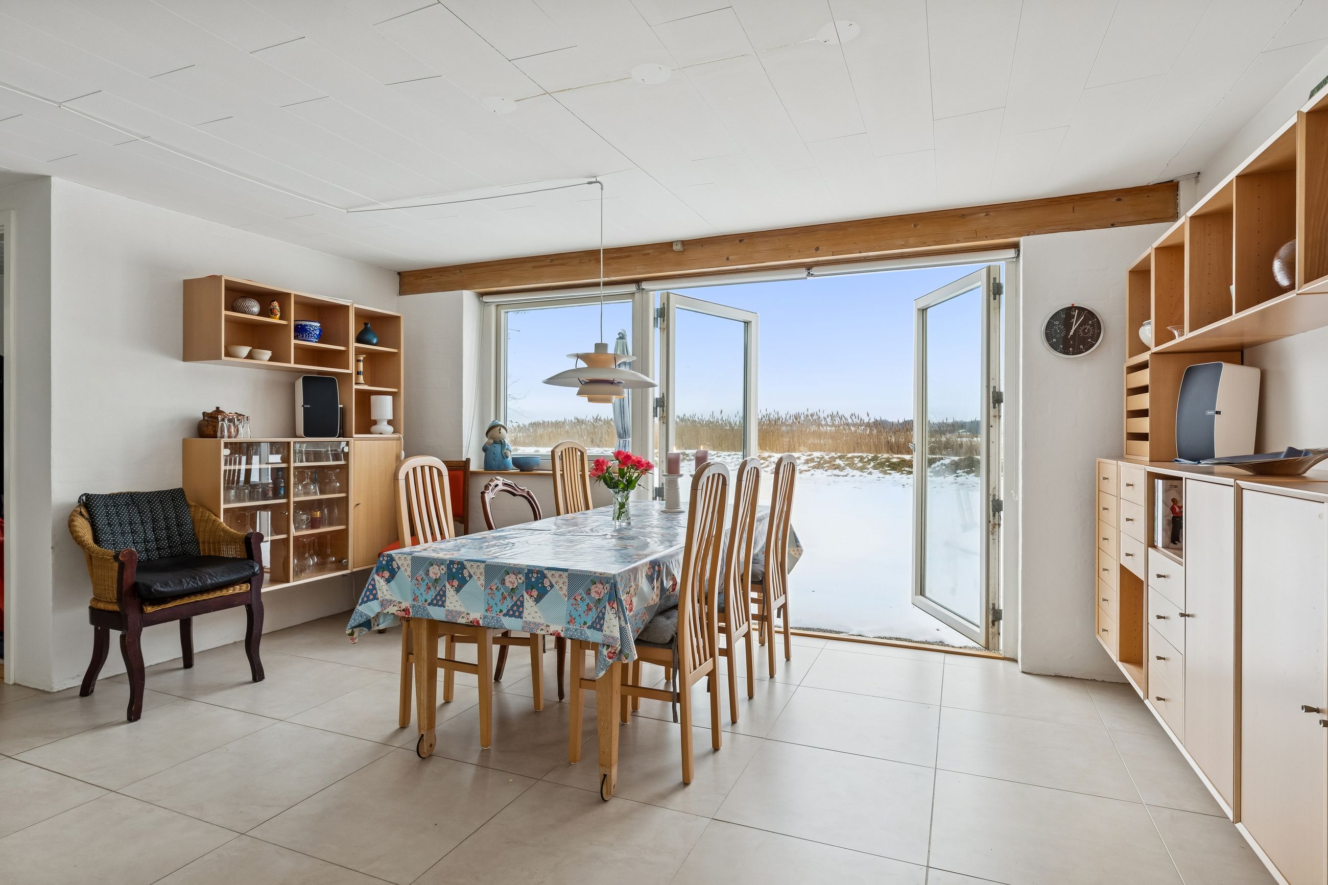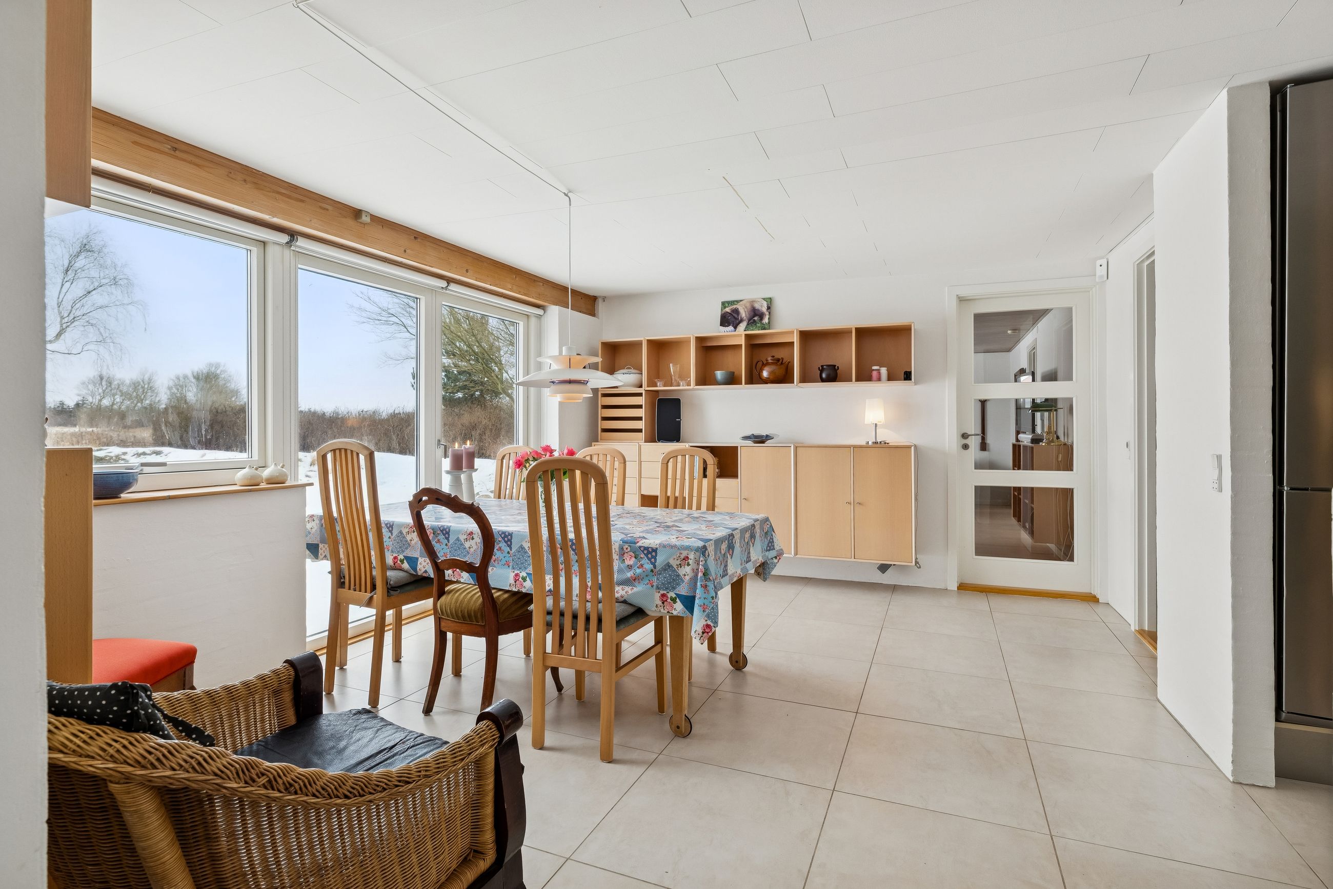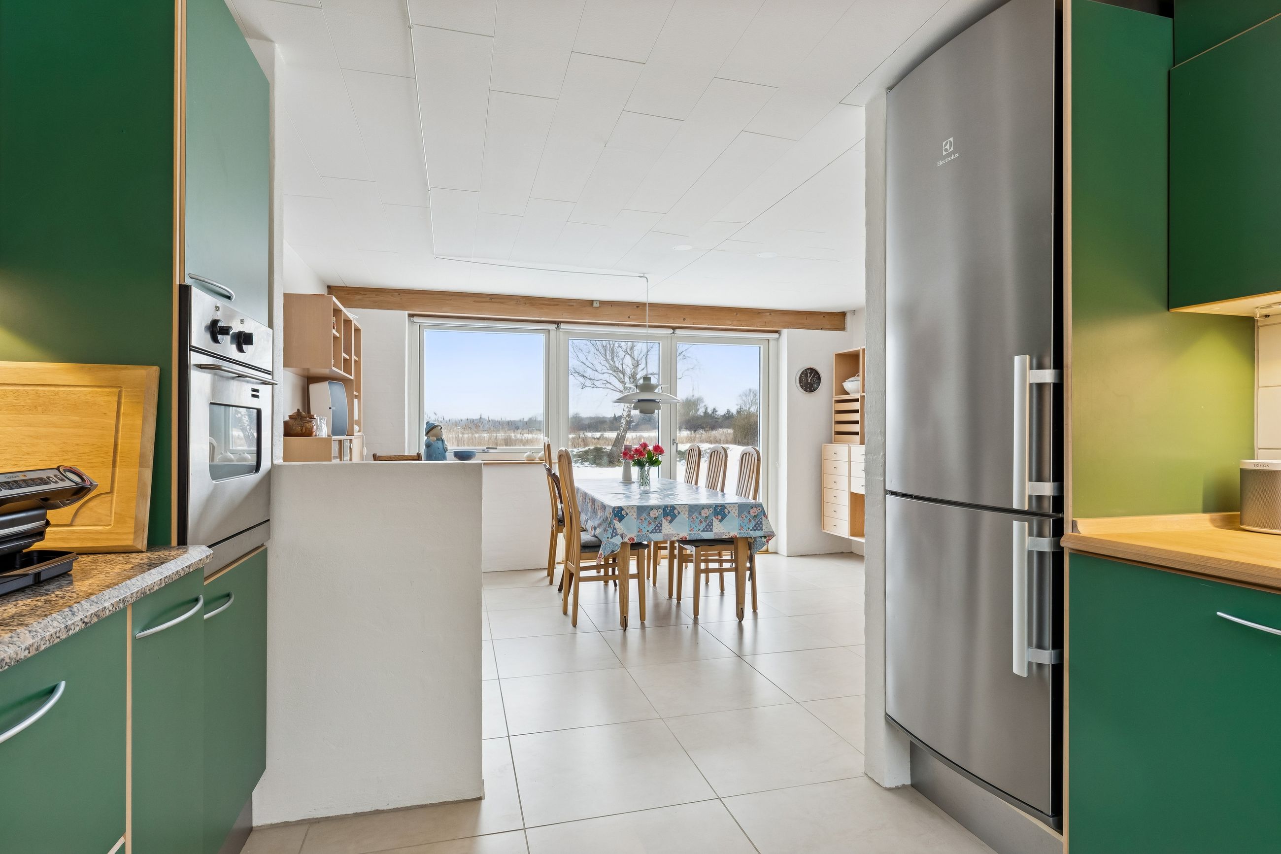 Det åbne køkken-alrum ligger i naturlig forbindelse med opholdsstuen og skaber et lyst og indbydende samlingspunkt. Herfra er der direkte udgang til terrasse og have, hvor udsigten over både marker og fjord virkelig kommer til sin ret og kan nydes året rundt.