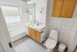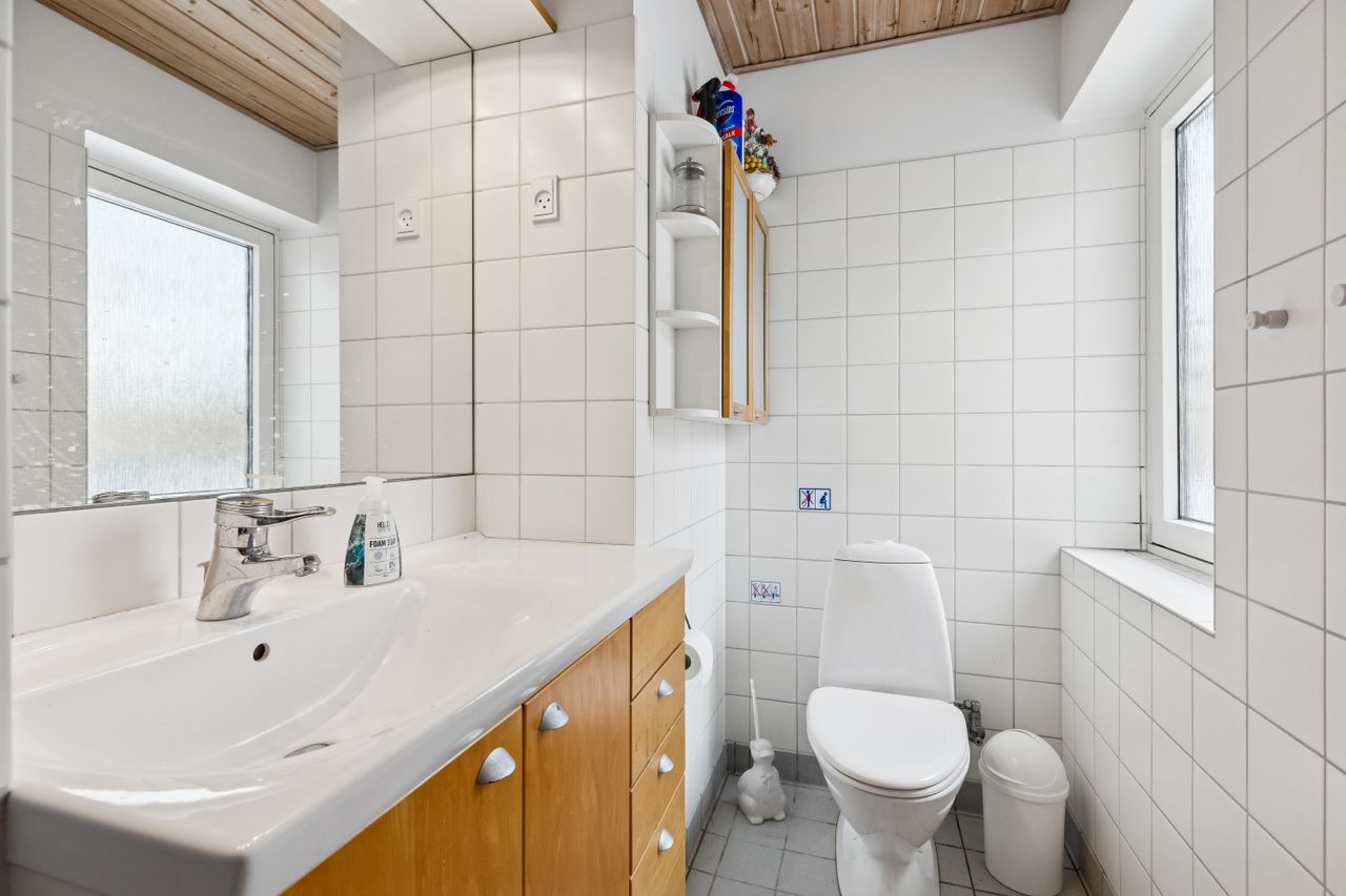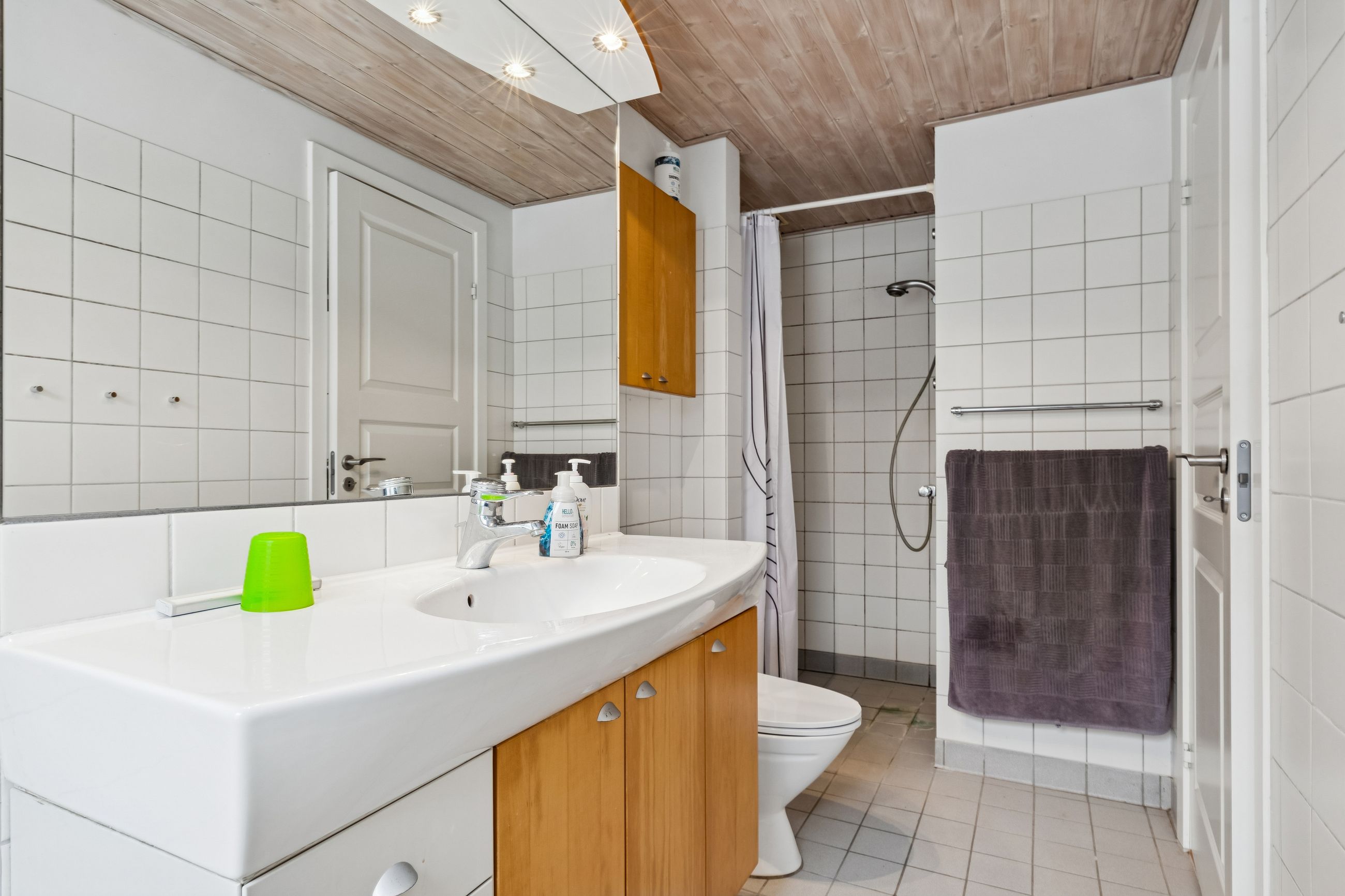 Boligen rummer 140 veldisponerede boligkvadratmeter og byder velkommen i en rummelig entré med god plads til overtøj og sko. Huset har hele to badeværelser i tidløst design, begge med separat bruseniche – ideelt til både familie og gæster.