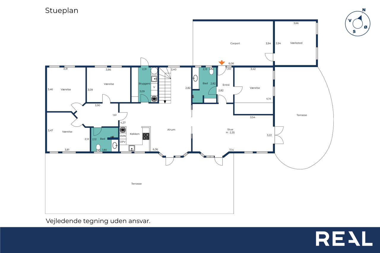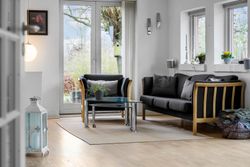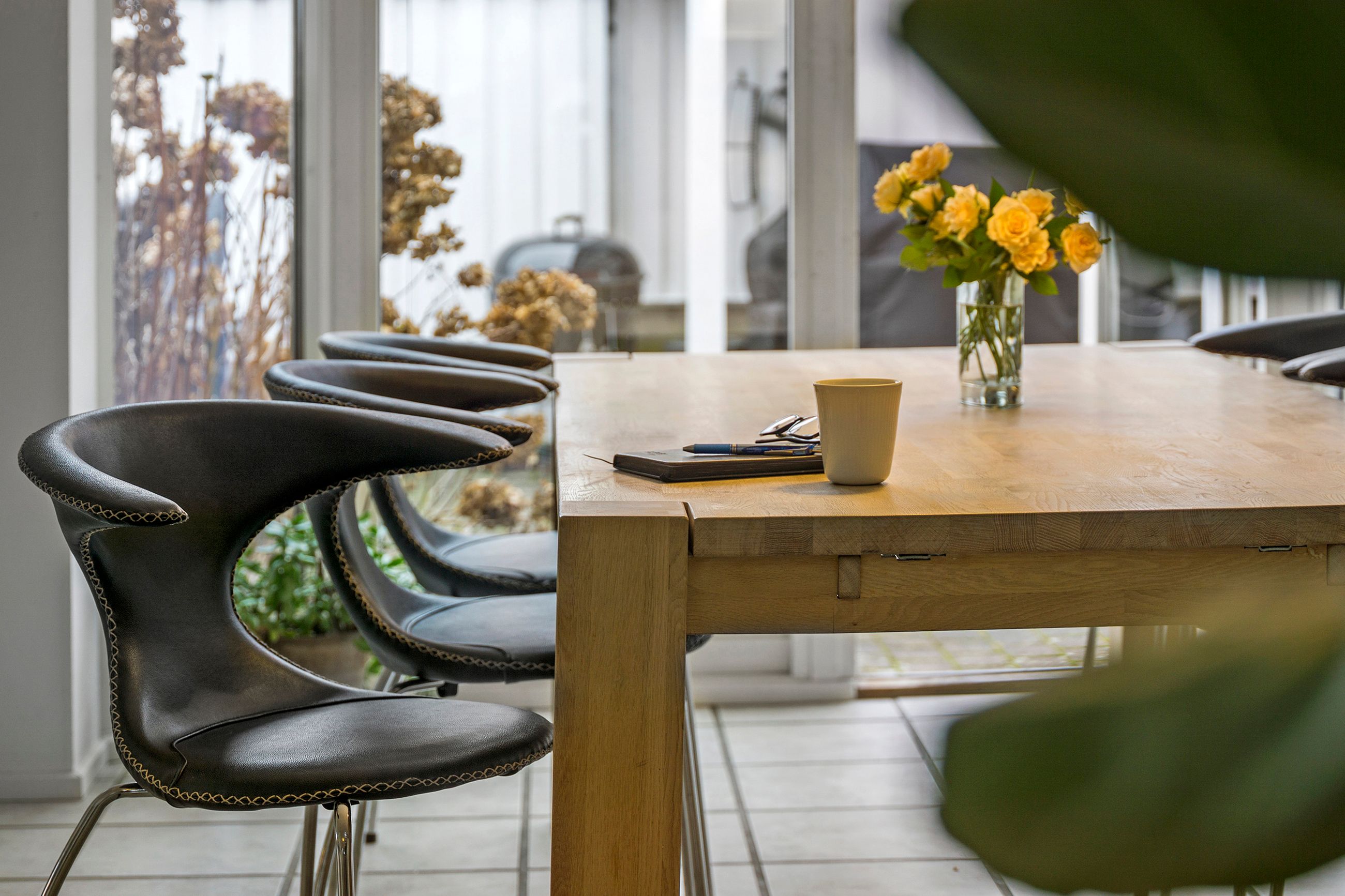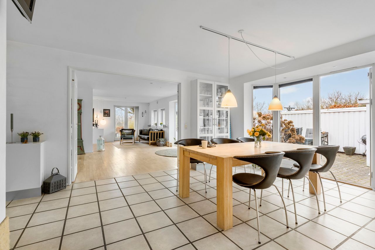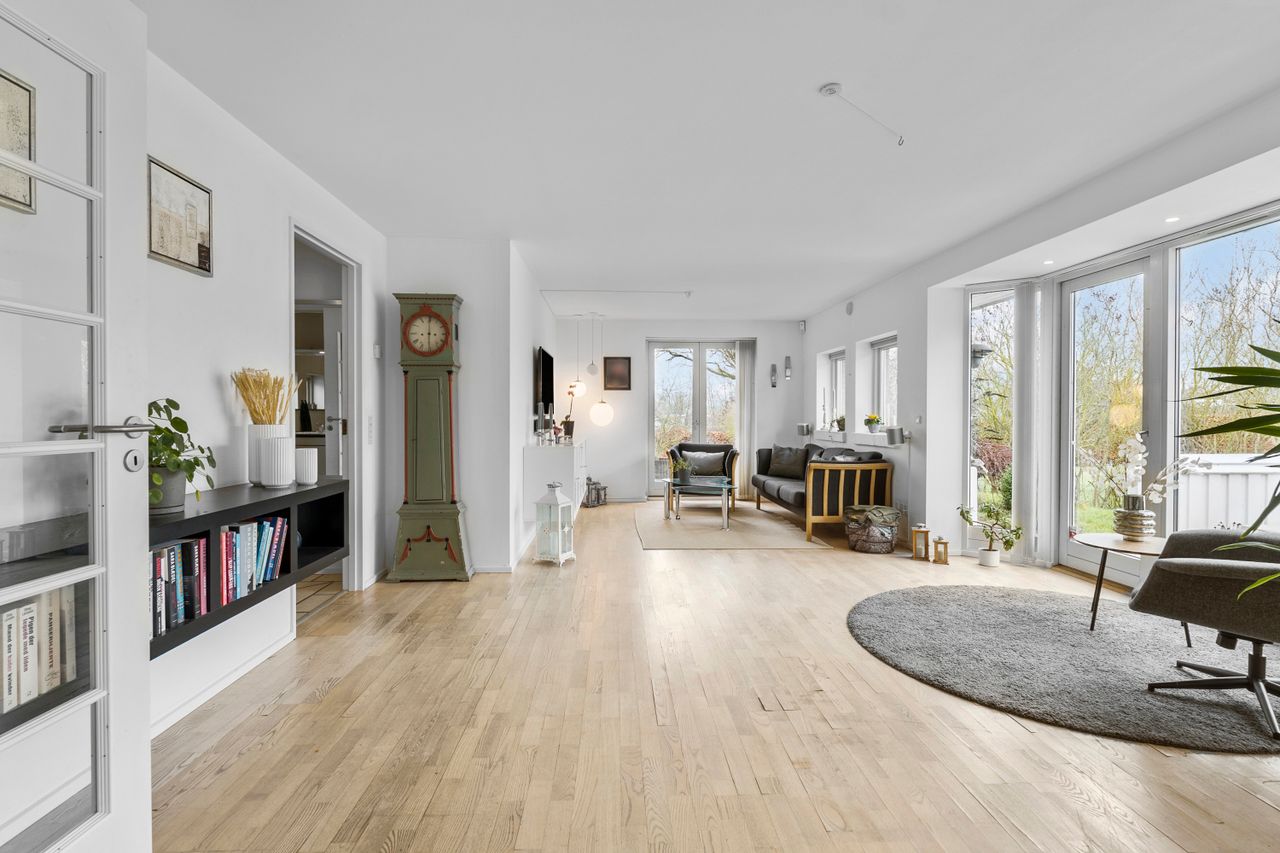 I stueplan er der både en børne- eller ungdomssektion med tre værelser og badeværelse og i den anden side af huset en forældreafdeling med soveværelse og bad. Midt i boligen ligger den rummelige opholdsafdeling med køkkenalrum og stue, der er forbundet af skydedøre, så I enten kan have det helt åbent, når der er mange gæster, eller lukket mere af, når der skal foregå forskellige aktiviteter. I begge opholdsrum er der store vinduespartier, der vender mod syd, så lysindfaldet i løbet af dagen er massivt, hvilket yderligere understøttes af karnapper i begge rum.