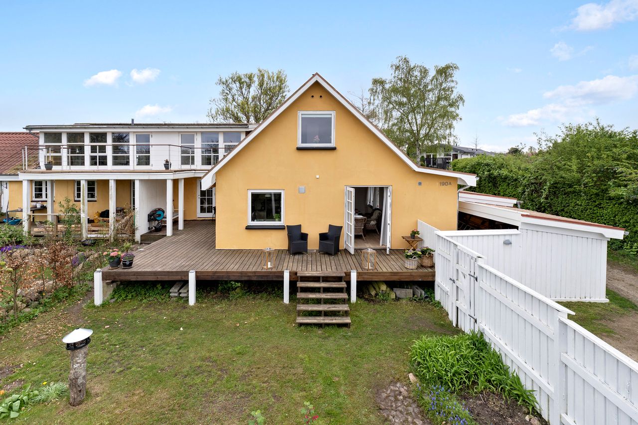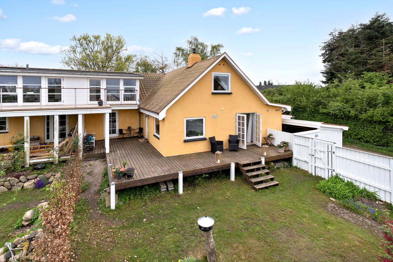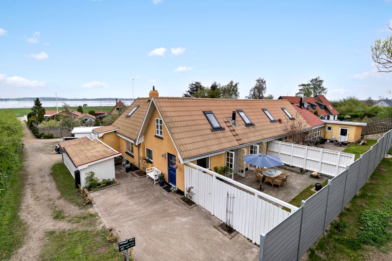 Beliggenheden er uden diskussion i topklasse, og selve huset byder på 196 kvadratmeter boligareal fordelt på et stueplan og en værelsesafdeling ovenpå med to fine værelser, en udsigtsaltan, hvor der er plads til at sidde og nyde kaffen ved et cafebord. Der er et stort soveværelse, også med en flot udsigt over fjorden. I stueplan er der fokus på de fælles opholdsrum, med køkken med gulvvarme og spisestue med direkte udgang til stor træterrasse. Den lyse sydvendte dagligstue kan åbnes helt op med to store dobbeltdøre ud til et solrigt, ugeneret gårdmiljø med flot stensat mur. Badeværelset ligger også i stueplan, ligesom I får en stor lys entré med god plads til både familien og til at modtage gæster.