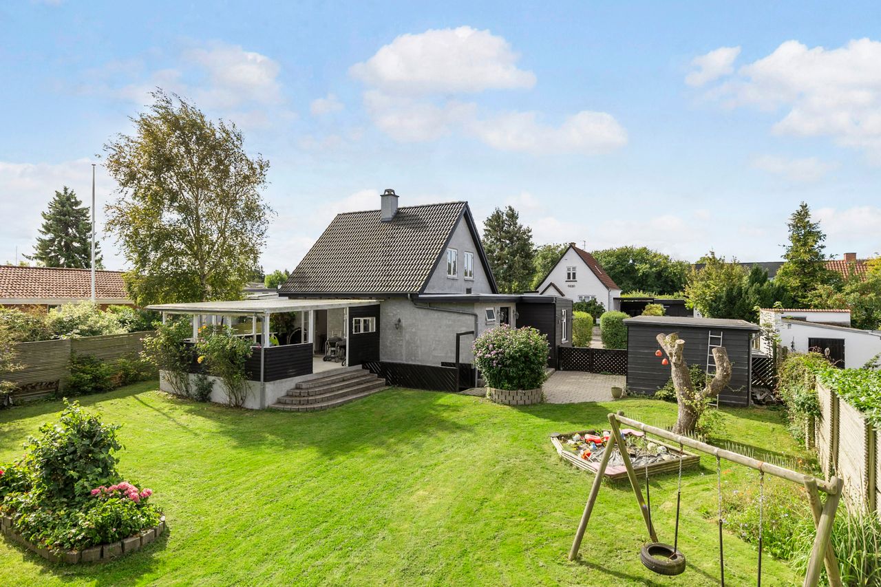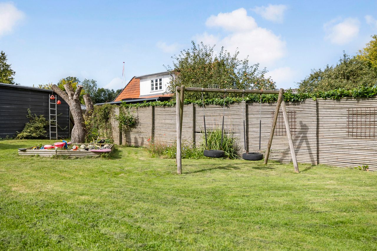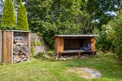Fra spisesektionen kan I træde direkte ud på den overdækkede terrasse med støbt bund. Her kan I nærmest bo om sommeren – også selvom vejrguderne ikke er med jer. Havens shelter er et andet hyggeligt uderum, som forlænger sommerperioden og nyder godt af solen fra formiddag til aften. Har I hund og små børn, kan de trygt løbe frit omkring, for haven er sikret med hegn hele vejen rundt – og med sandkassen og god plads til legeredskaber er det samtidig nemt at have det sjovt.