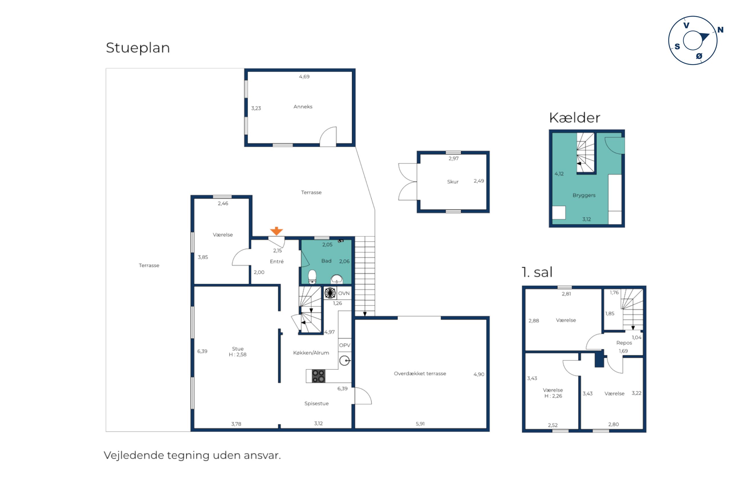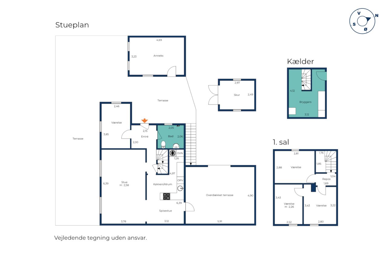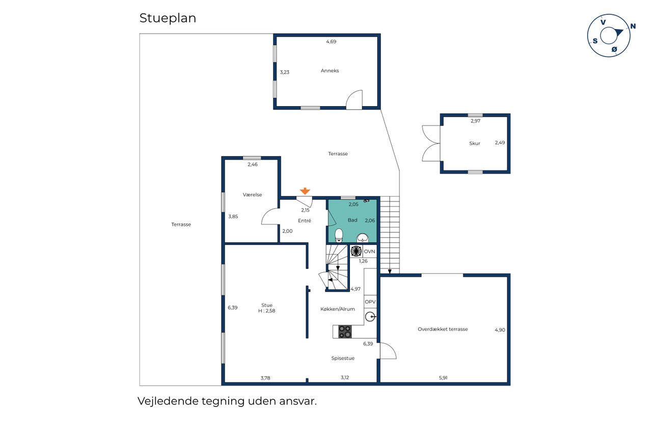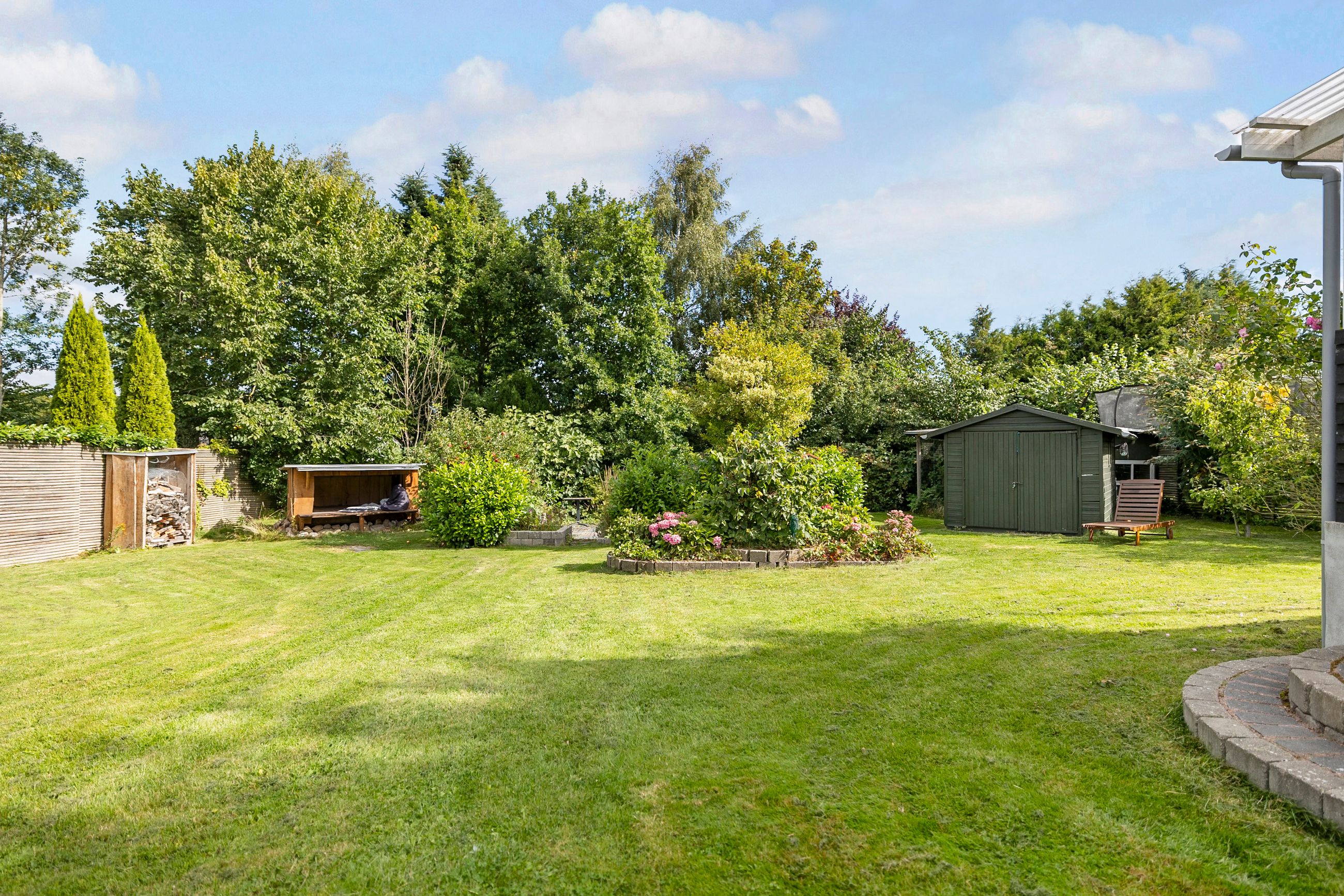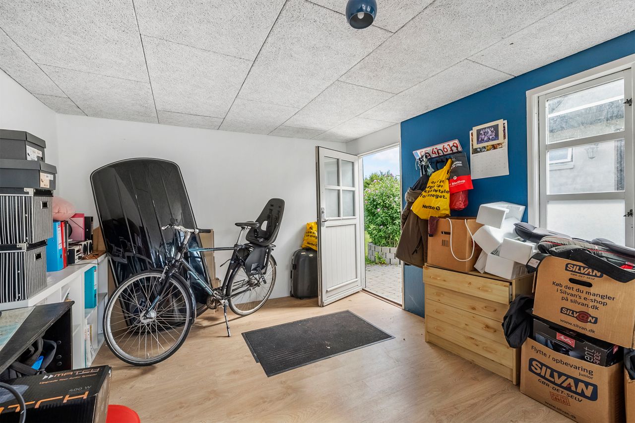 Vigtigt at nævne er også annekset med strøm, som har flere anvendelsesmuligheder. I kan eksempelvis indrette jer med en hjemmearbejdsplads, et hobbyrum eller lave et separat afsnit til teenageren, hvis I ikke vælger at bruge det til opbevaring. På grunden findes også et skur og en stor indkørsel med plads til flere parkerede biler.