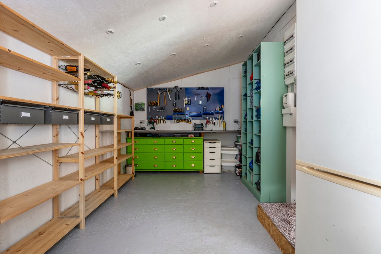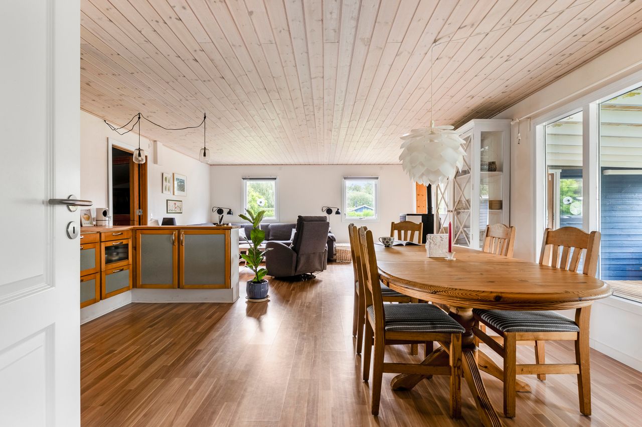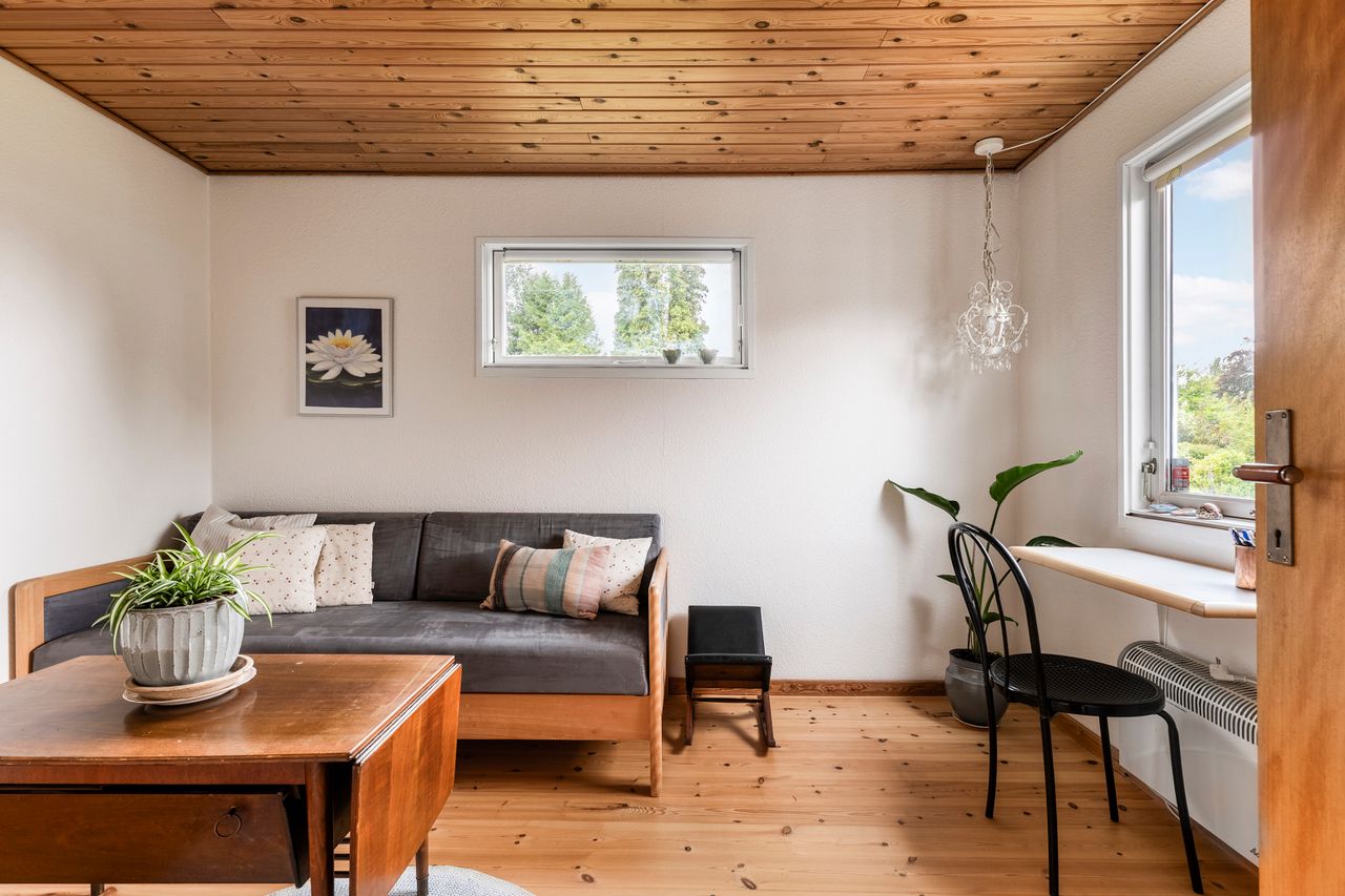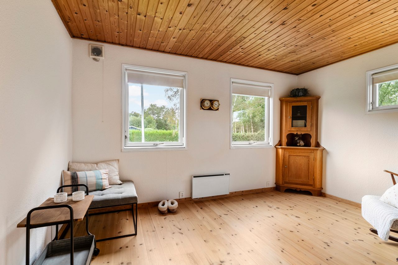 Siden nuværende ejer overtog huset for 26 år siden, er det vedligeholdt og udvidet ad flere omgange, så det i dag rummer 100 kvadratmeter. Udover de tre regulære soveværelser, hvoraf det ene har integreret walk-in-closet, får I et stort brusebadeværelse og et centralt placeret opholdsmiljø med stue og køkkenalrum i åben forbindelse. Herfra er der udgang til en rummelig udestue, der får lyset ind fra syd og vest, og til den anden side har I et kombineret værksted og bryggers.