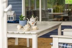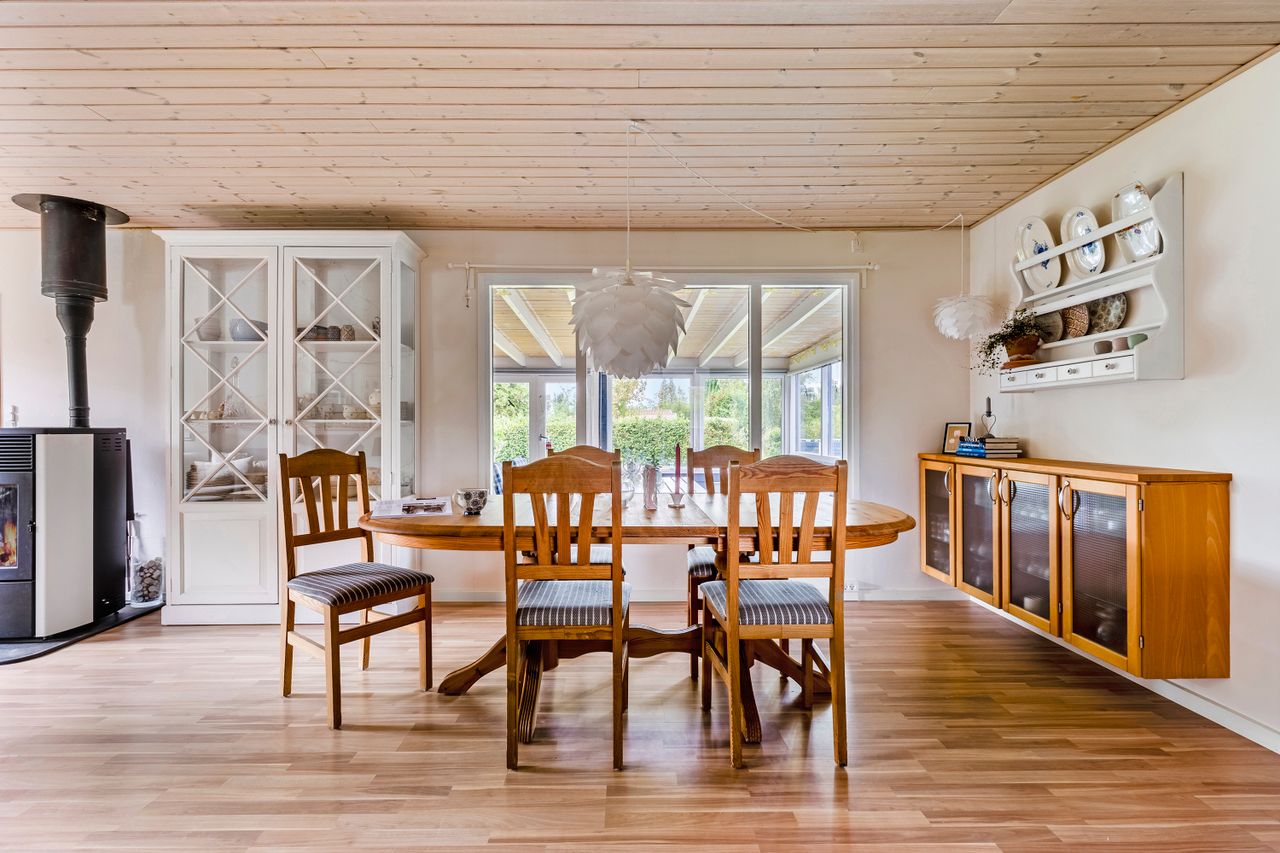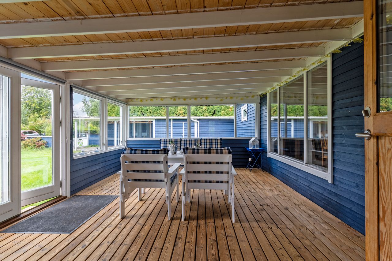 Udestuen er ideel til gråvejrsdagene og de sene sommeraftener, når duggen falder tungt, og da den samtidig er dejligt stor, er her rigeligt med plads til at kunne invitere venner og familie forbi til skønne middage og hyggelige weekendstunder.