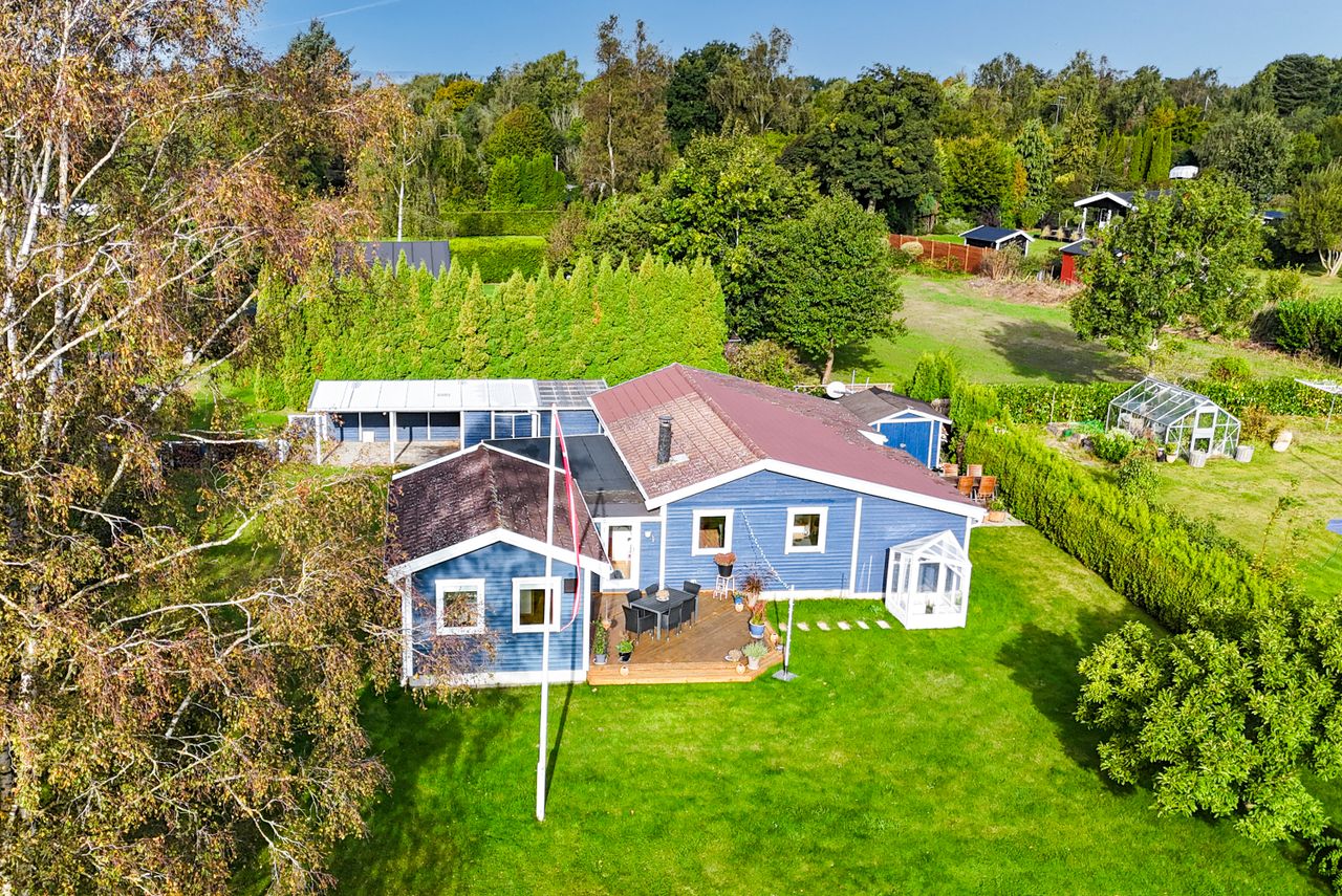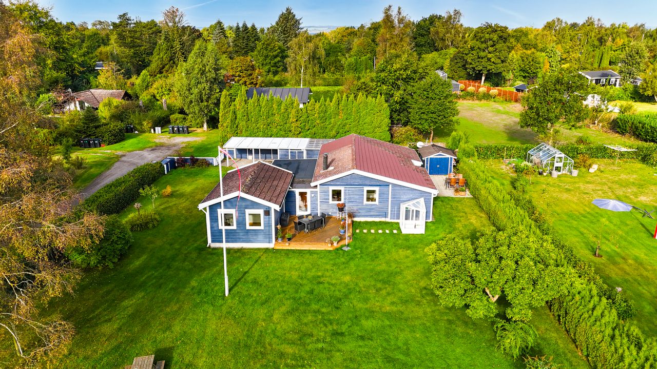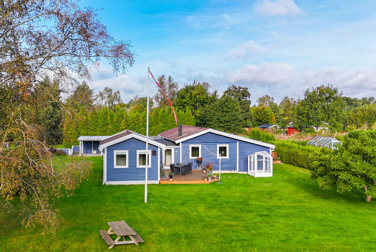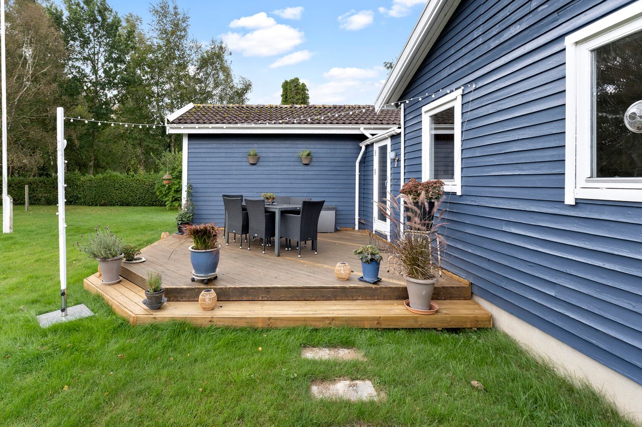 Det charmerende blå træhus ligger på en 1.204 kvadratmeter hjørnegrund med en stor græsplæne, enkel beplantning og en pænt opvokset hæk hele vejen rundt. Derudover får I en dejlig fliseterrasse og en lækker træterrasse, hvor der er rig mulighed for at få fyldt D-vitamindepoterne op, mens I nyder områdets særlige ro og udsigten til de smukke, grønne omgivelser.