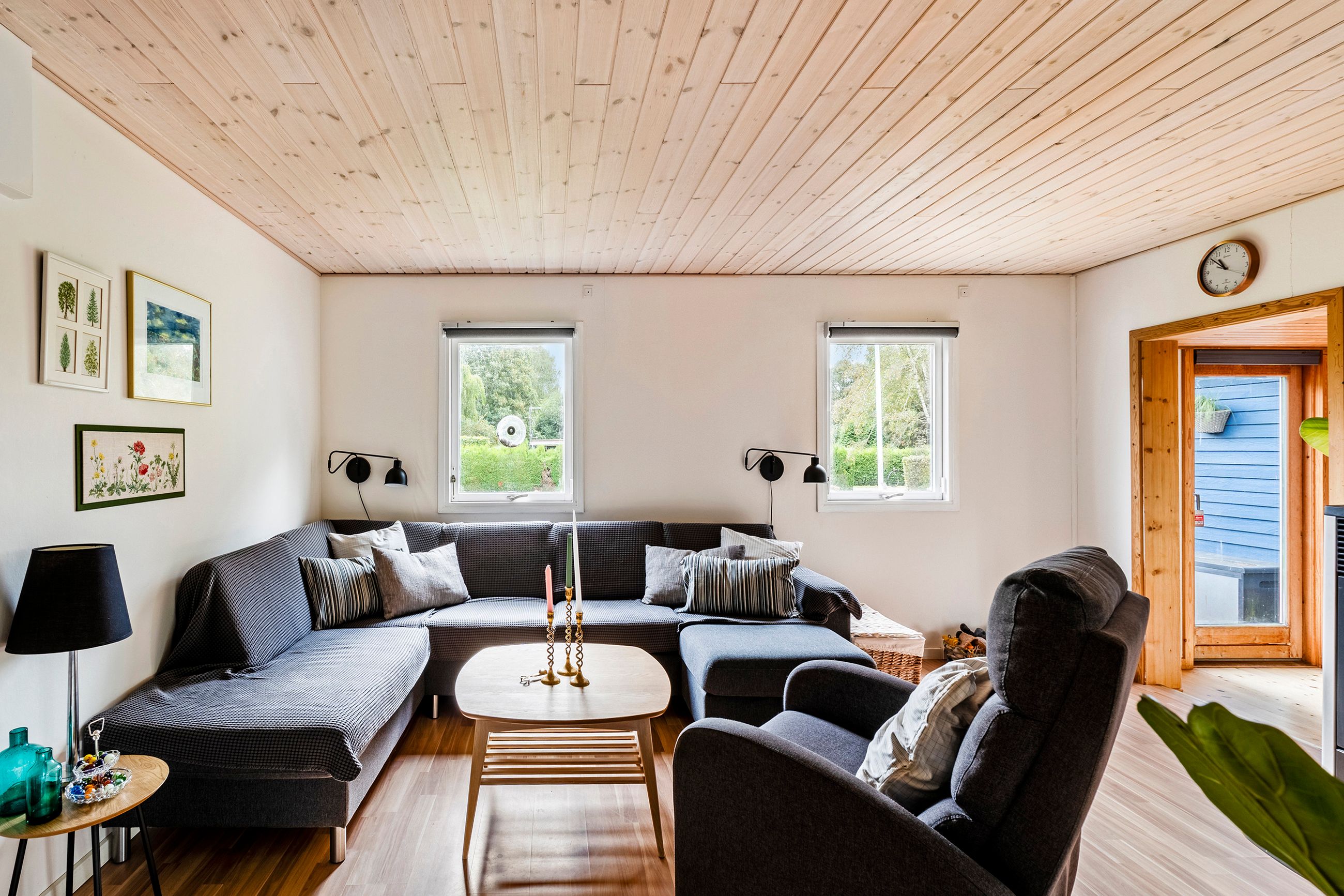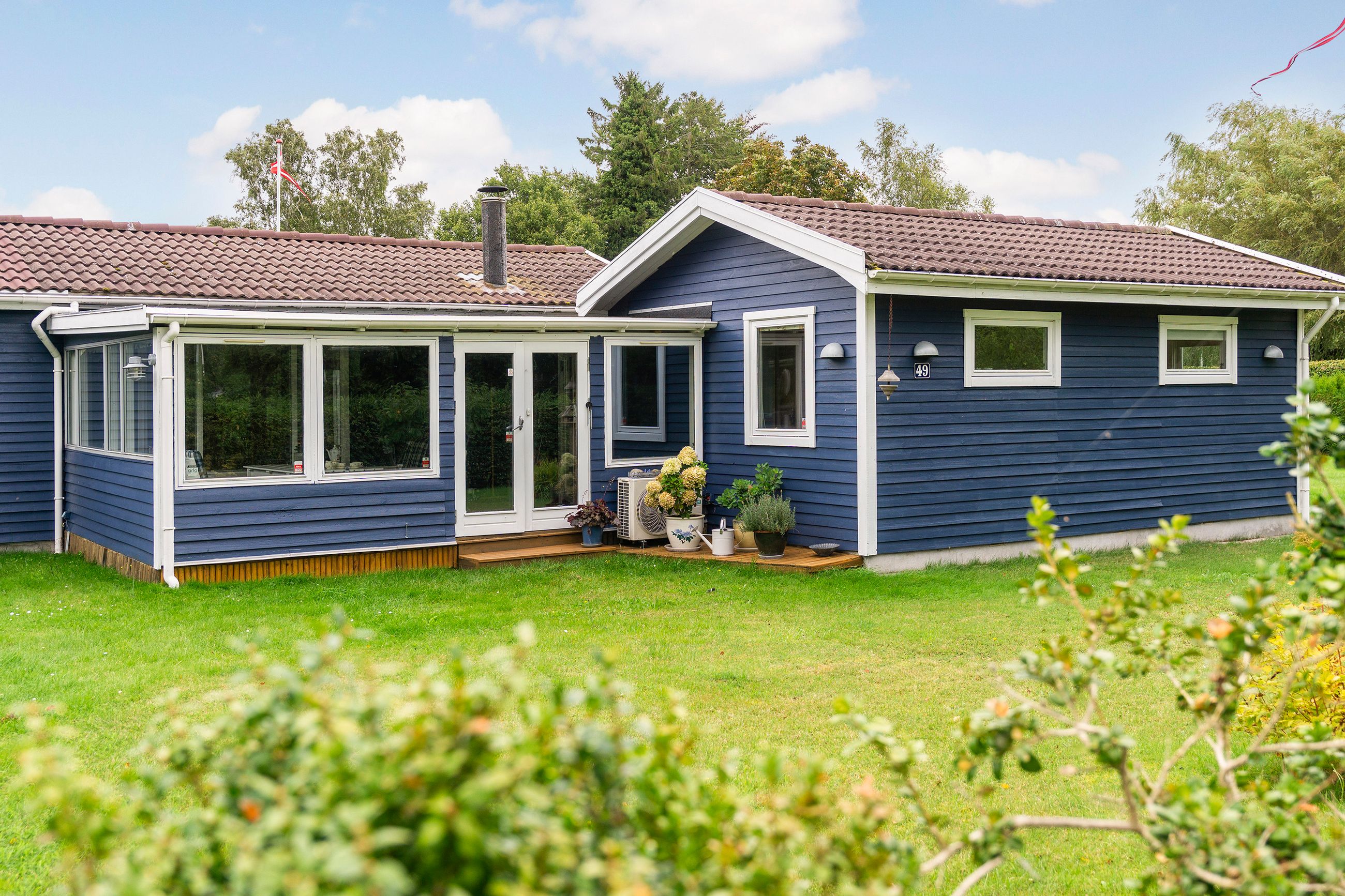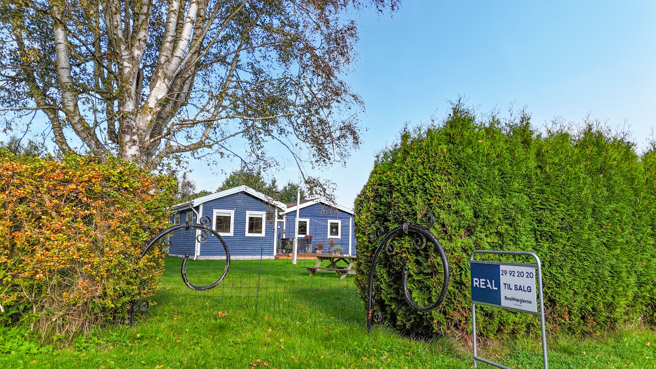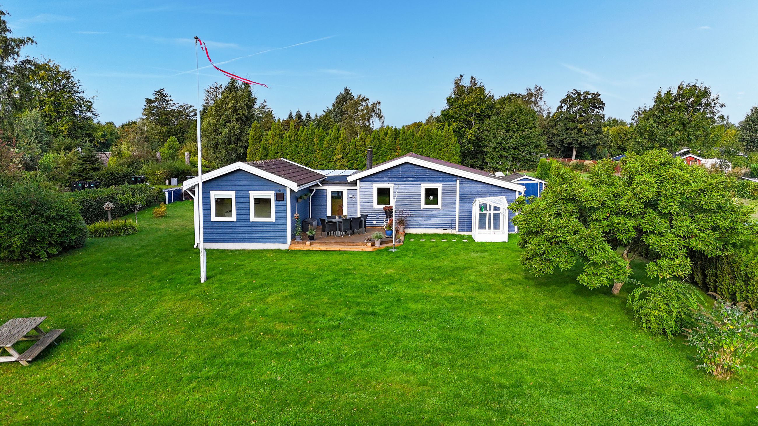 Det charmerende blå træhus ligger på en 1.204 kvadratmeter hjørnegrund med en stor græsplæne, enkel beplantning og en pænt opvokset hæk hele vejen rundt. Derudover får I en dejlig fliseterrasse og en lækker træterrasse, hvor der er rig mulighed for at få fyldt D-vitamindepoterne op, mens I nyder områdets særlige ro og udsigten til de smukke, grønne omgivelser.