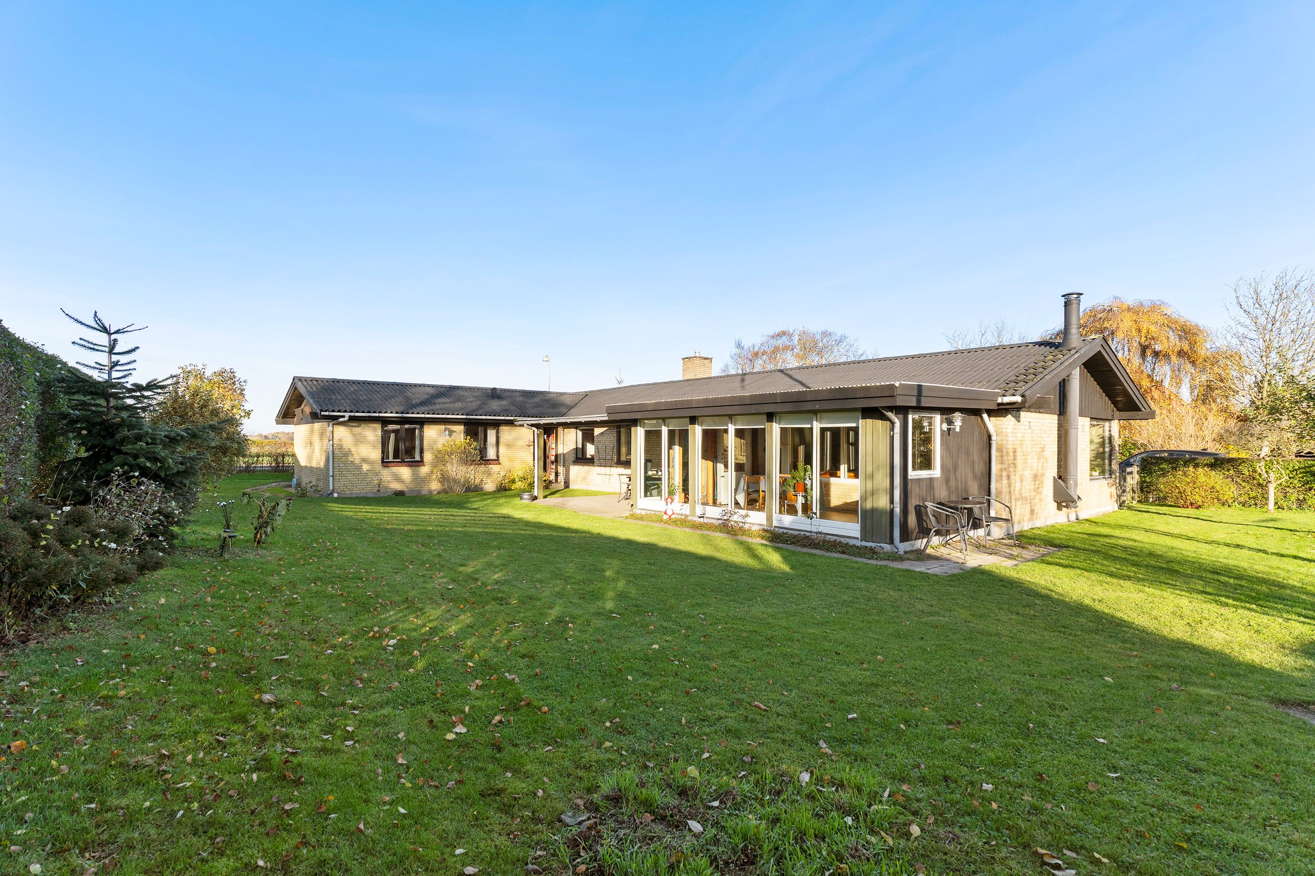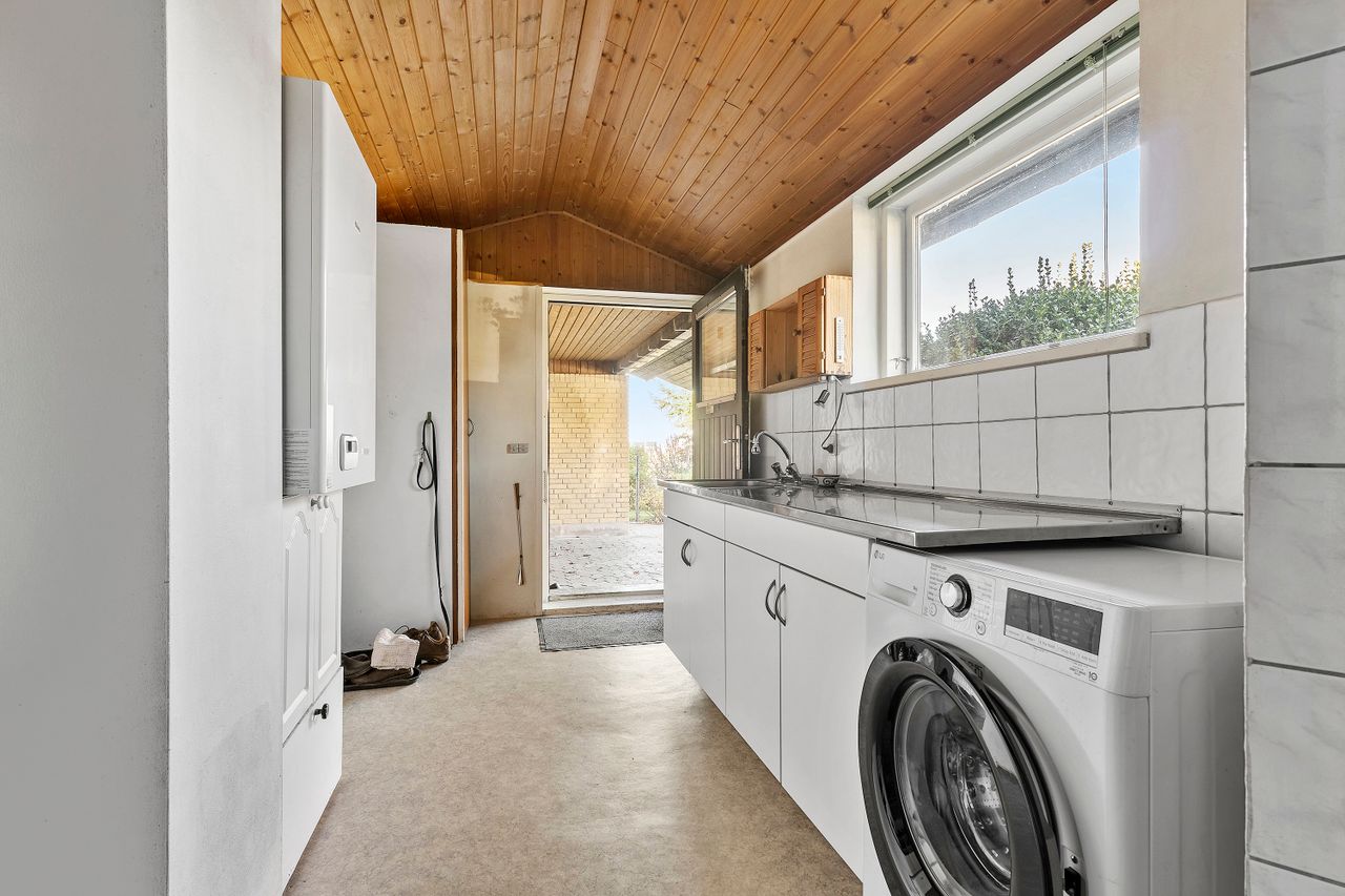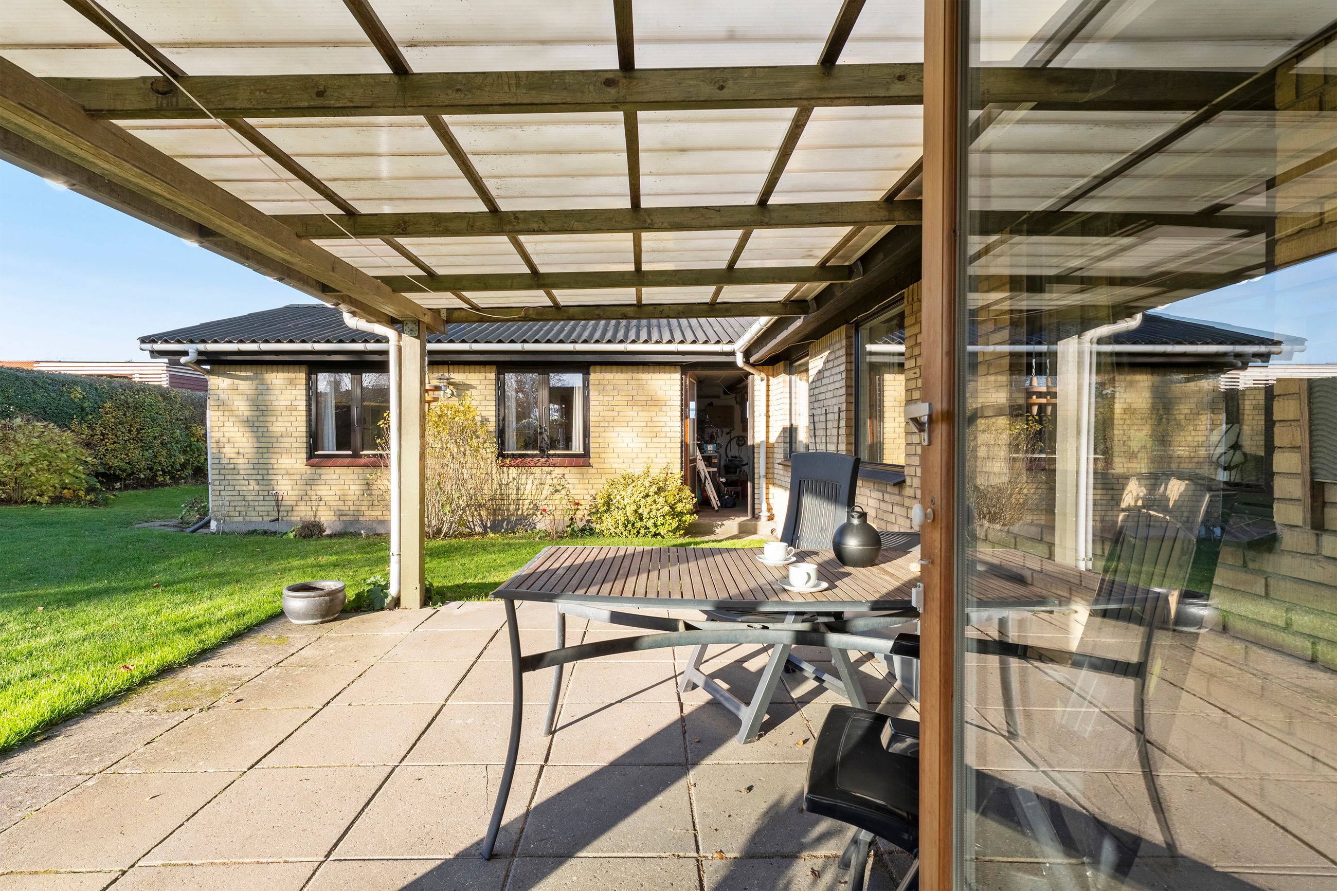 Muligheder er der også i haven, der er enkel og legevenlig med græs i det meste. Samtidig er den fint lukket af med hæk og hegn, så hunde og små børn trygt kan løbe frit omkring. Mod vest, i direkte forlængelse af udestuen, har I desuden en overdækket terrasse, hvor I kan nyde de lune sommeraftener.