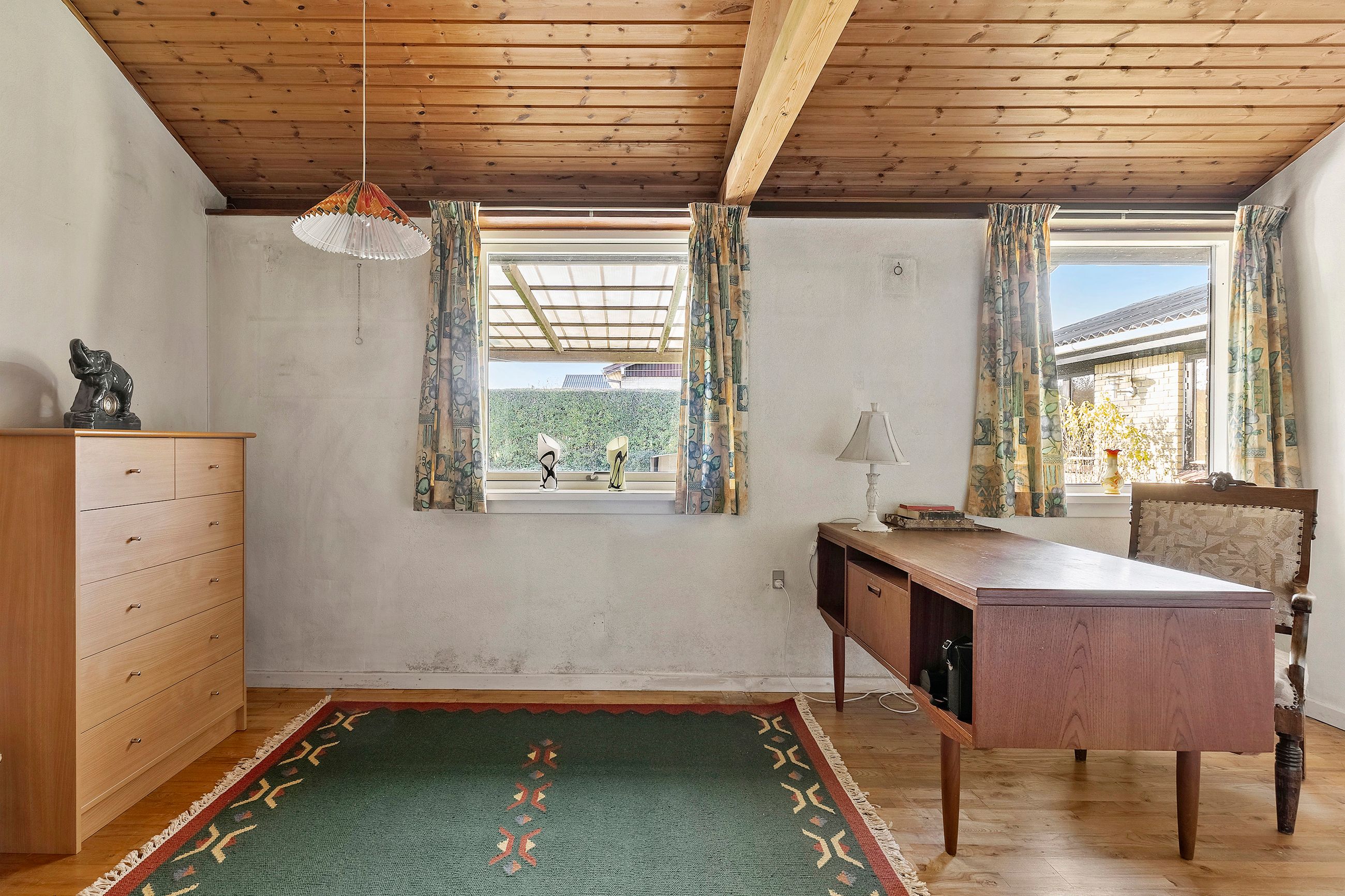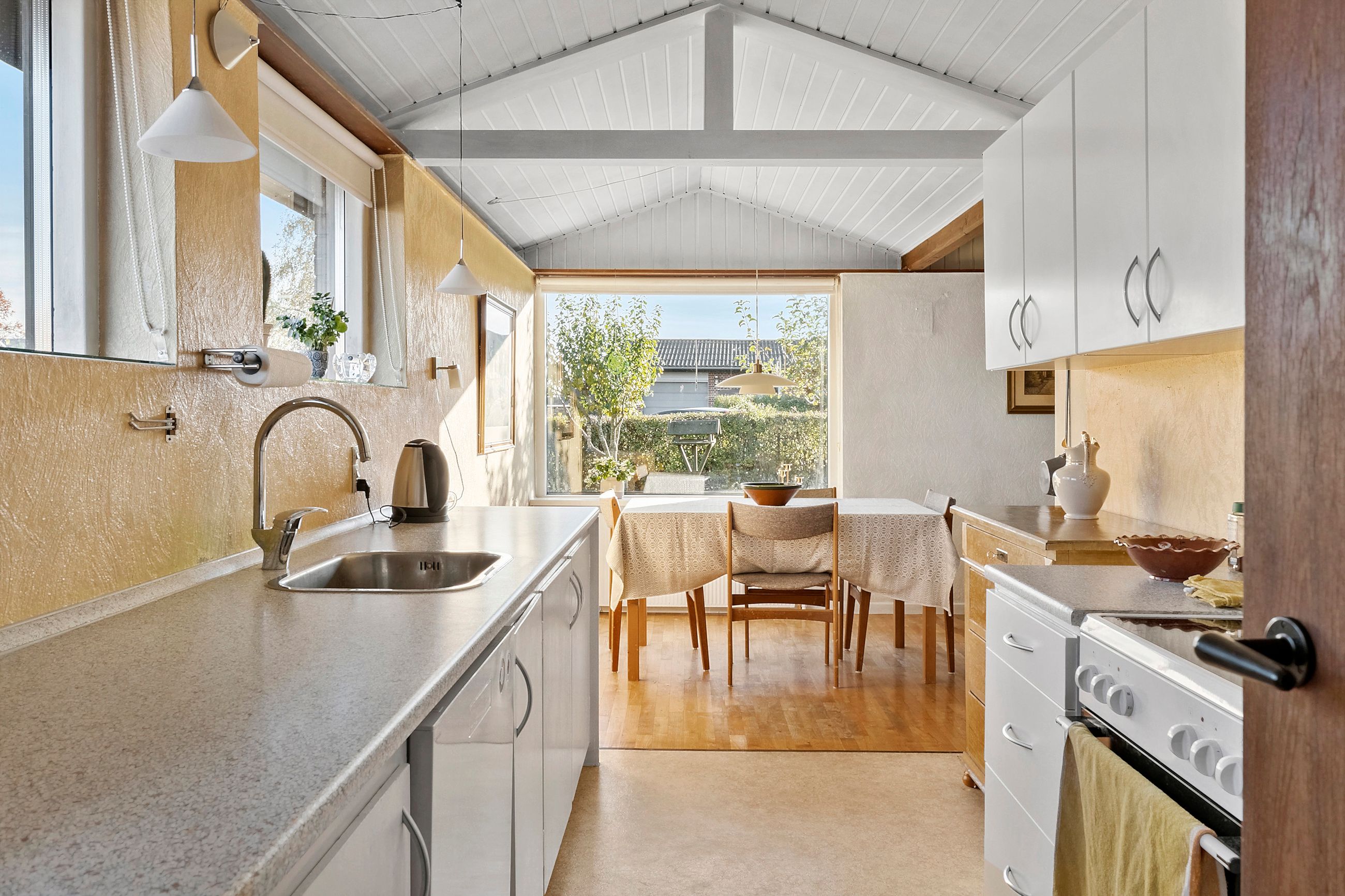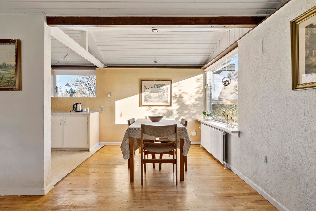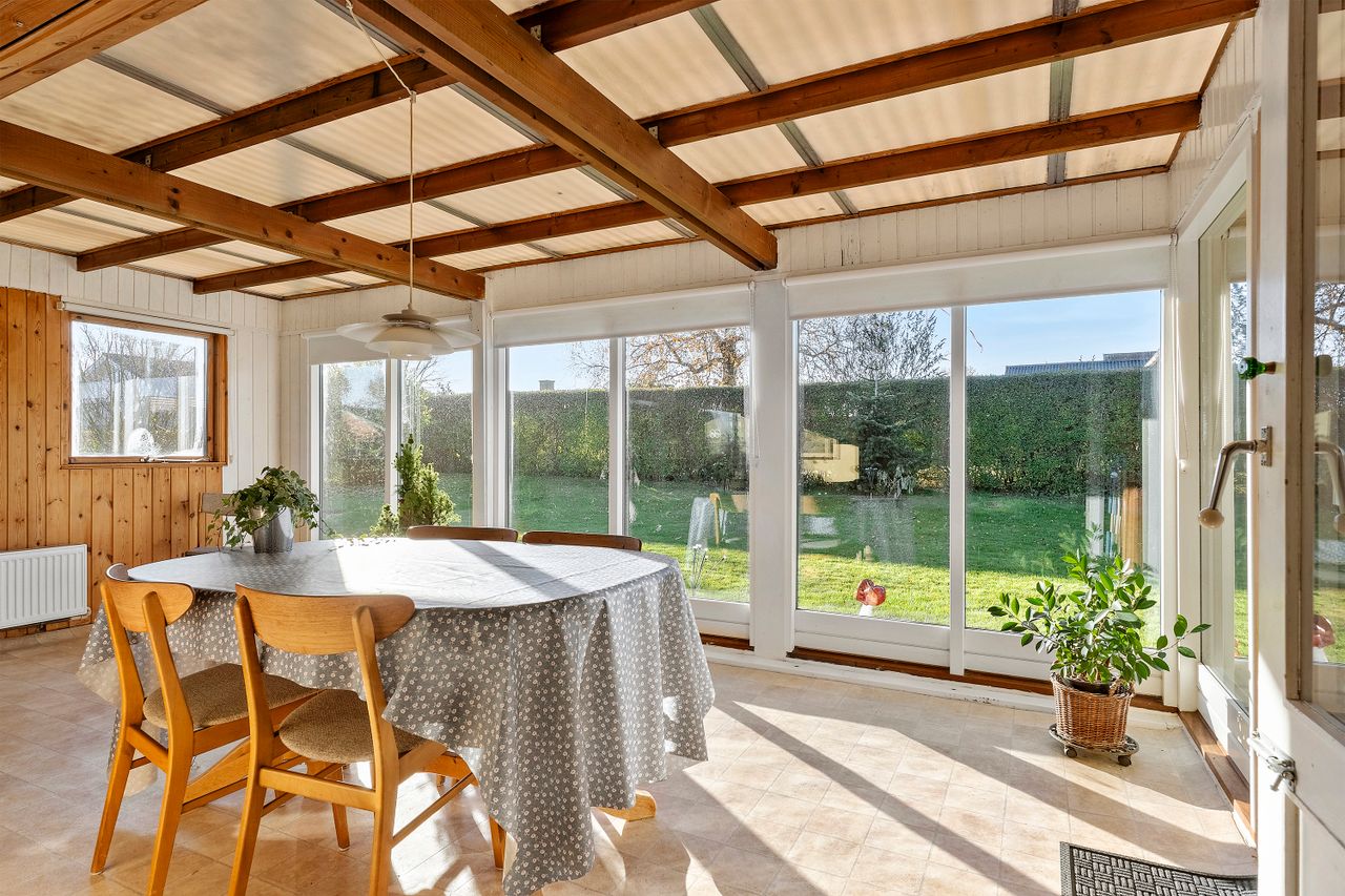 Gulstensvillaen blev opført i 1963, mens tilbygningen er fra 1979, og tilsammen giver det jer 140 kvadratmeter bolig til fri disposition. Dertil kommer garagen og en lækkert lys udestue mod vest, der forlænger sæsonen på begge sider af sommeren. Boligen er velfungerende, men da standen er overvejende original, vil I formentlig give huset et løft, inden I flytter ind. Det åbner samtidig mulighed for at være kreative med stilen og indretningen, der til punkt og prikke kan tilpasses jeres egne ideer.