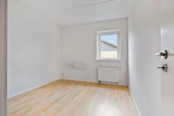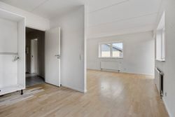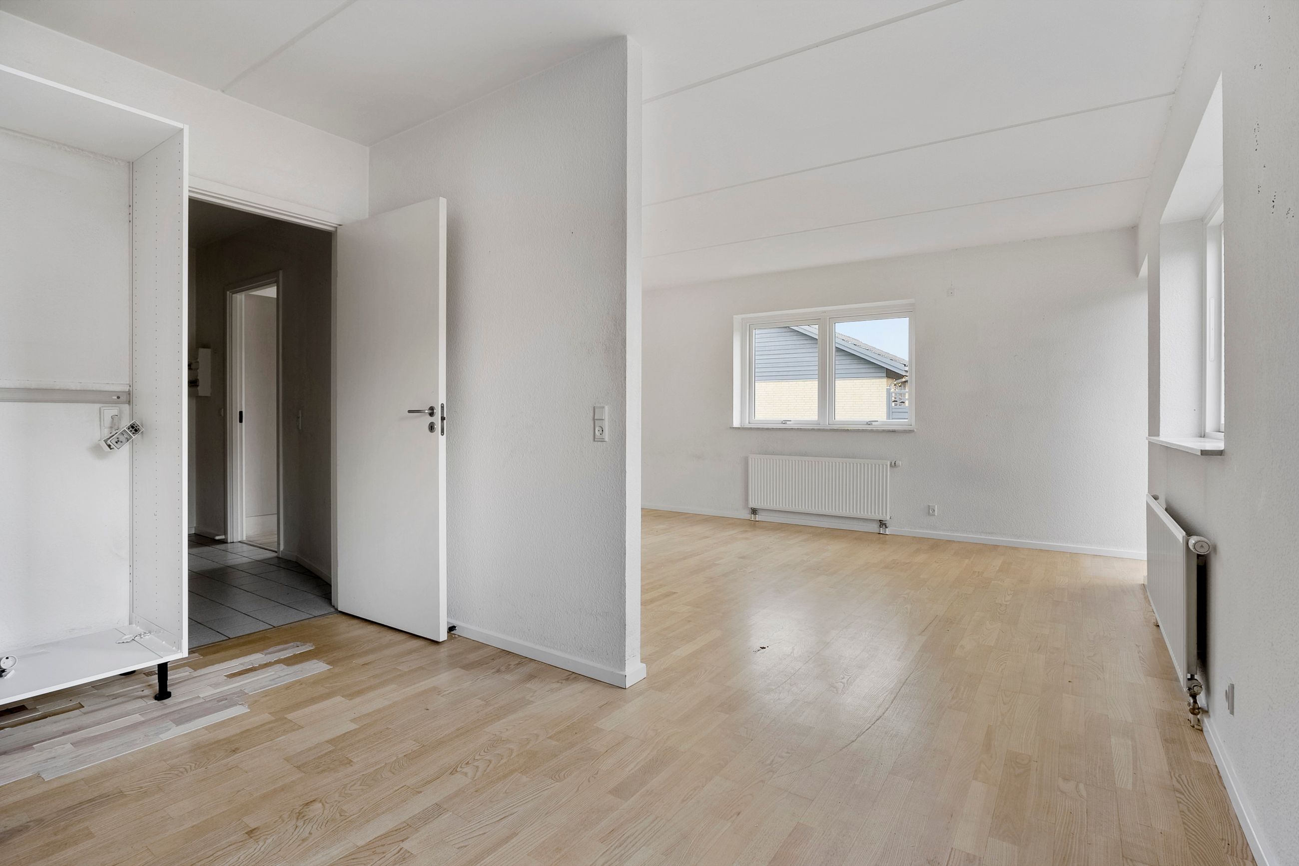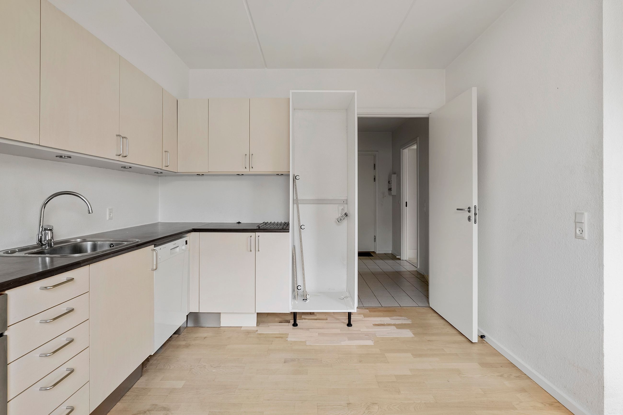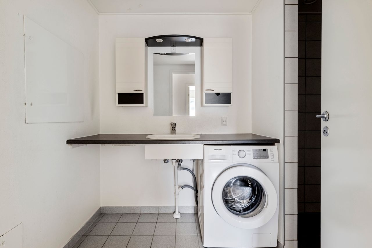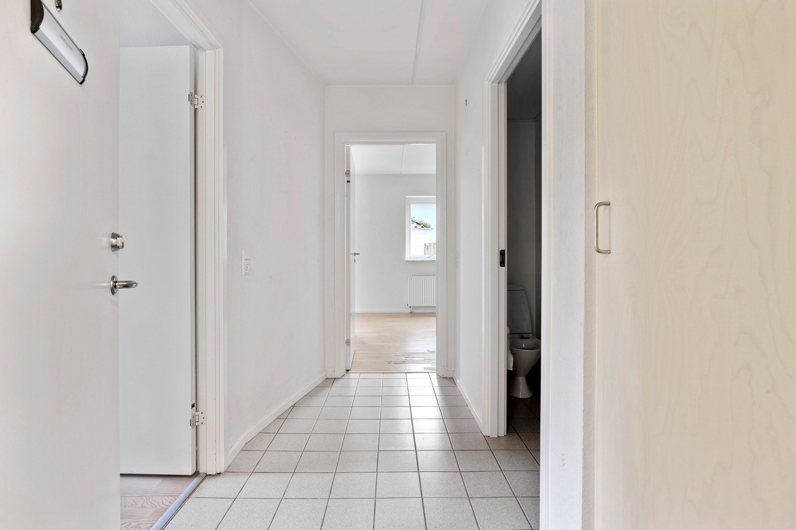 Badeværelset ligger praktisk ved entréen og tæt på både soveværelse og stue. Lejligheden er lige til at gå til og kræver blot slibning af gulvene og en frisk maling, før den er klar til indflytning.